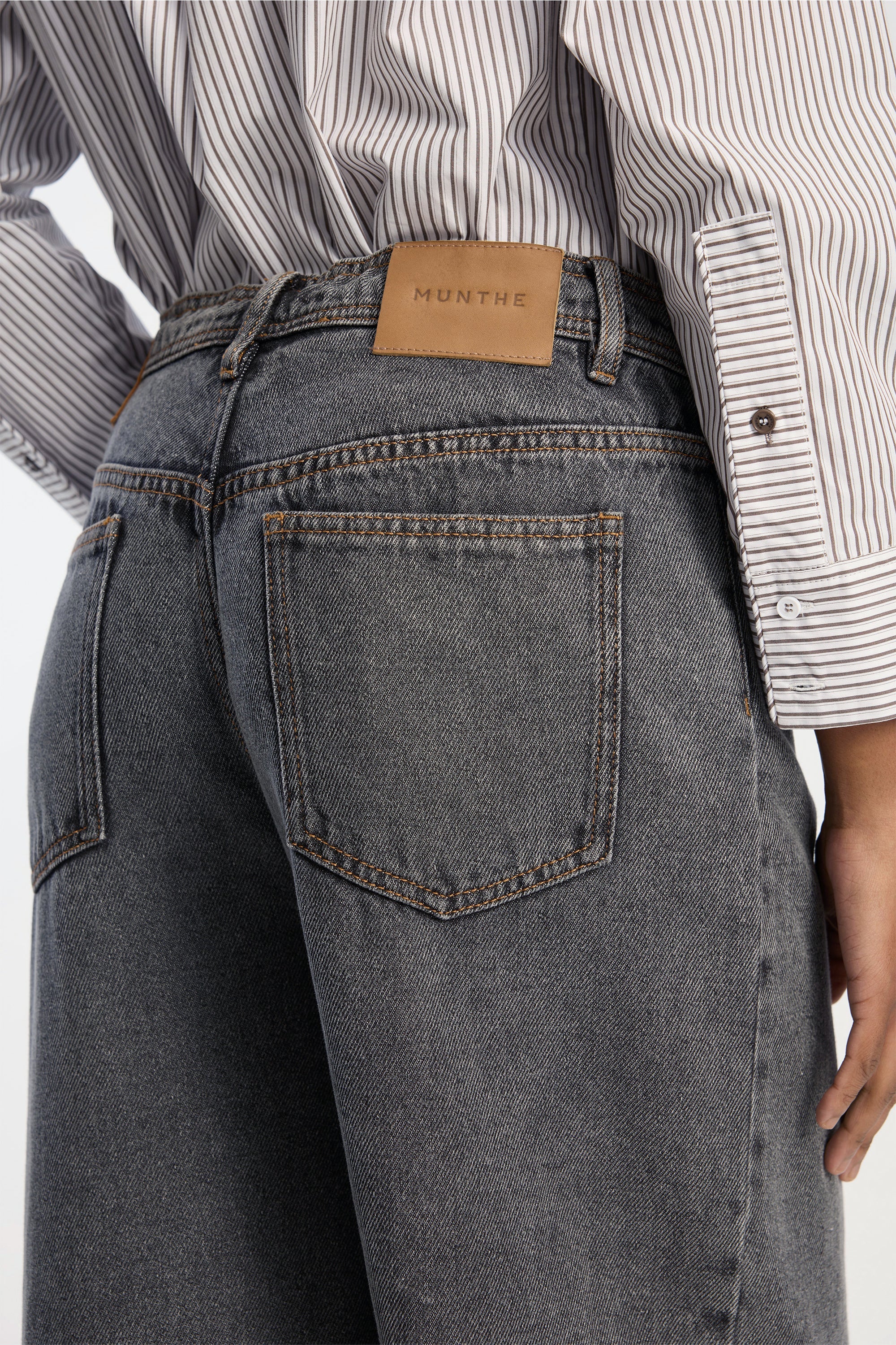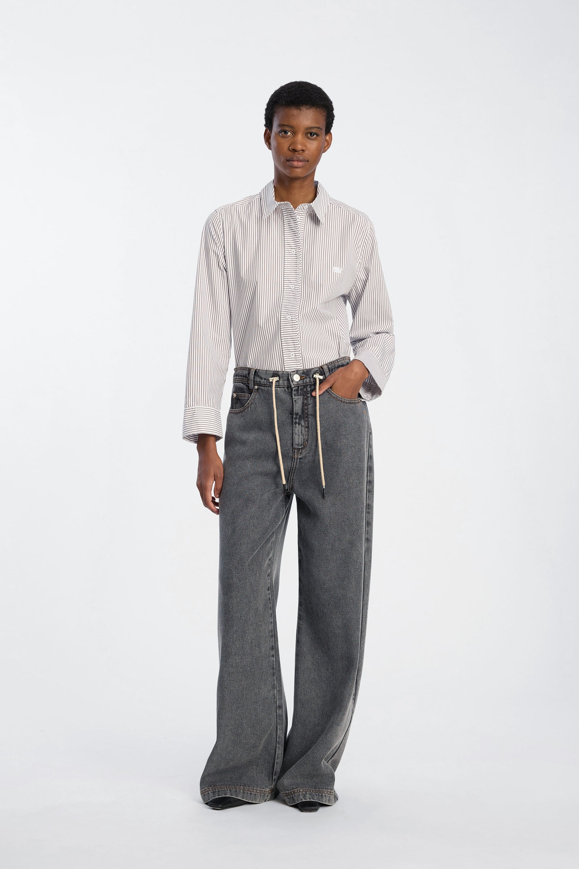 Grey jeans, designed with an elegant tie string detail at the waist. These pants have a loose fit, wide legs, and front and back pockets.