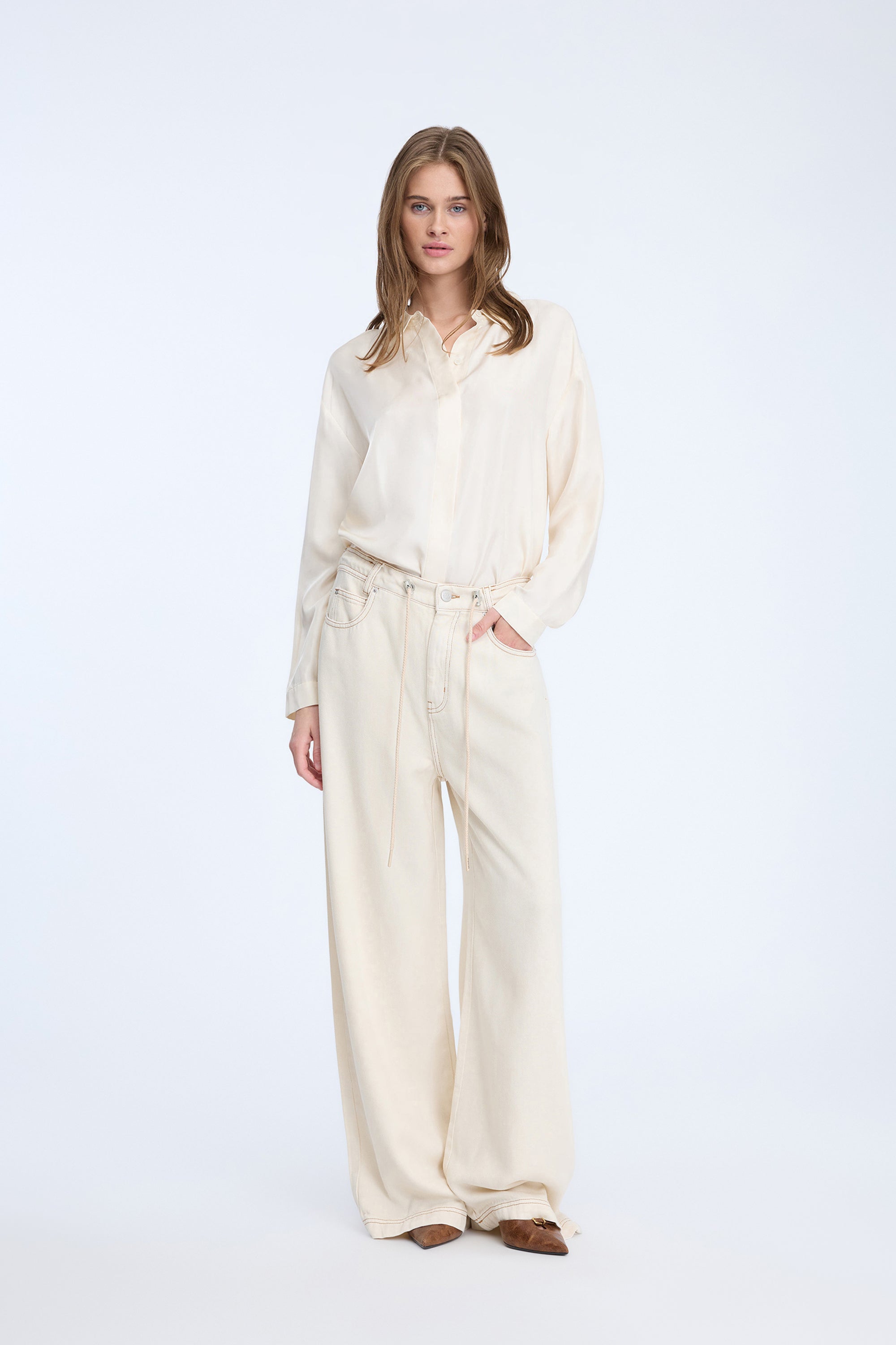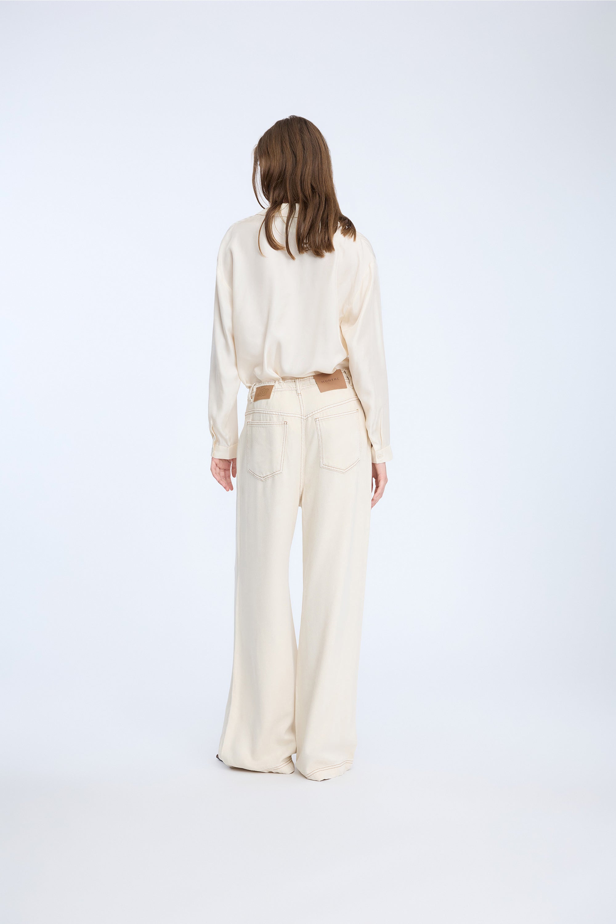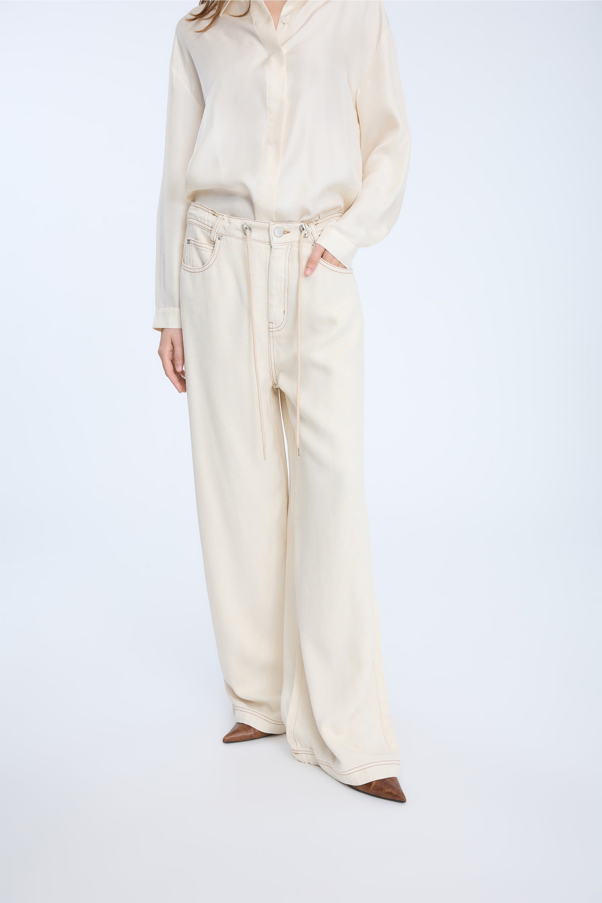 Jeans designed with an elegant tie string detail at the waist. These pants have a loose fit, wide legs, and front and back pockets.