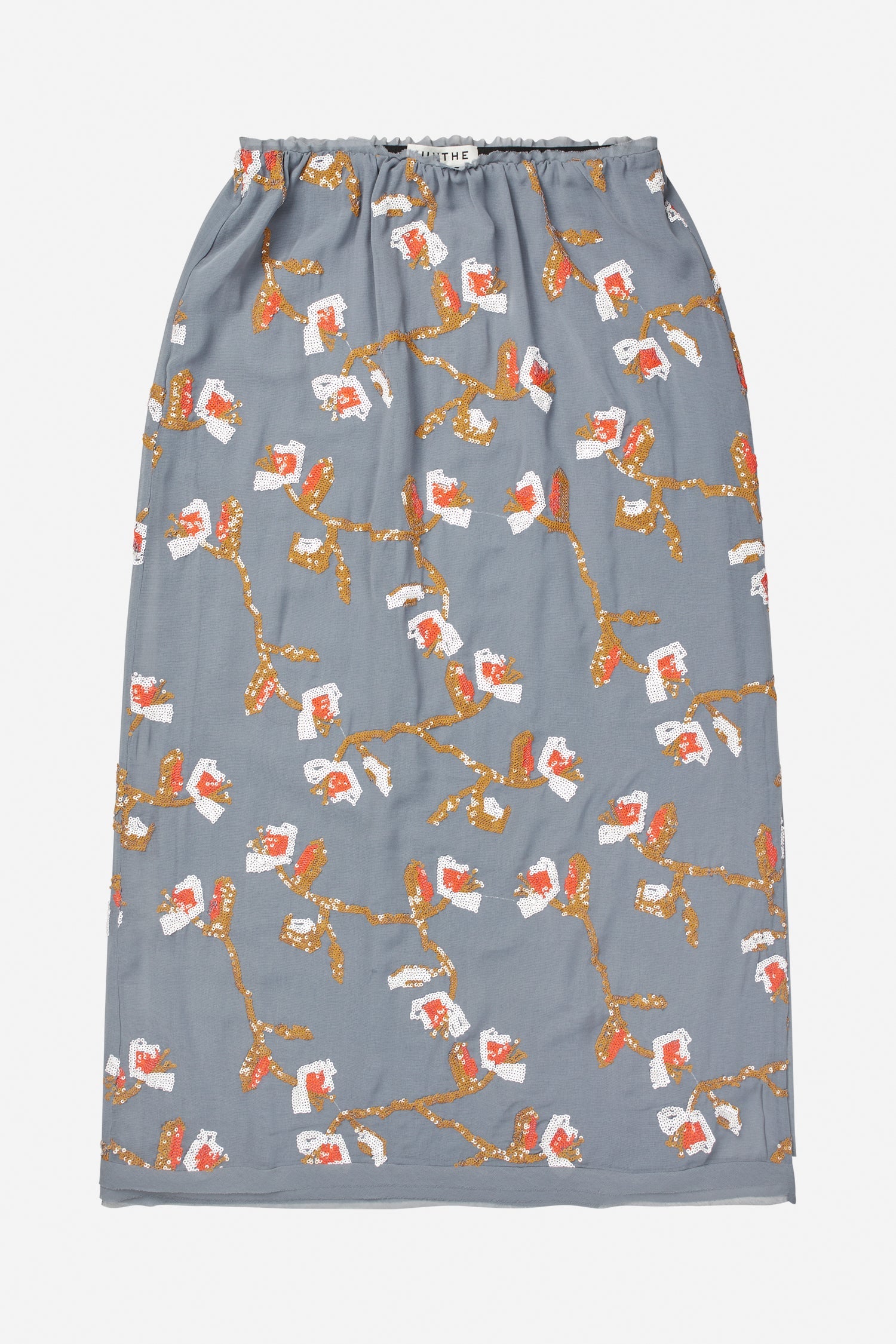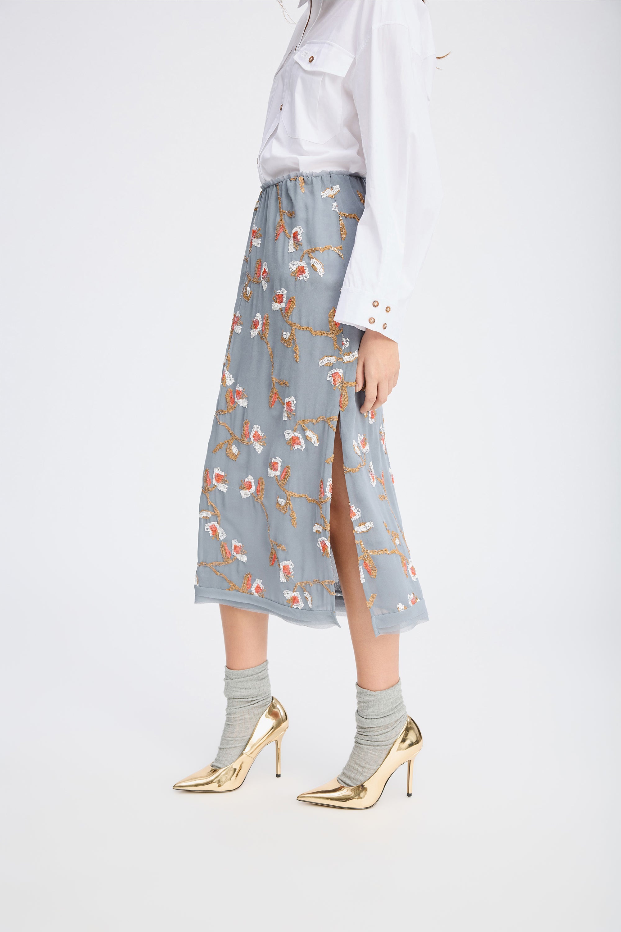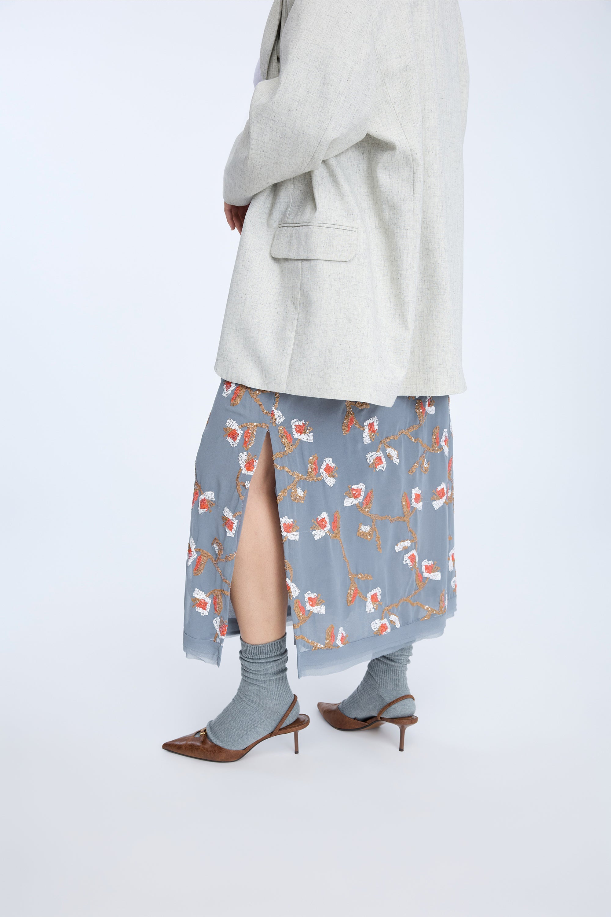 Skirt with a beautiful pattern of sequin flowers in warm tones. Designed with an elastic waistband and elegant slit.