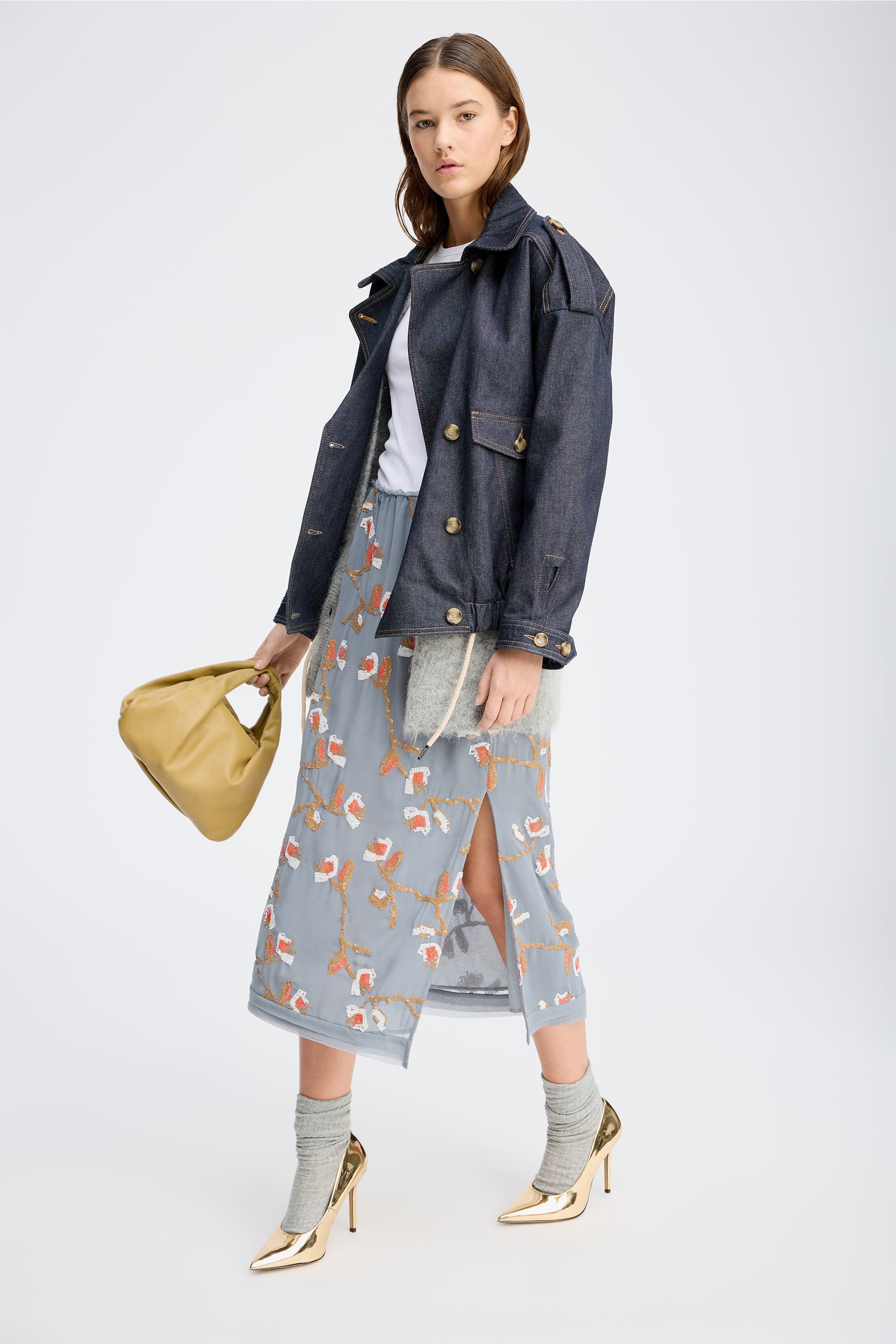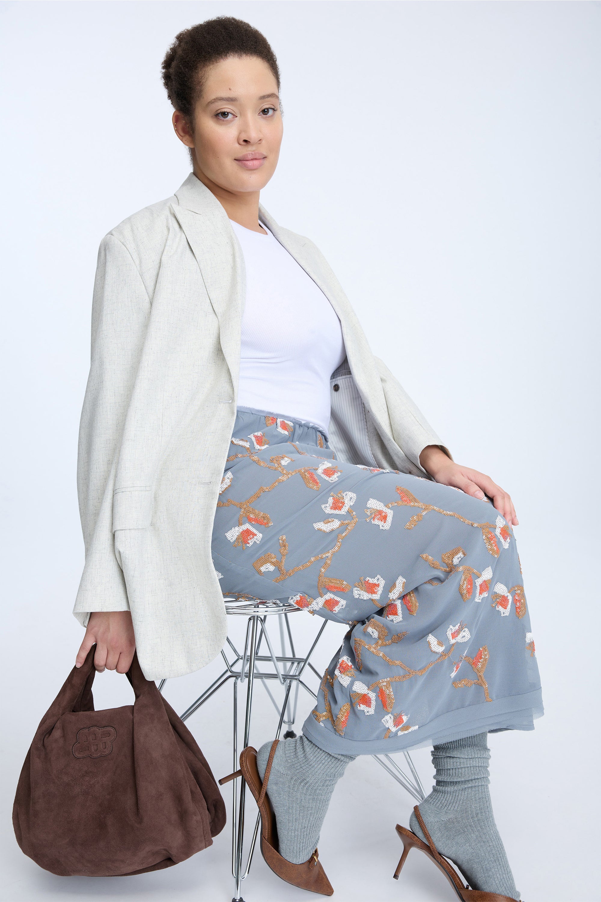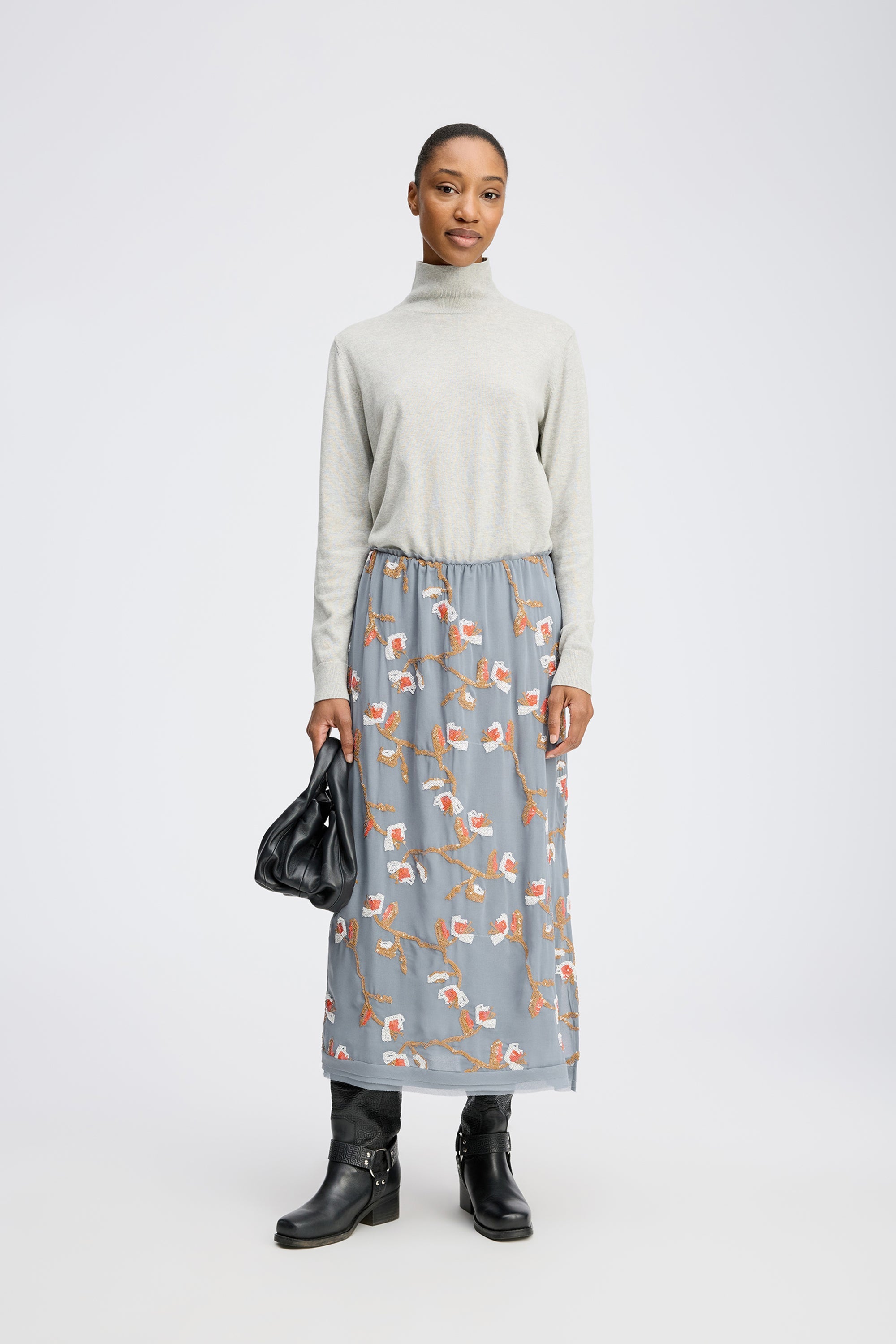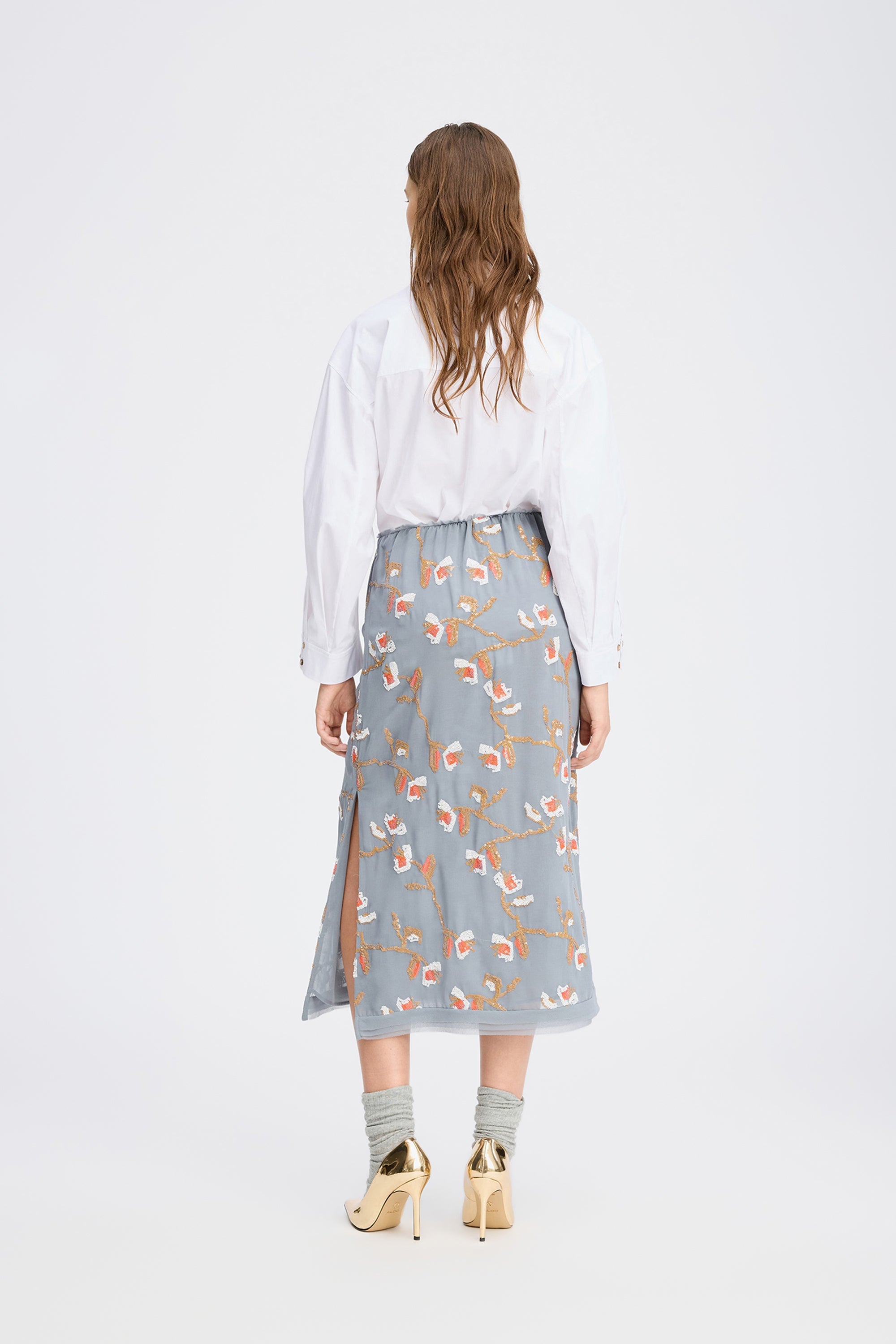 Skirt with a beautiful pattern of sequin flowers in warm tones. Designed with an elastic waistband and elegant slit.