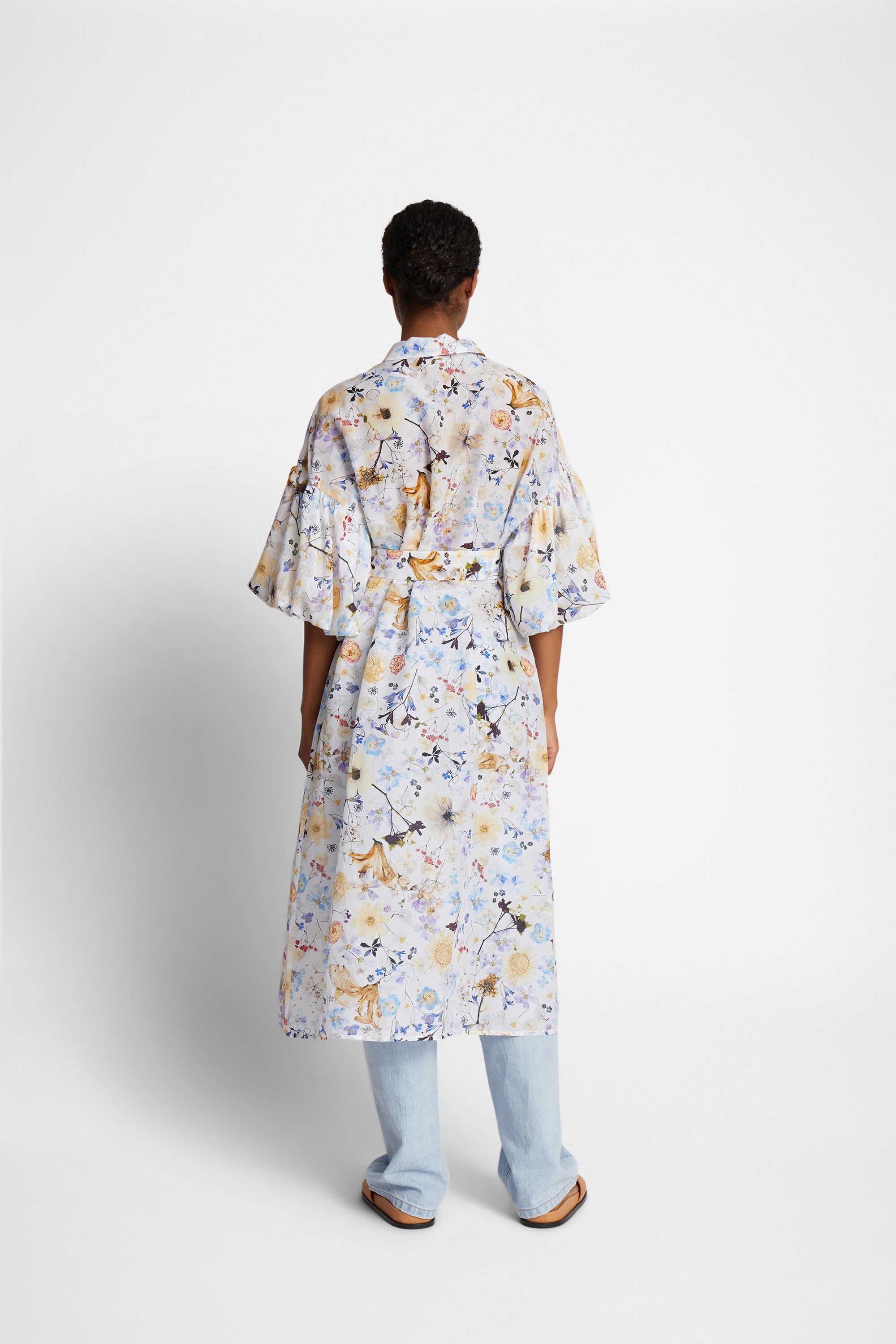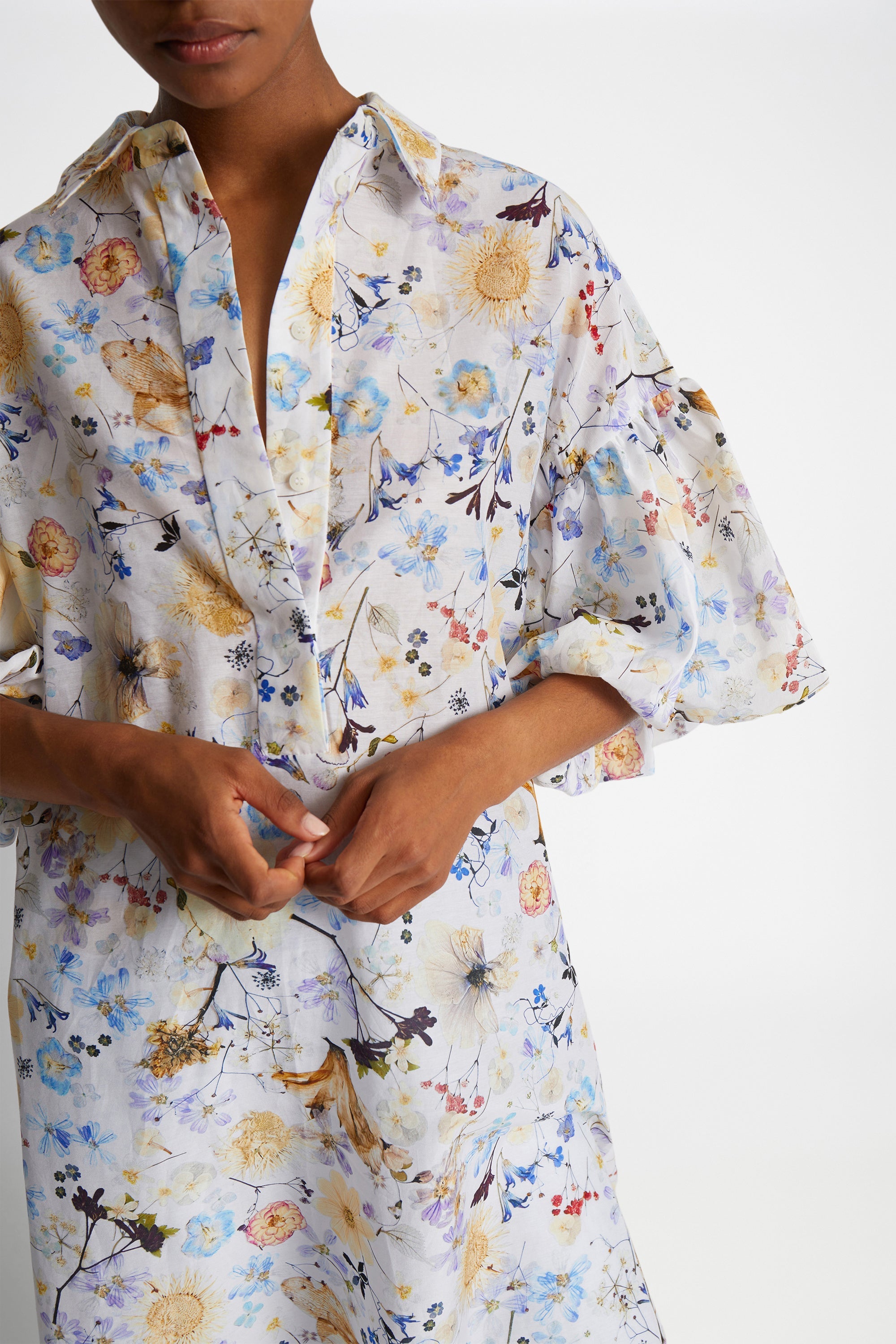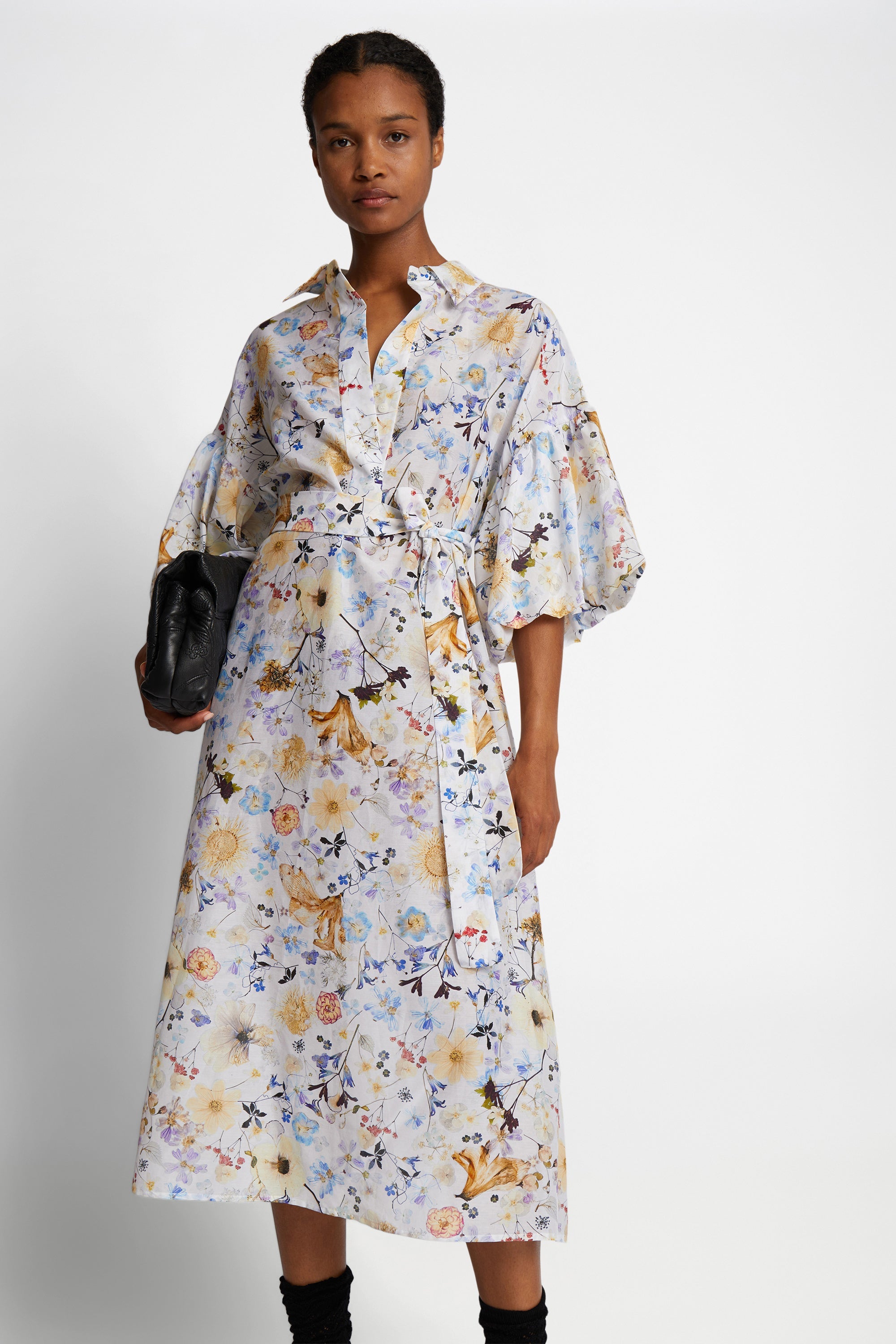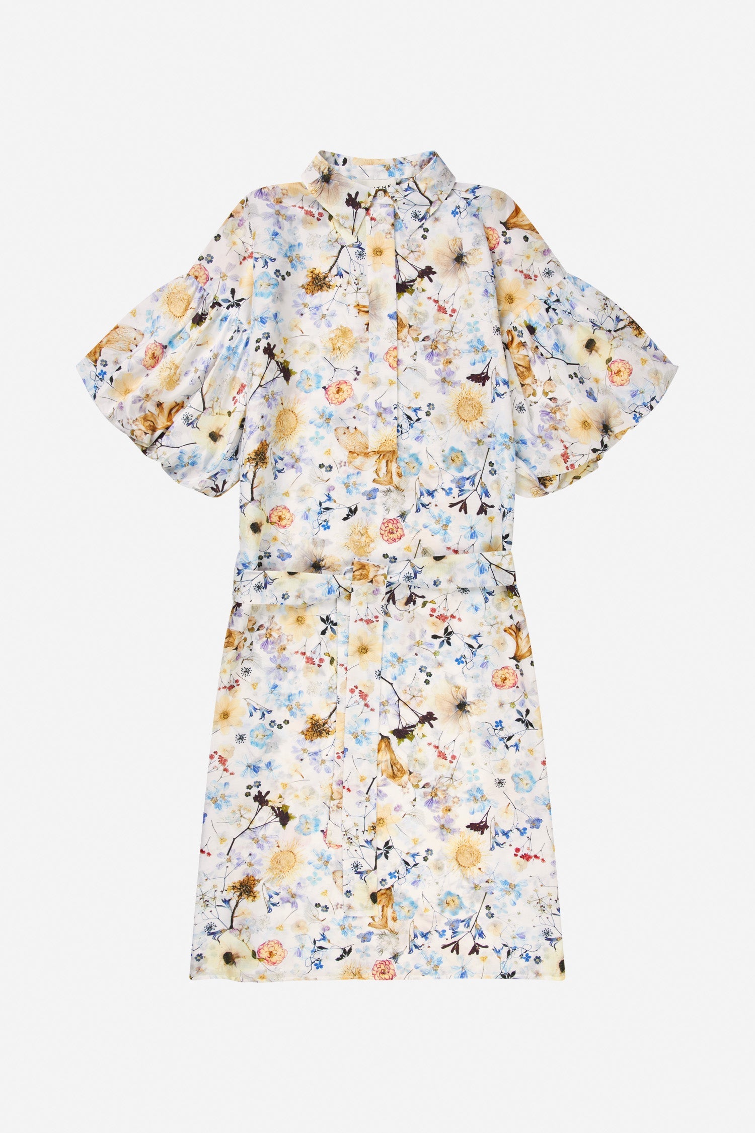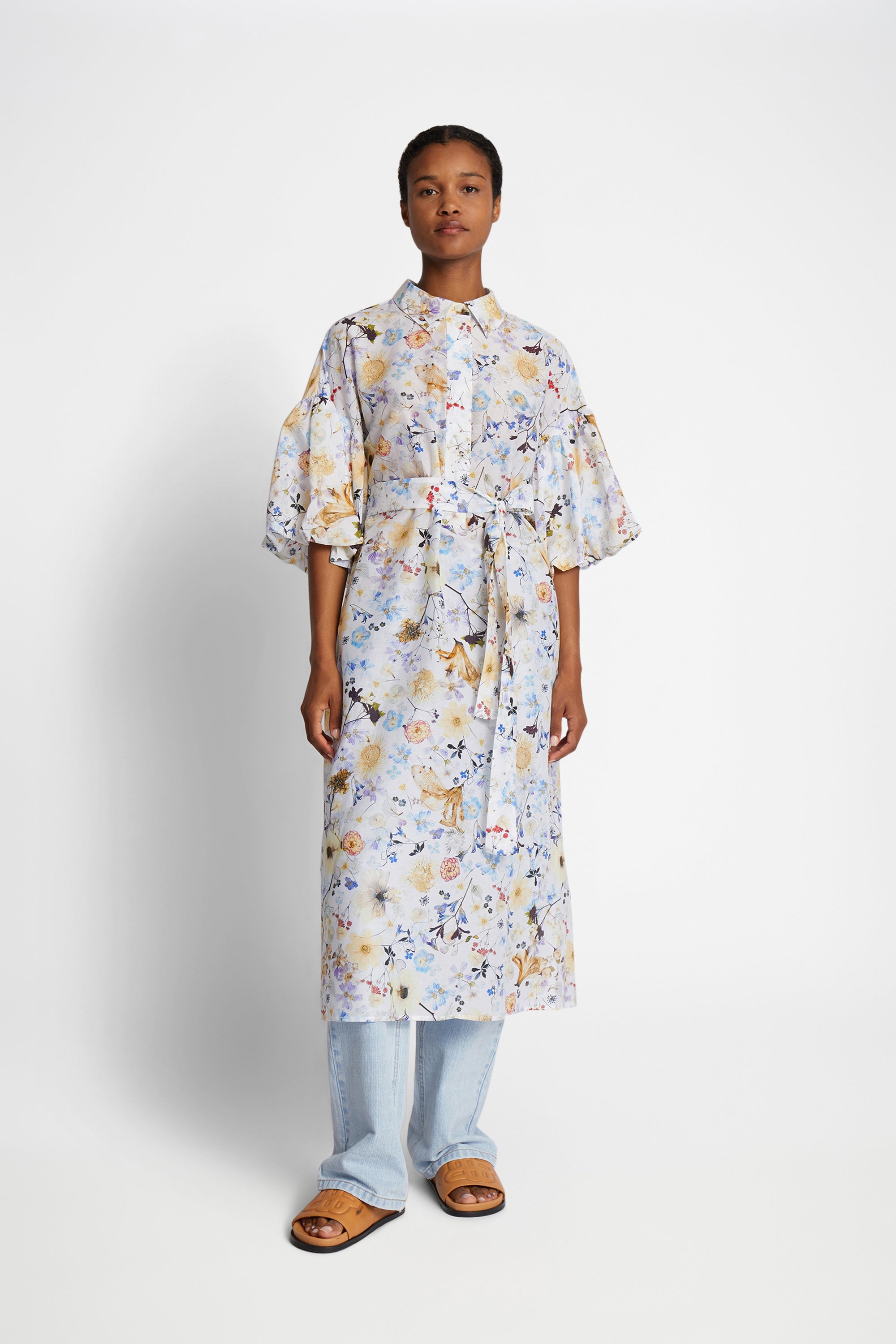 A shirt dress with a beautiful all-over print, made from flowers Naja Munthe has planted in her own garden. This dress is made from a soft silk blend and is designed with a half-down opening, wide puffed sleeves and an elegant belt for multiple styling options. This dress can be styled with or without the belt.