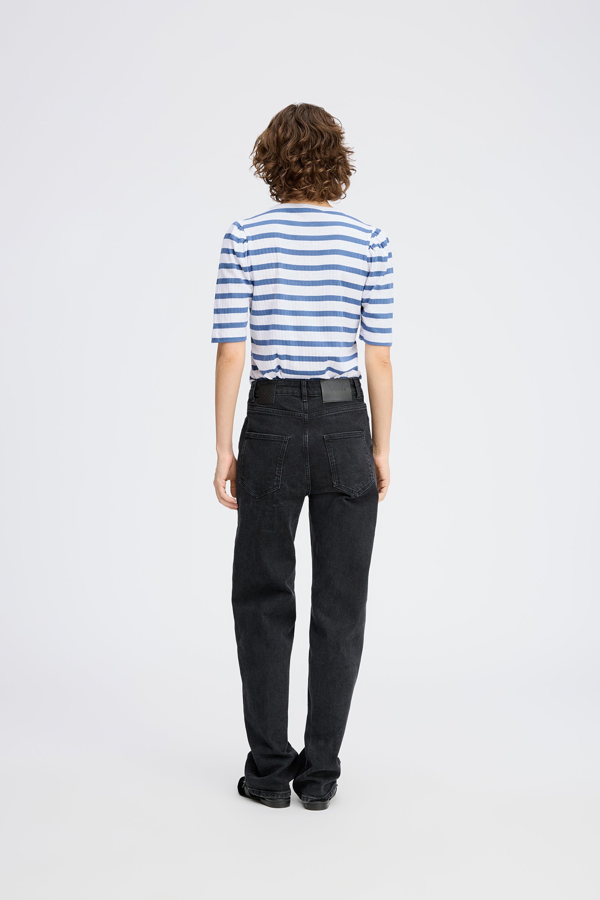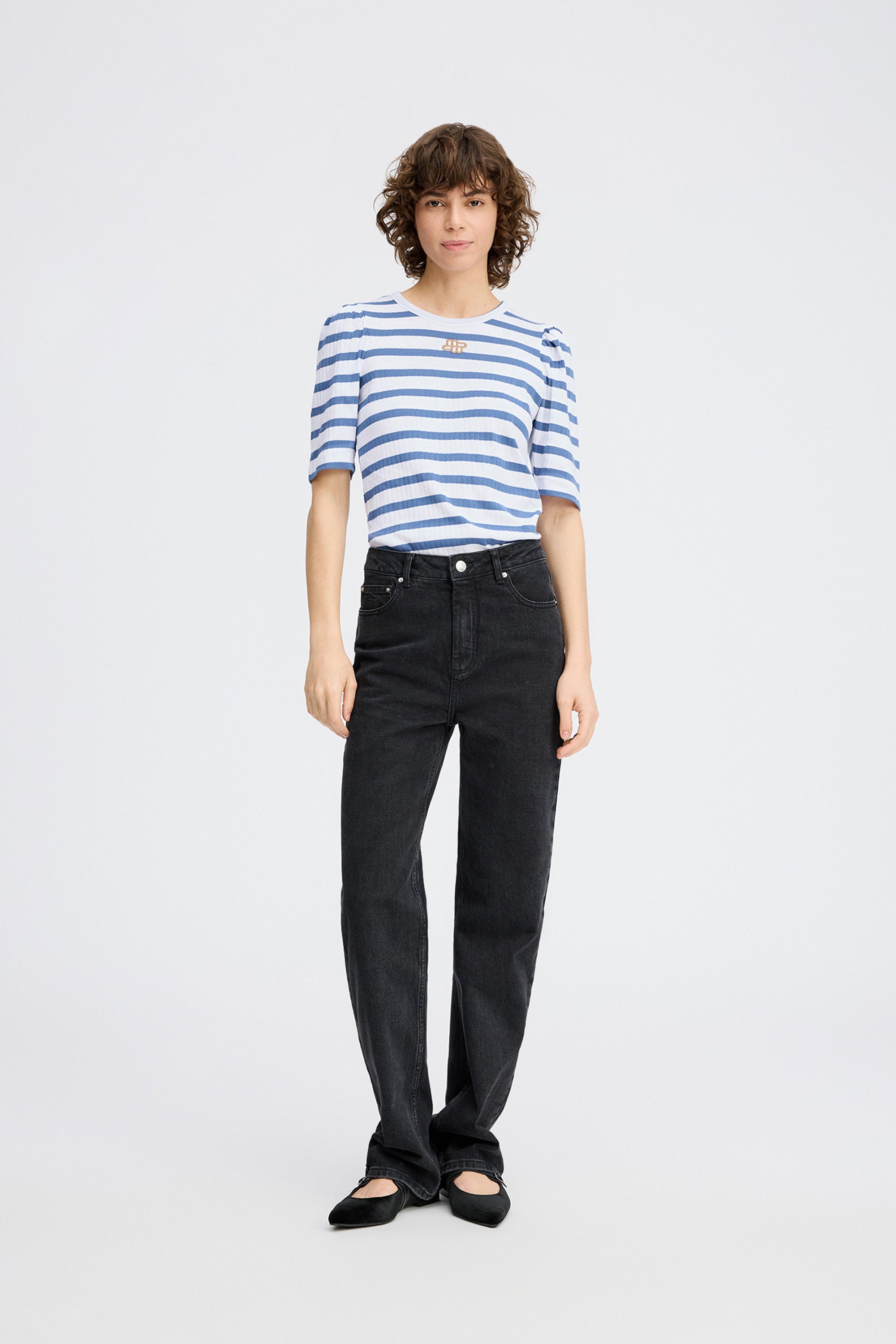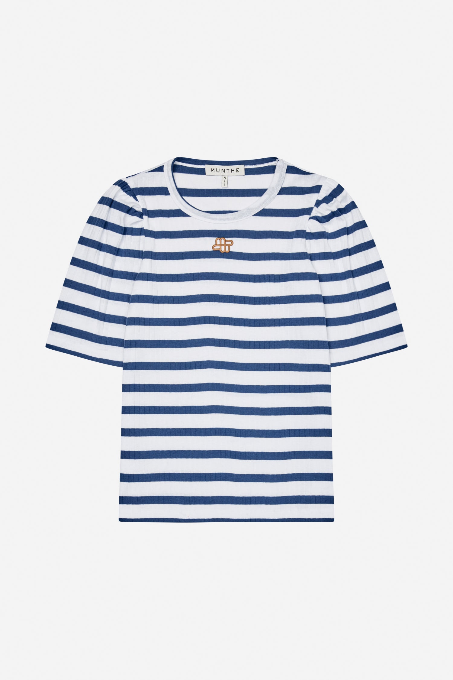 Striped T-shirt with a beautiful MUNTHE emblem embroidered on the chest. This T-shirt is designed with small, elegant, feminine puff sleeves. The T-shirt features a round neckline, low shoulder seams, and is made of 100% organic cotton.
