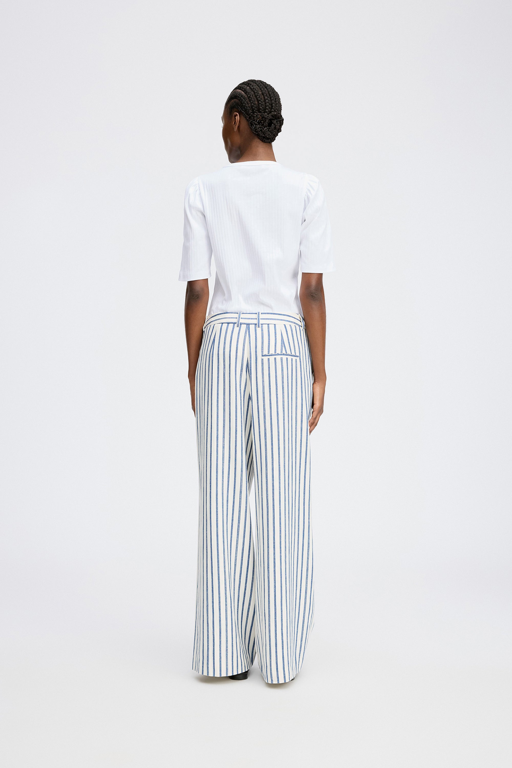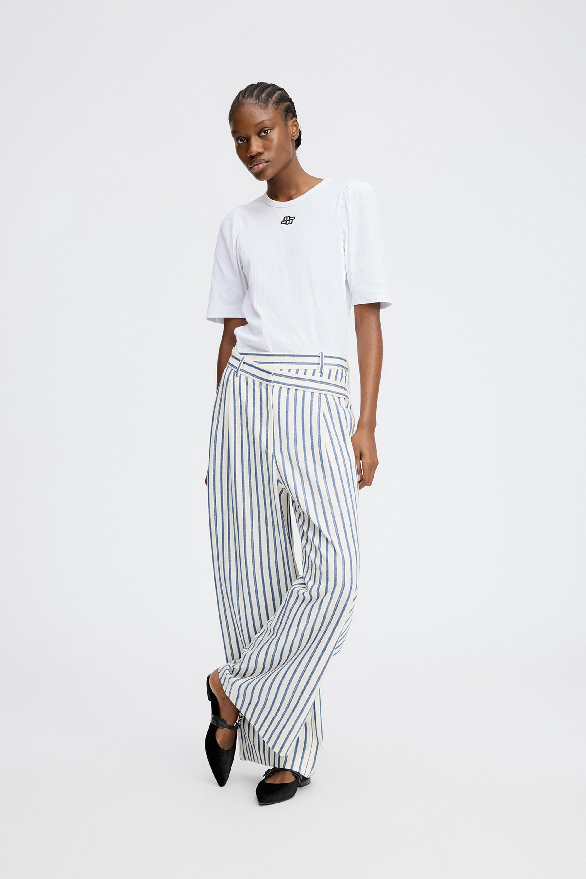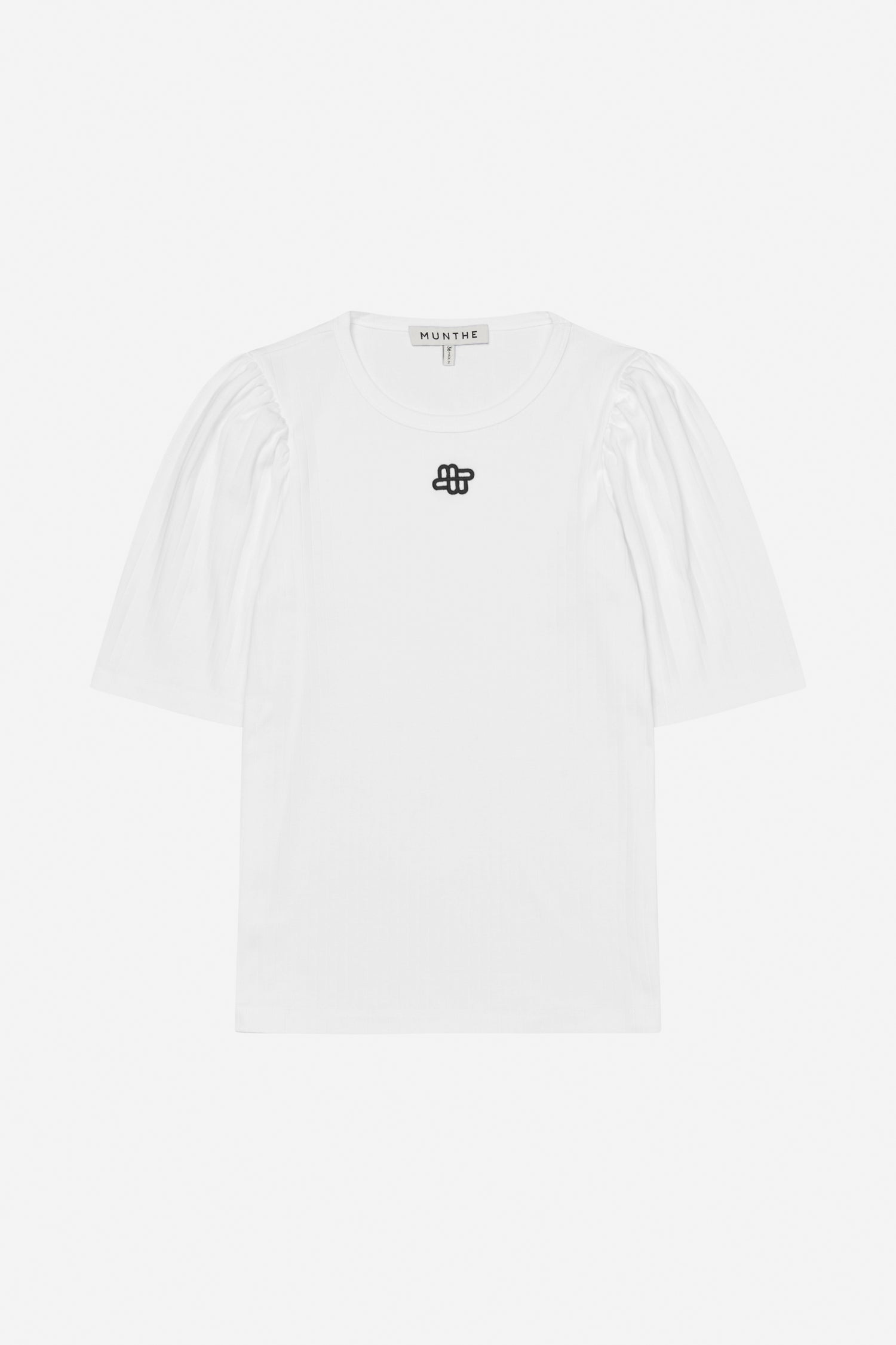 T-shirt with a beautiful MUNTHE emblem embroidered on the chest. This T-shirt is designed with small, elegant, feminine puff sleeves. The T-shirt features a round neckline, low shoulder seams, and is made of 100% organic cotton.