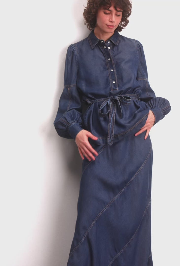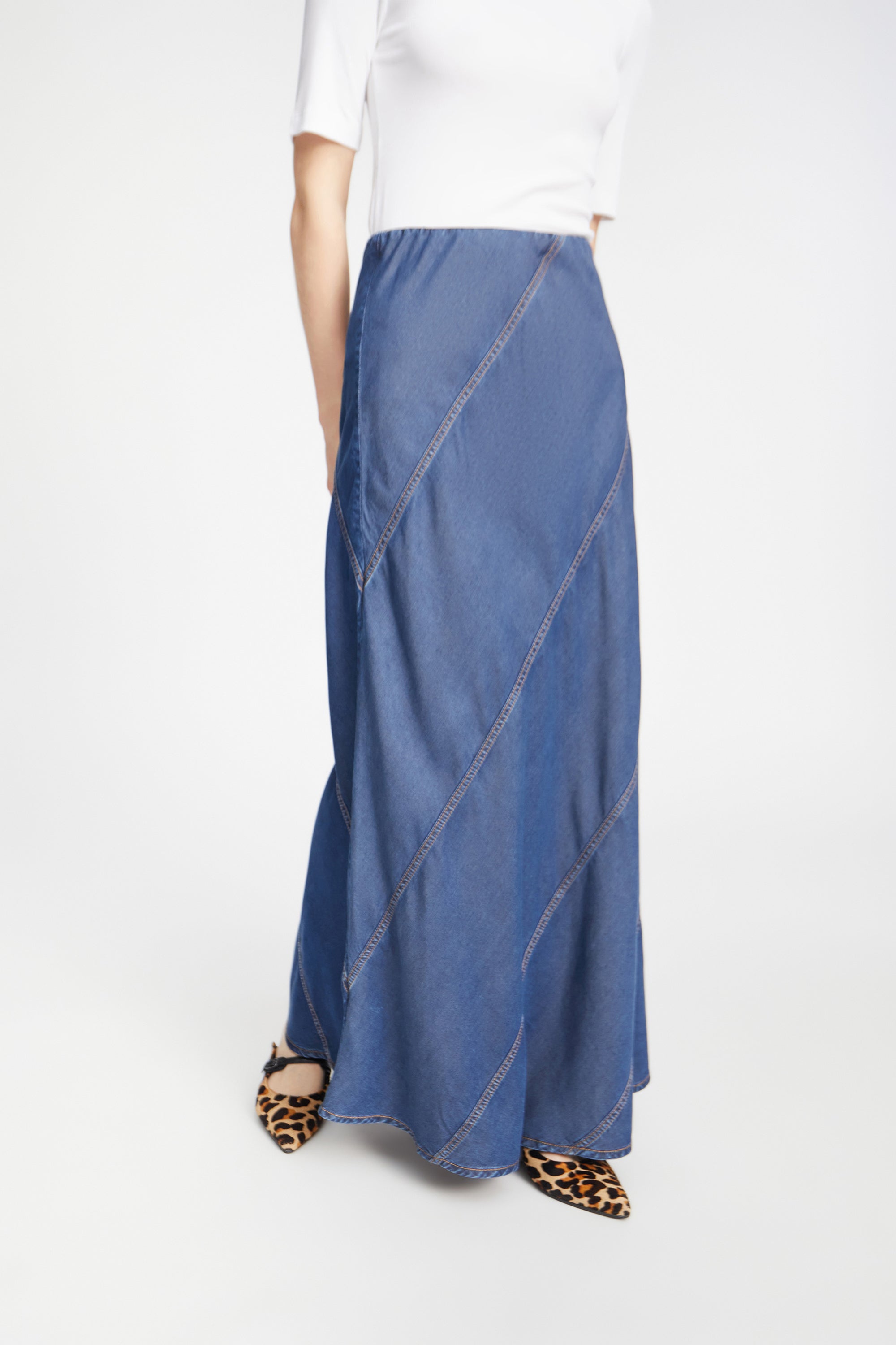 A beautiful, long denim skirt with elegant diagonal stitching. The skirt is designed with an elastic waistband.