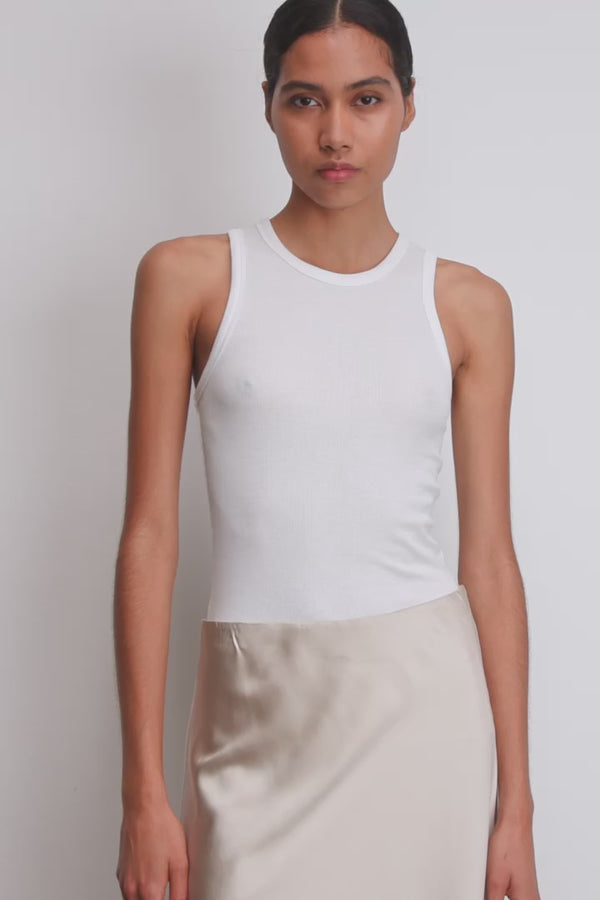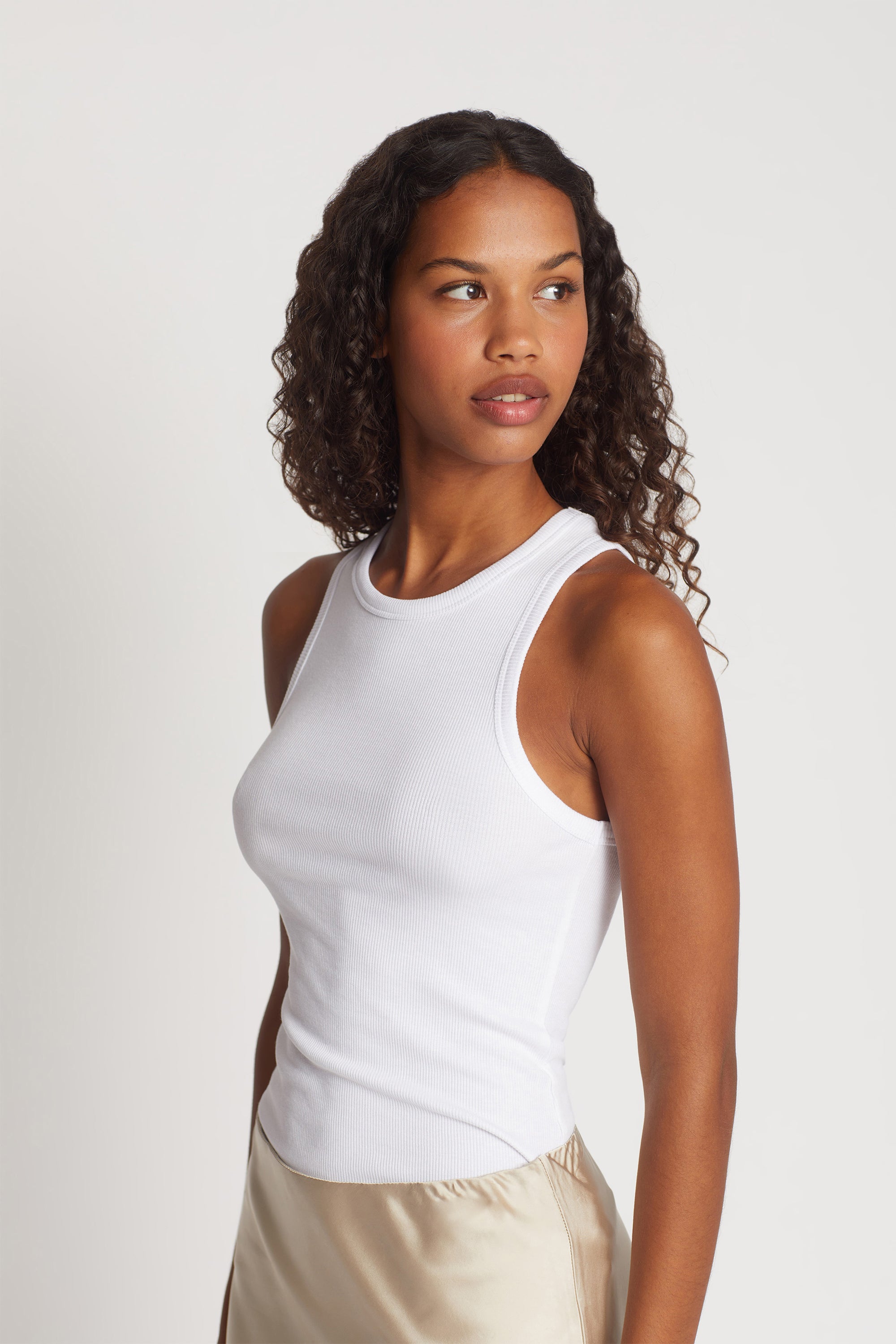 Soft, elegant tank made from an Ecovero viscose blend. This tank has a thin rib, a round neck and is designed for a slim fit.
