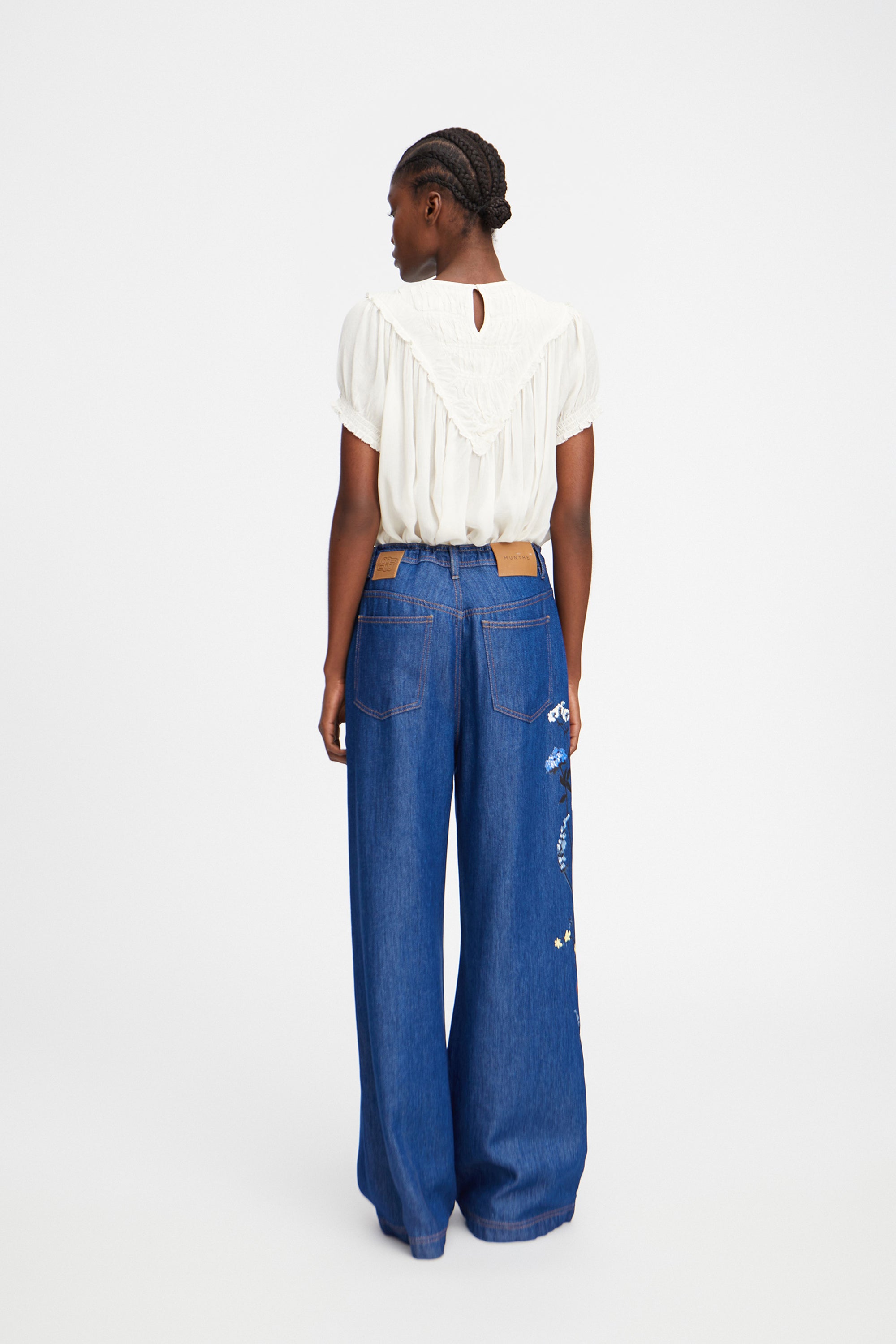 Soft blouse with a beautiful V-shaped ruffled pattern on the chest and elegant details along the sleeves. The shirt has a button closure on the back.