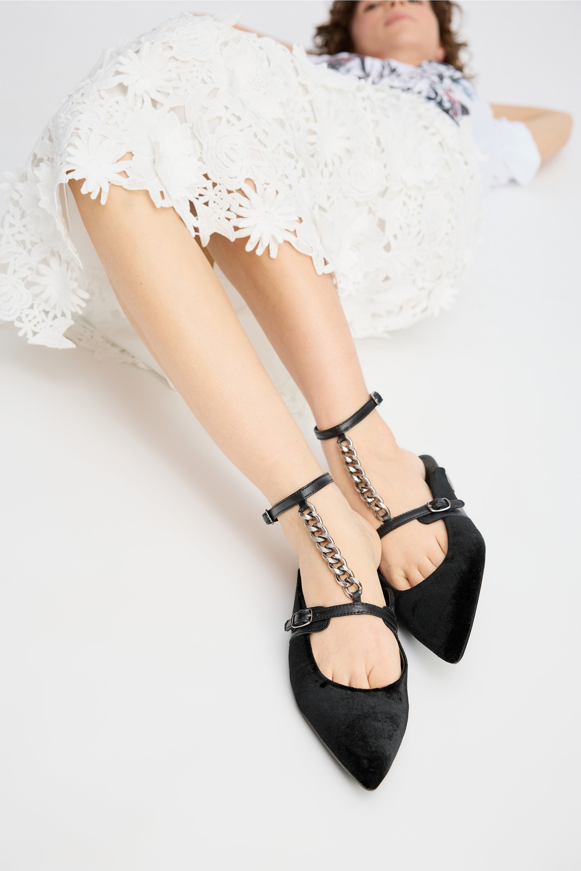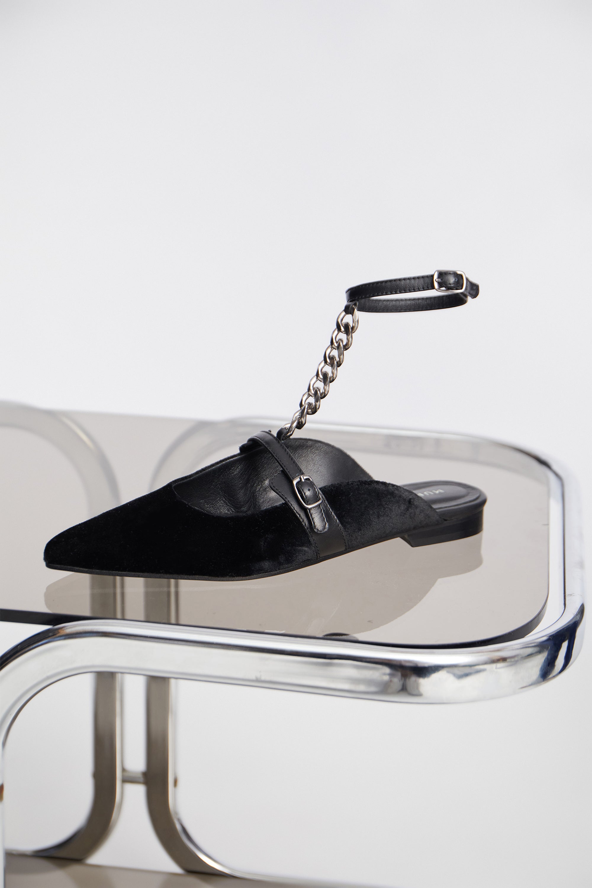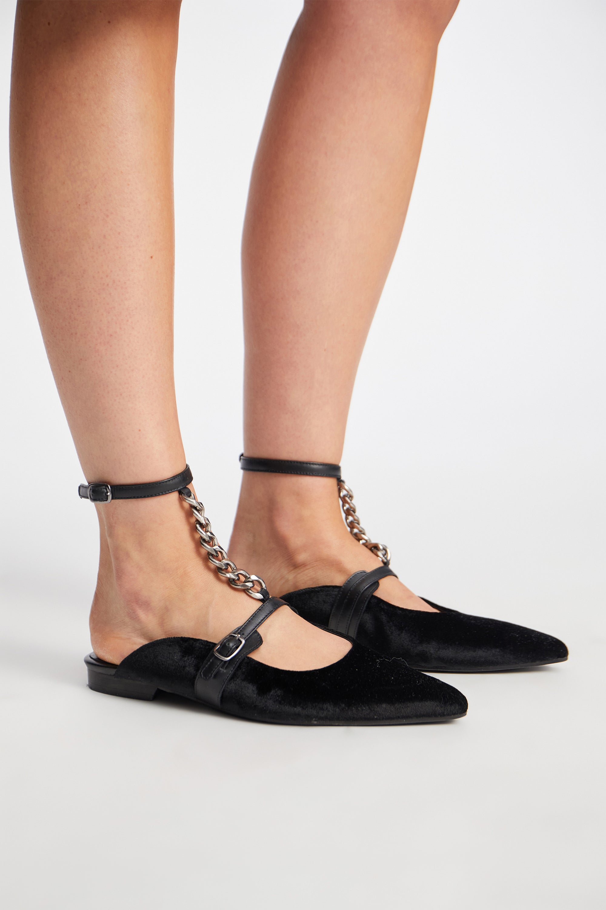 A beautiful shoe featuring an elegant chain running from the ankle to the instep. The shoe features an adjustable fit around the ankle with a small buckle. This shoe is designed with an open heel and is made of 100% leather with a natural hair texture.