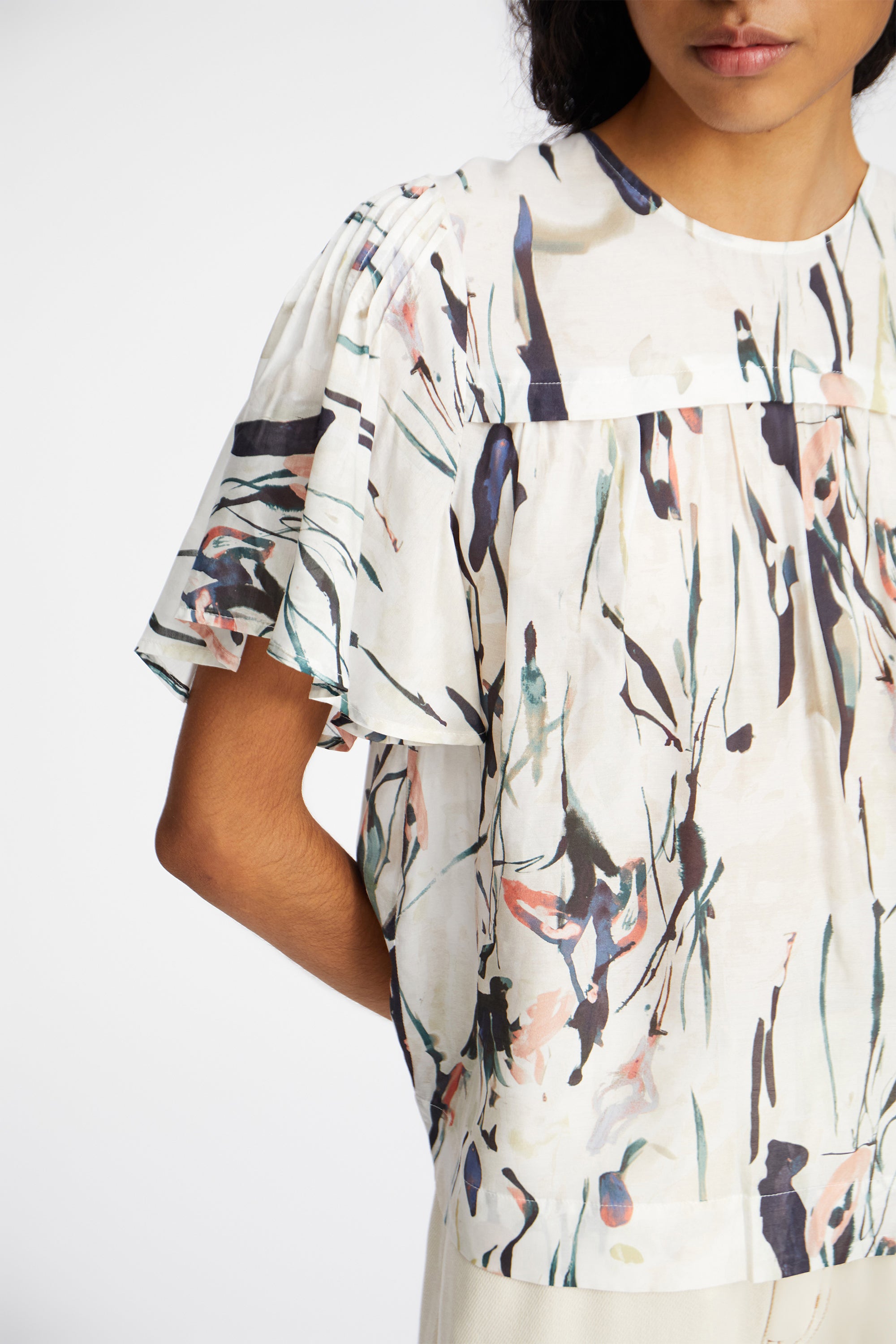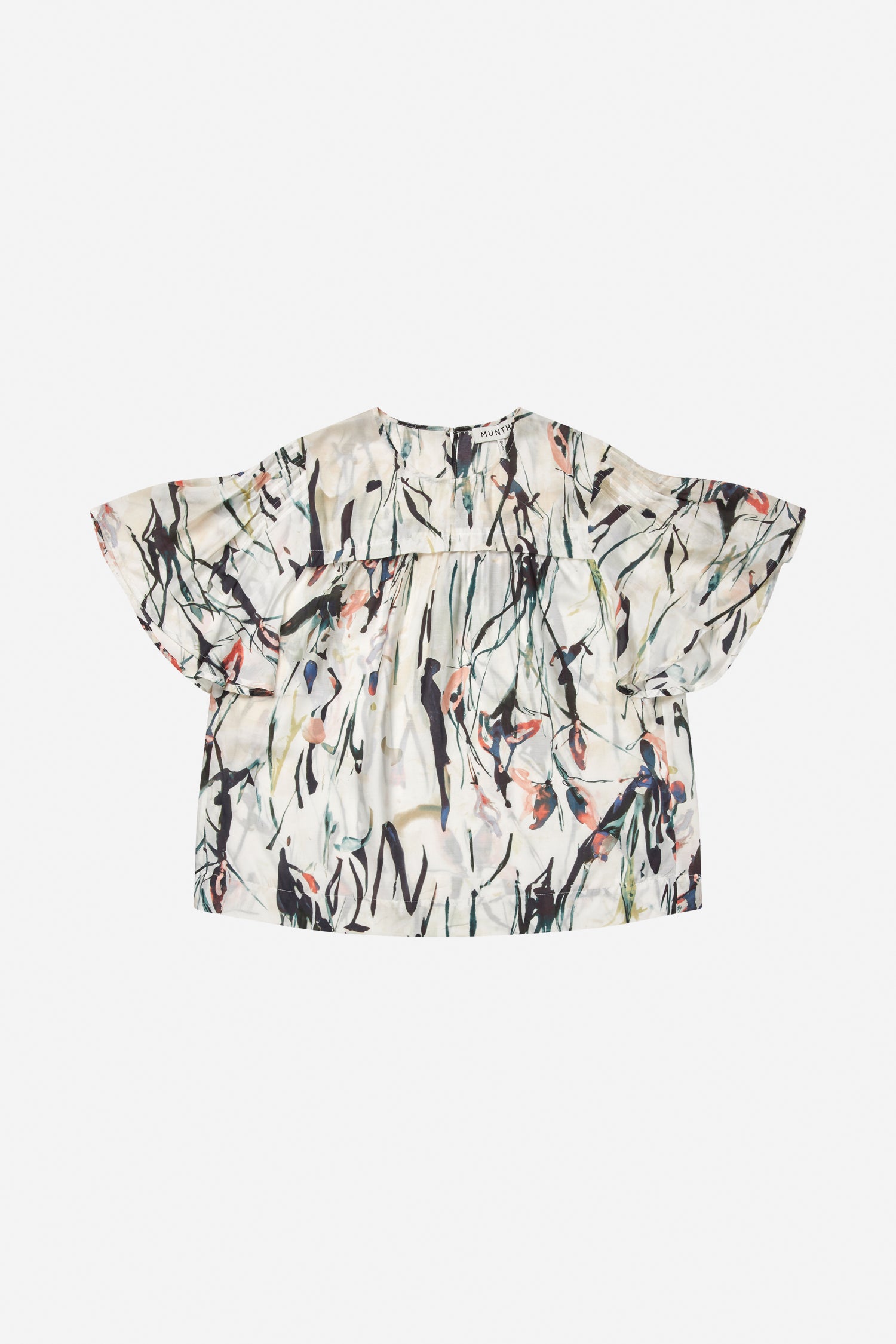 Feminine blouse with a beautiful art print. The blouse has elegant small sewn details at the shoulders, and is designed with short, loose sleeves. The blouse has an elegant button closure at the neck.