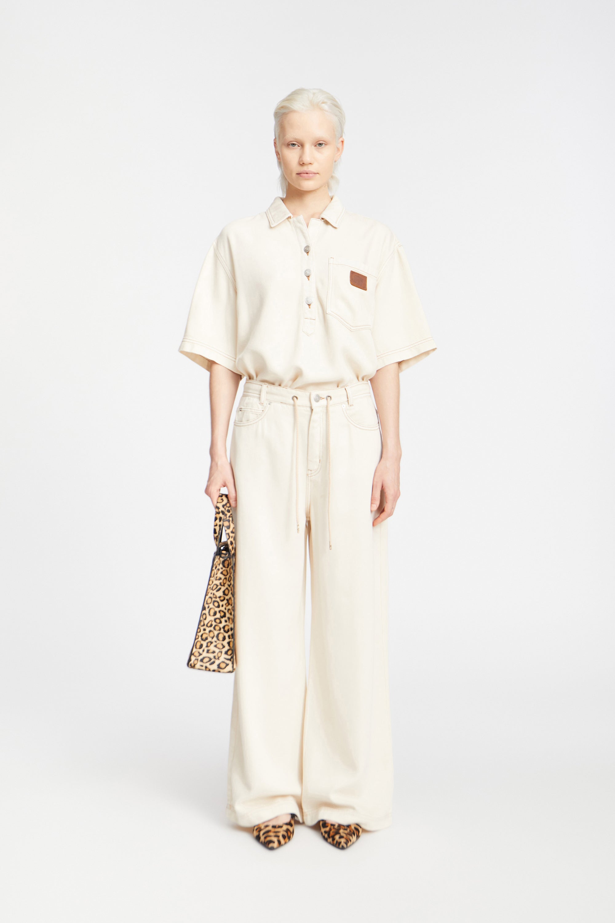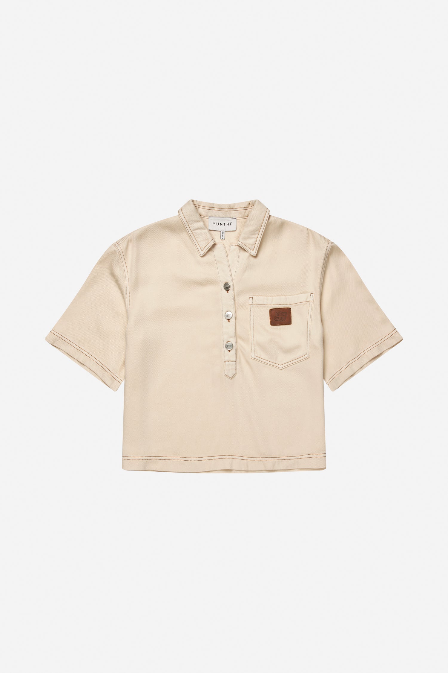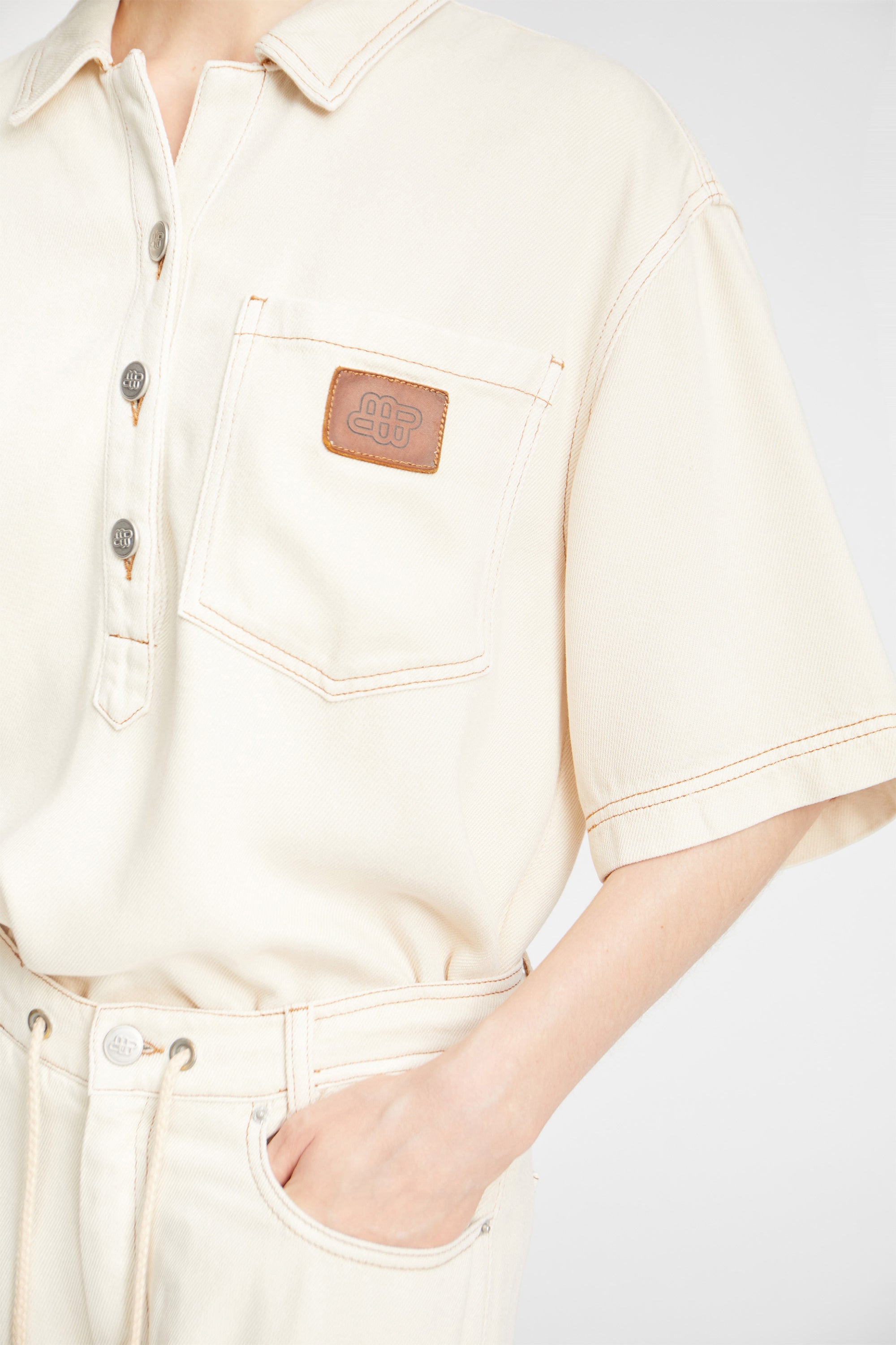 Beautiful denim blouse with an elegant leather patch with a MUNTHE emblem. The blouse has a half-way shirt opening and a collar, as well as an elegant pocket on the chest. The blouse is designed for a loose fit.