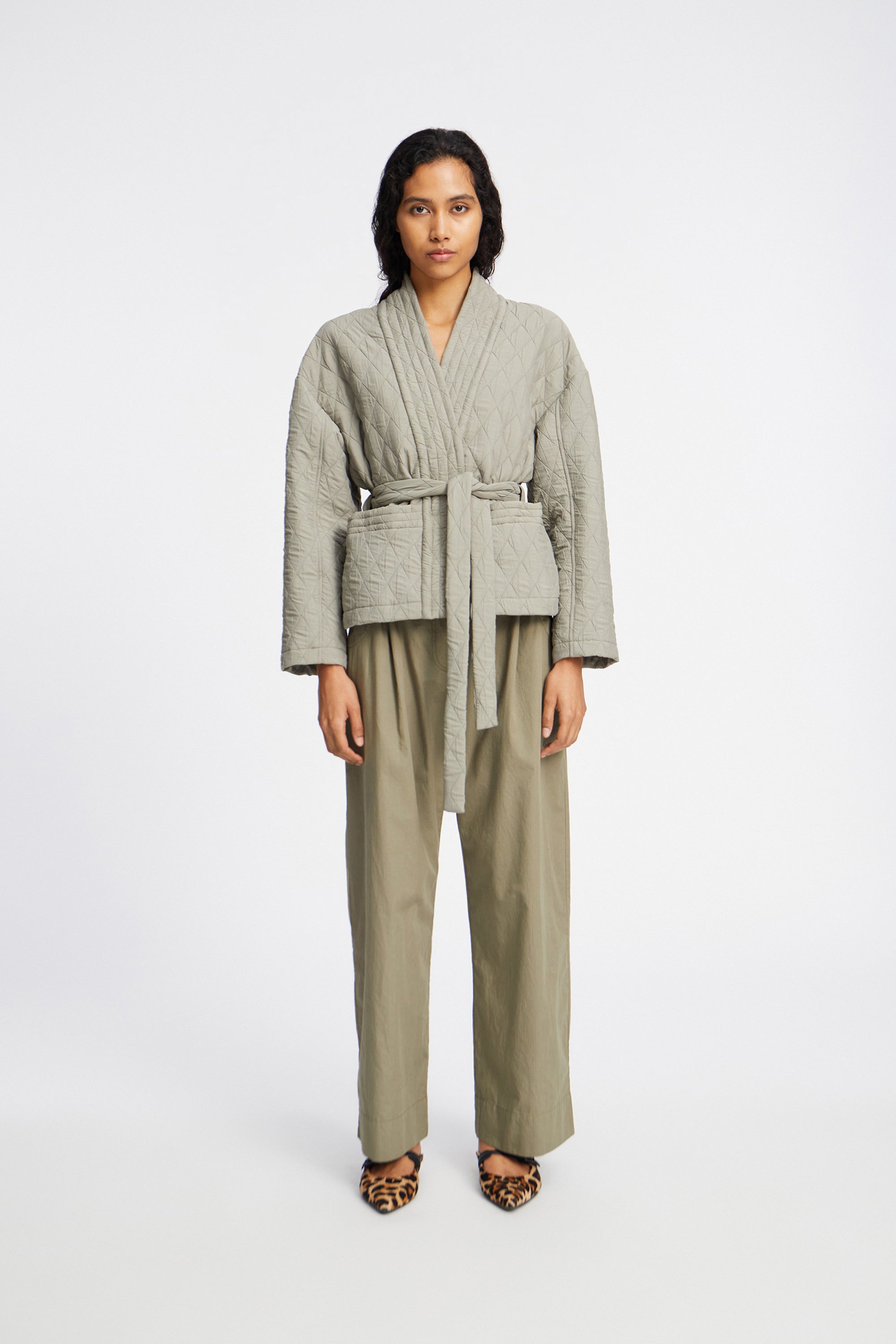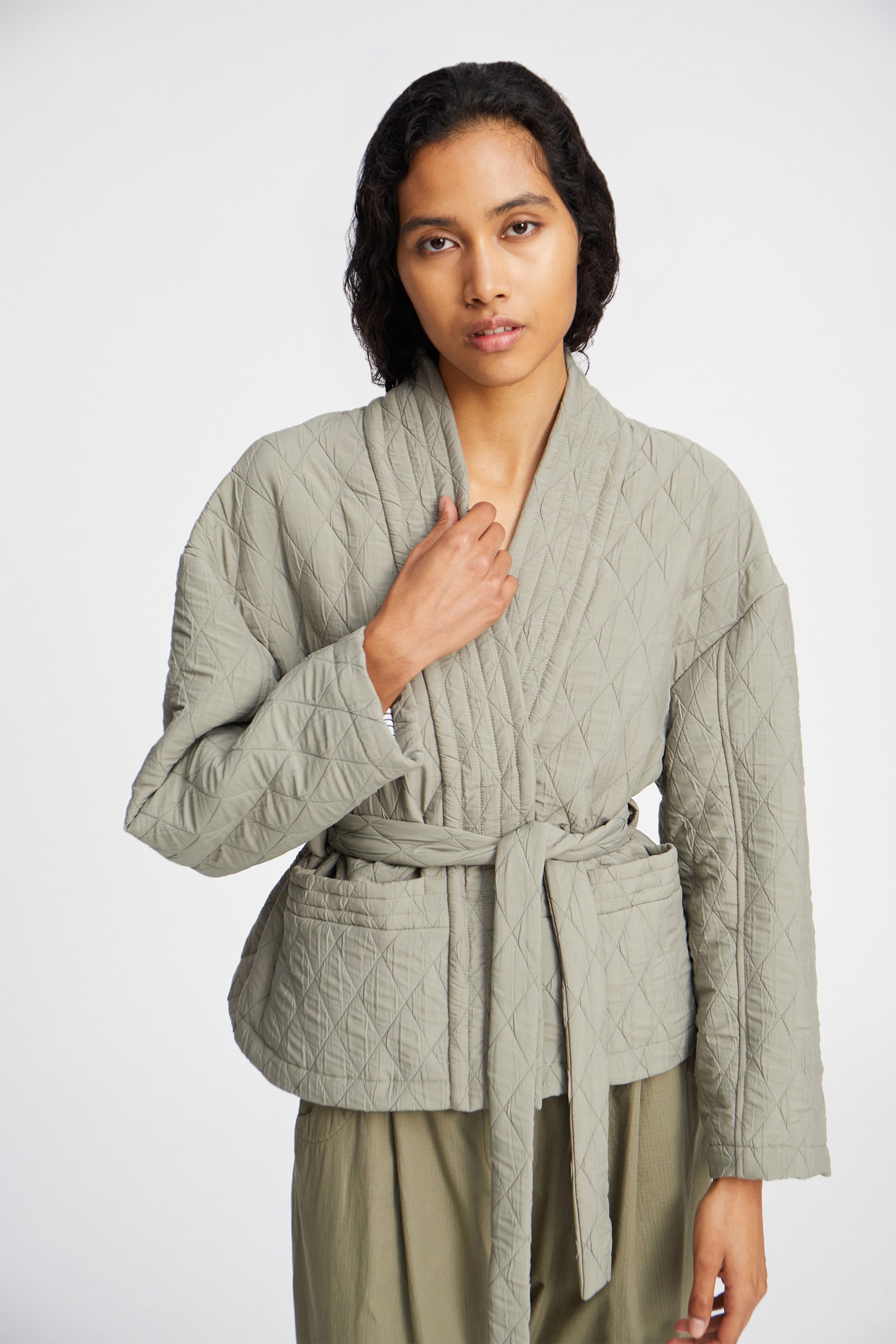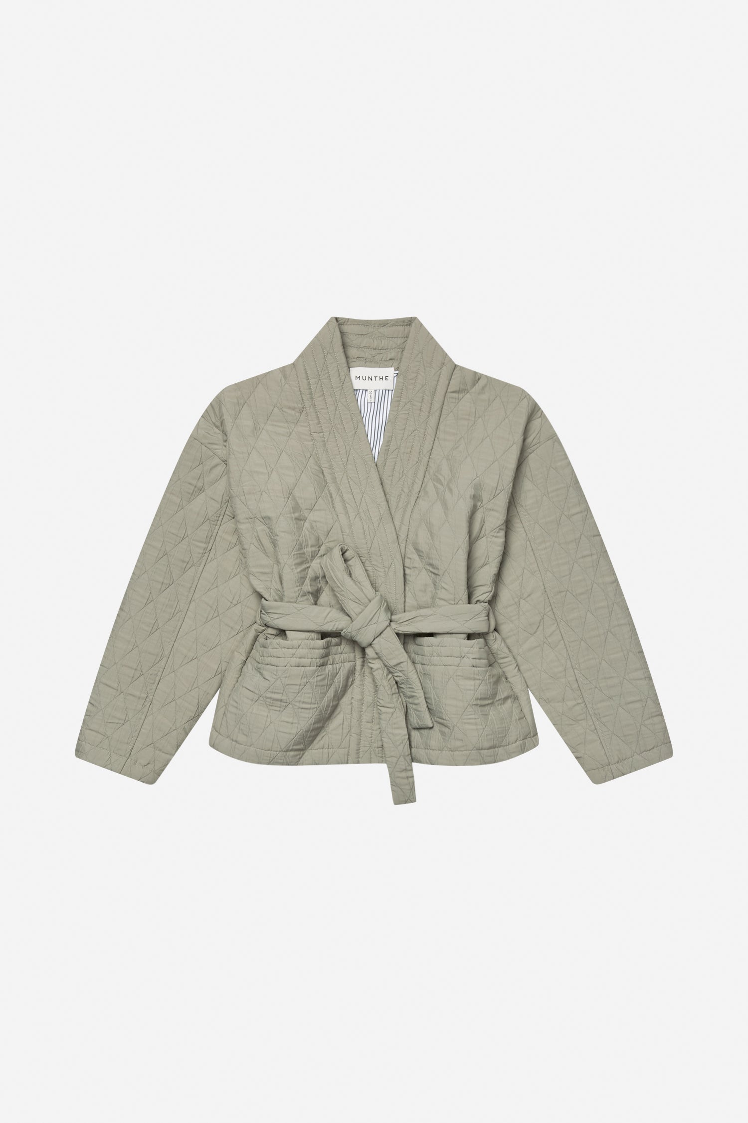 Elegant quilted jacket with a beautiful waist belt and front pockets. The jacket features an elegant double-breasted button closure.
