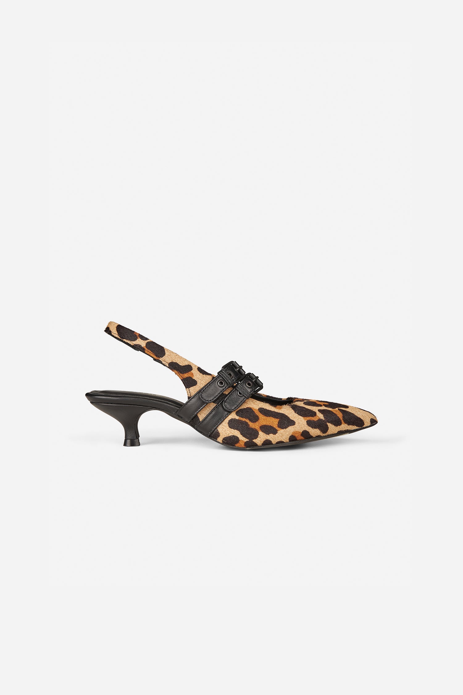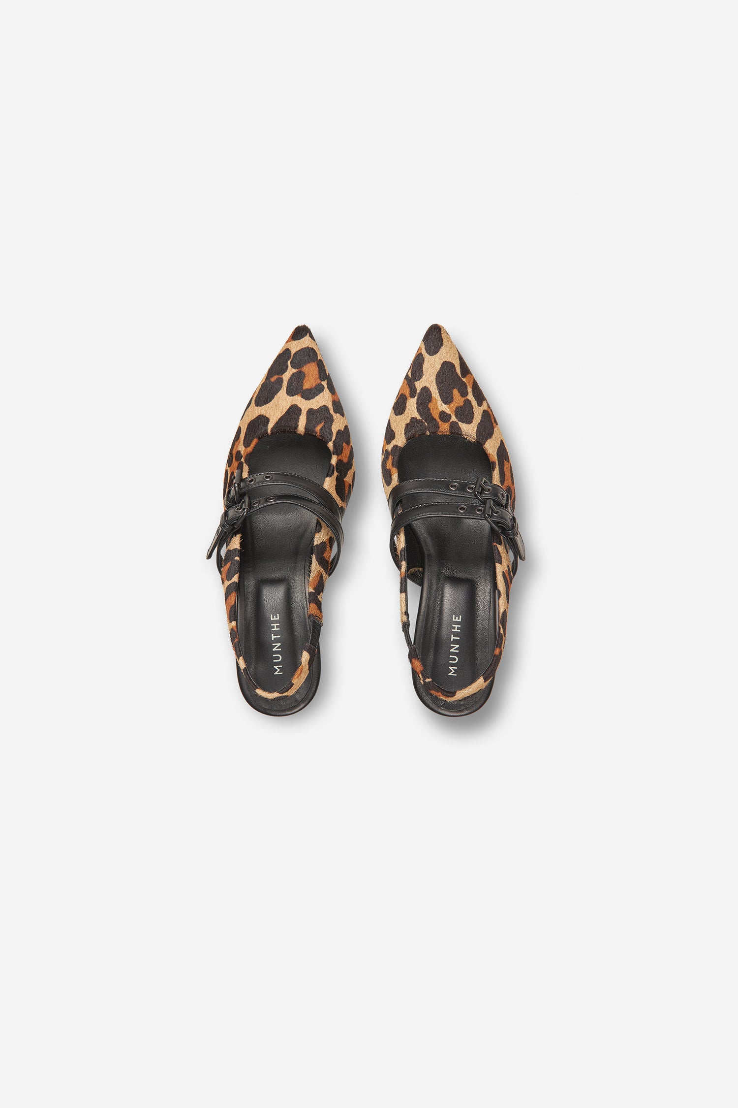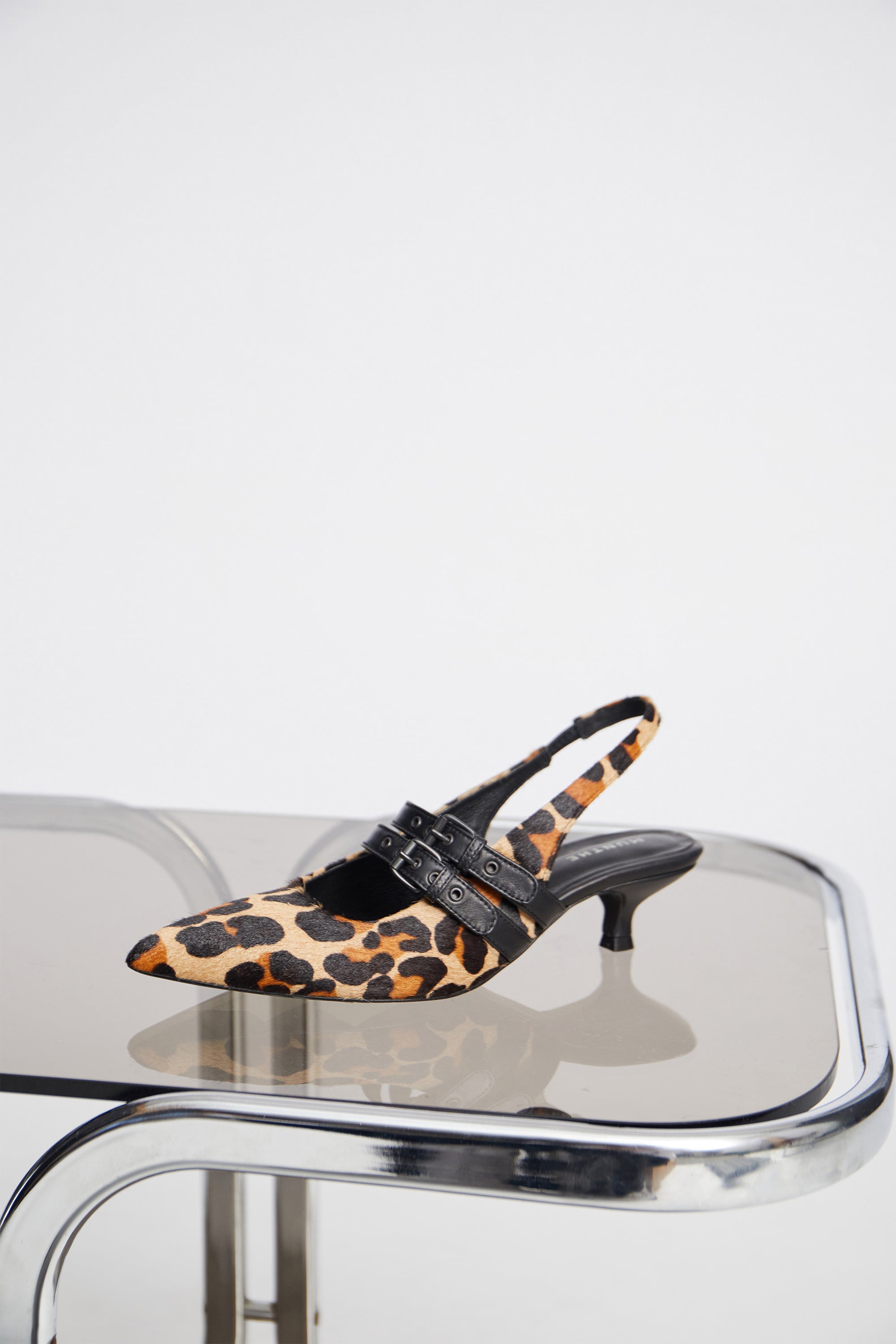 Shoes with a small heel and an elegant leopard print. The shoe has an adjustable fit around the ankle with two fine buckles and a strap around the heel. It is made of 100% leather with a natural hair surface.