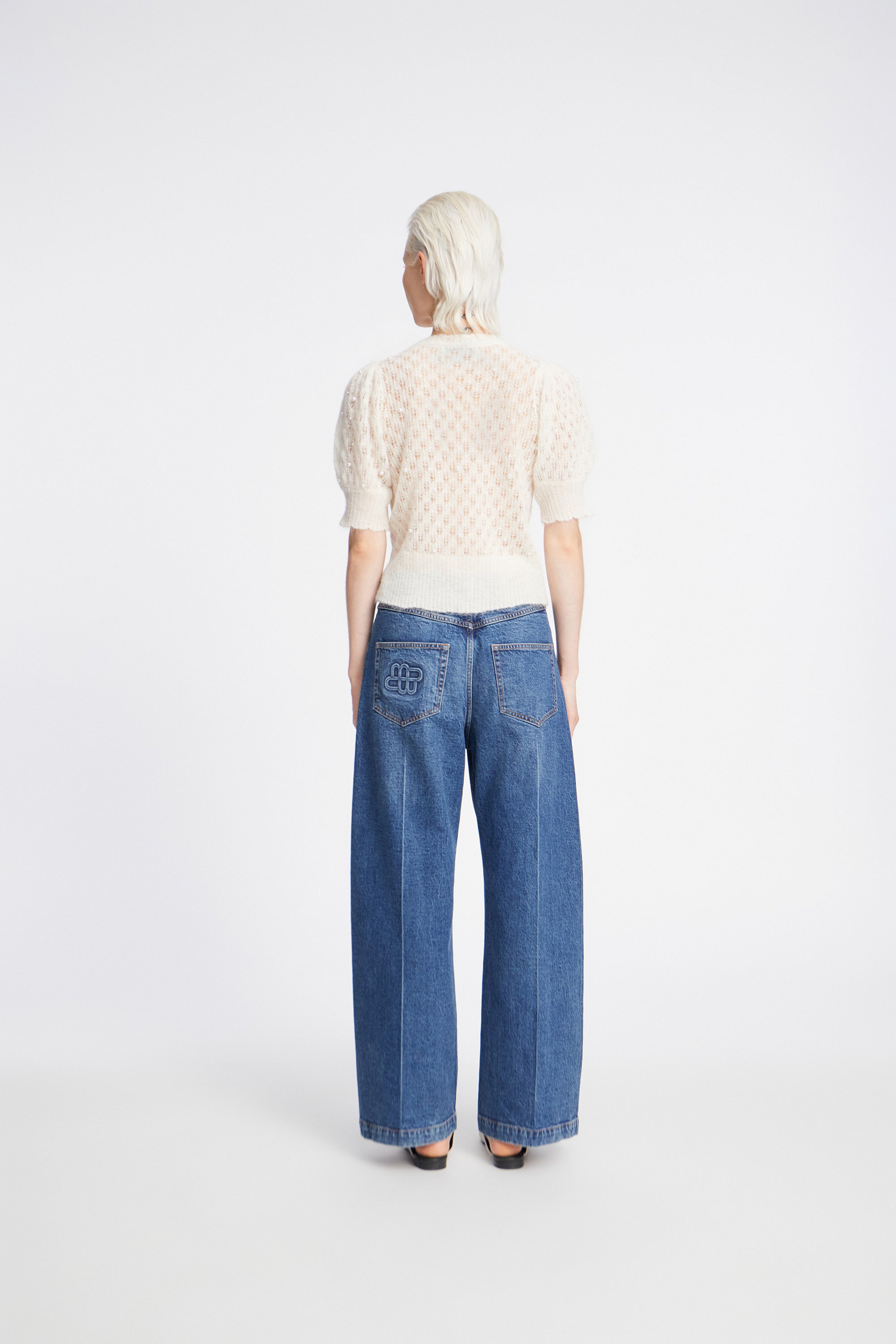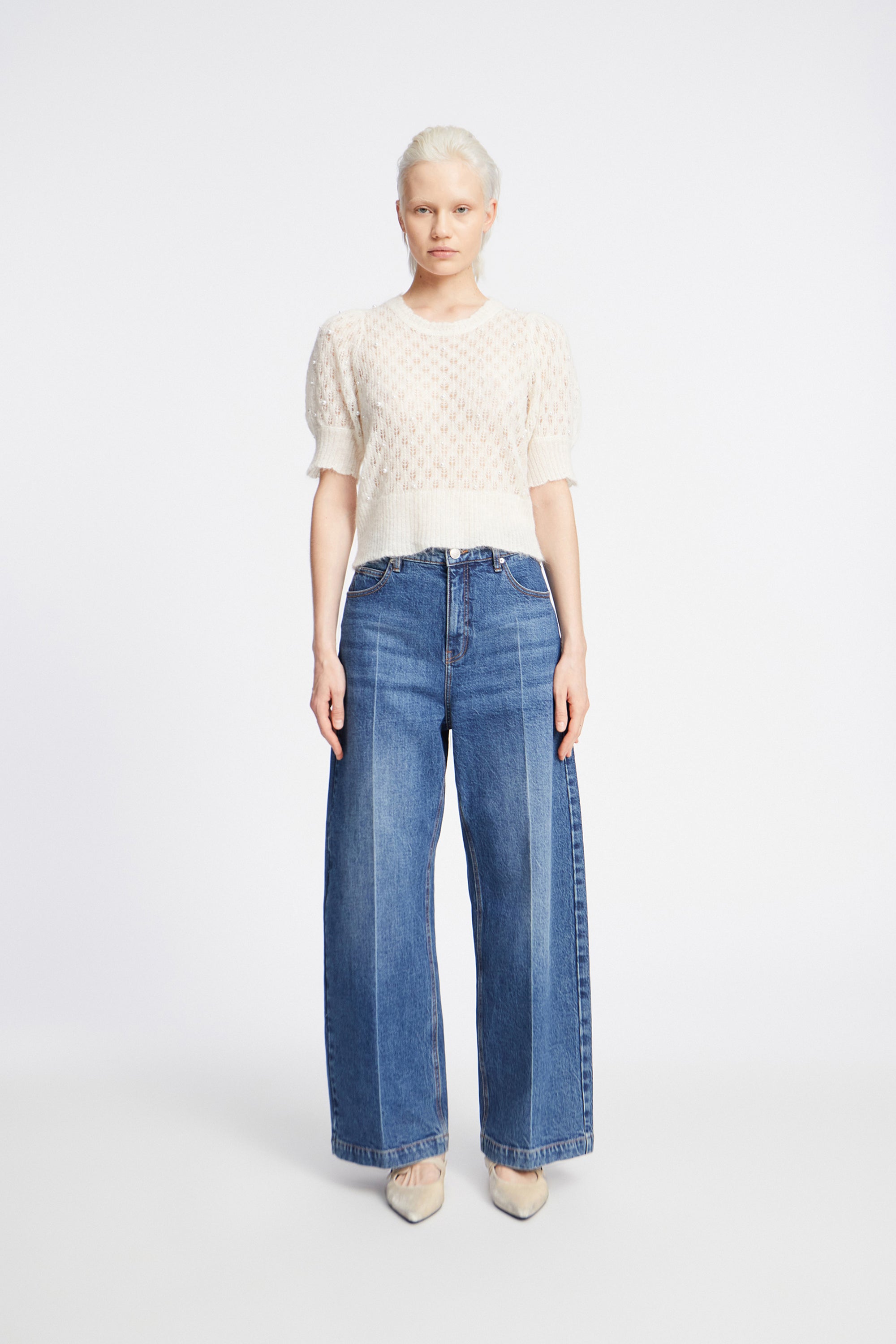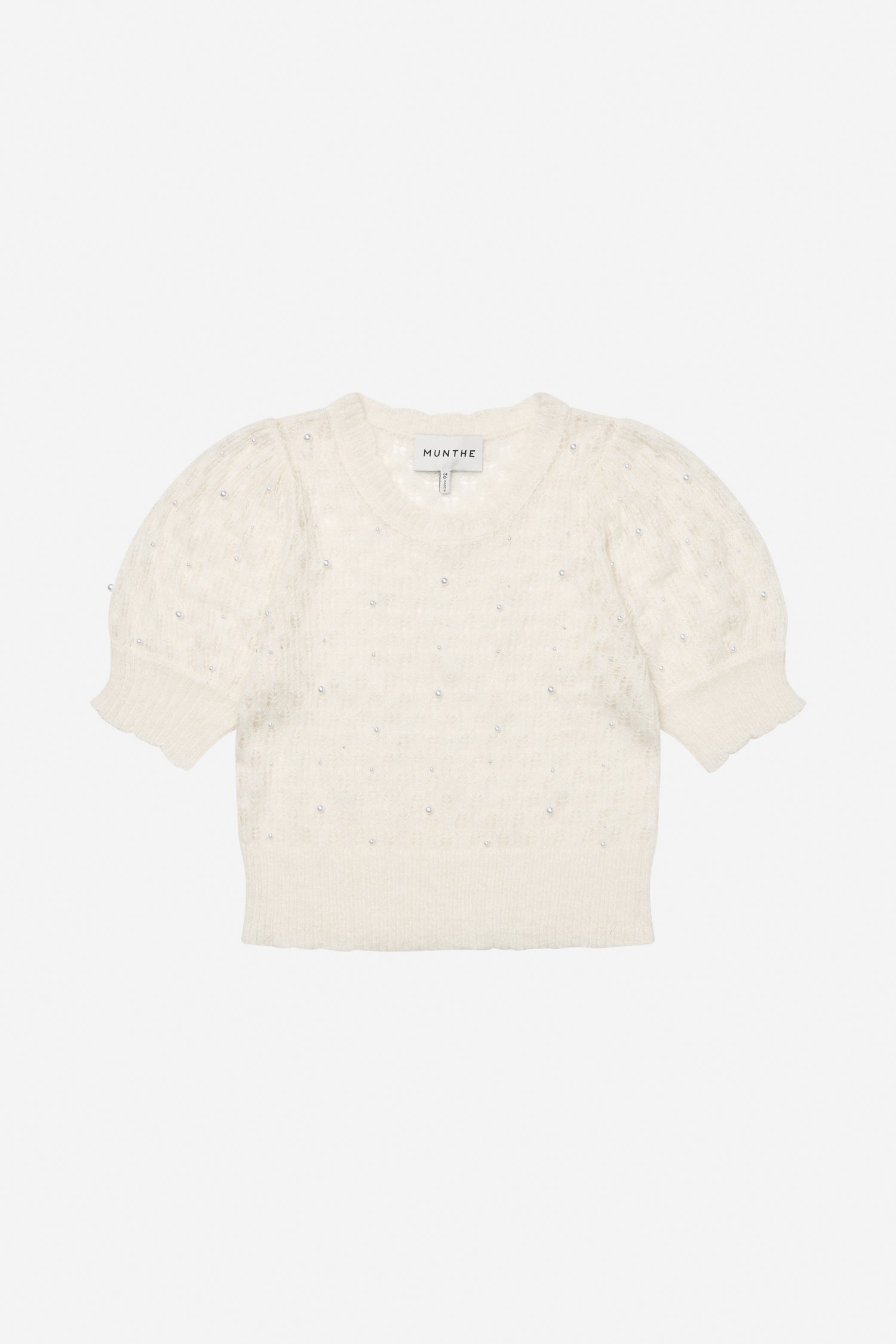A beautiful, lightweight knit with small, elegant beads. This knit is designed with a fine wavy ribbed edge, and the short sleeves have a slight puff.
