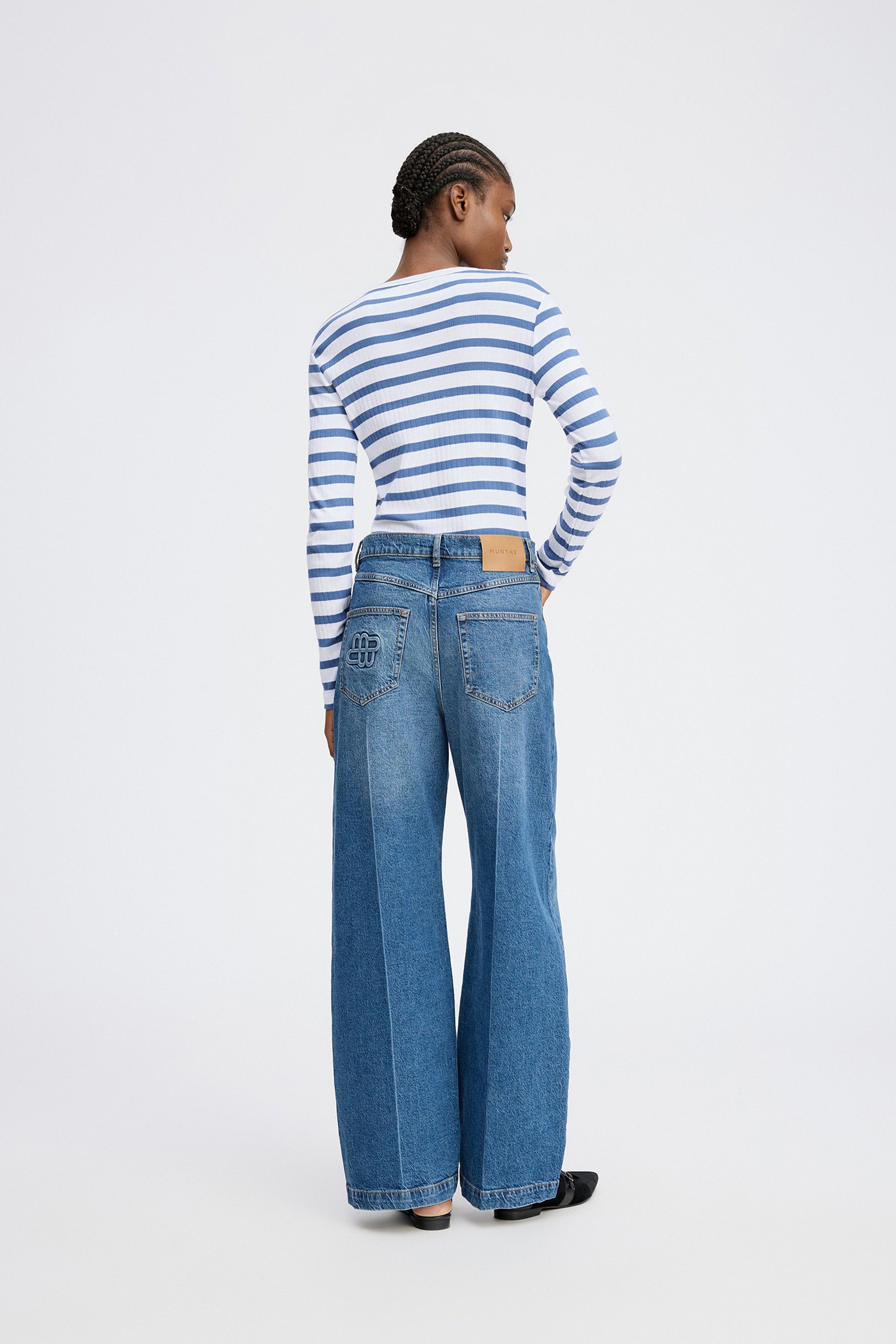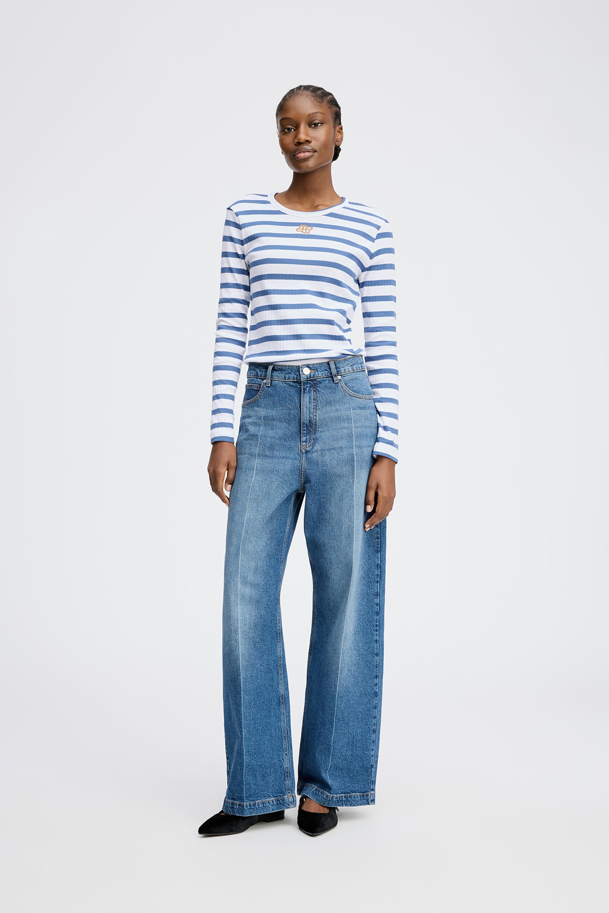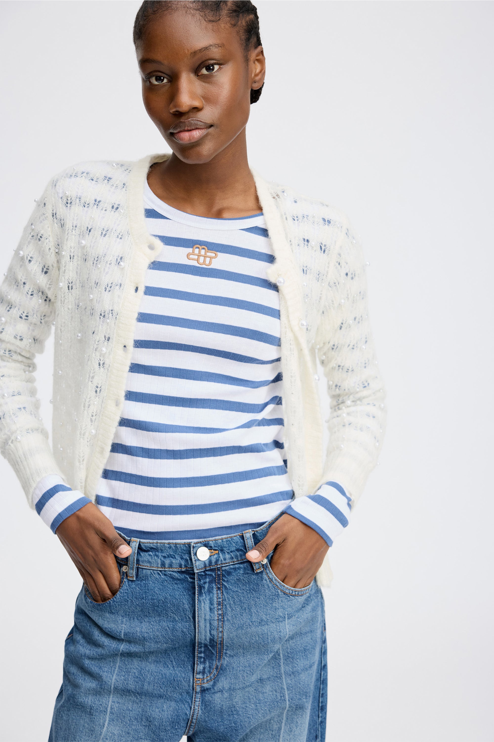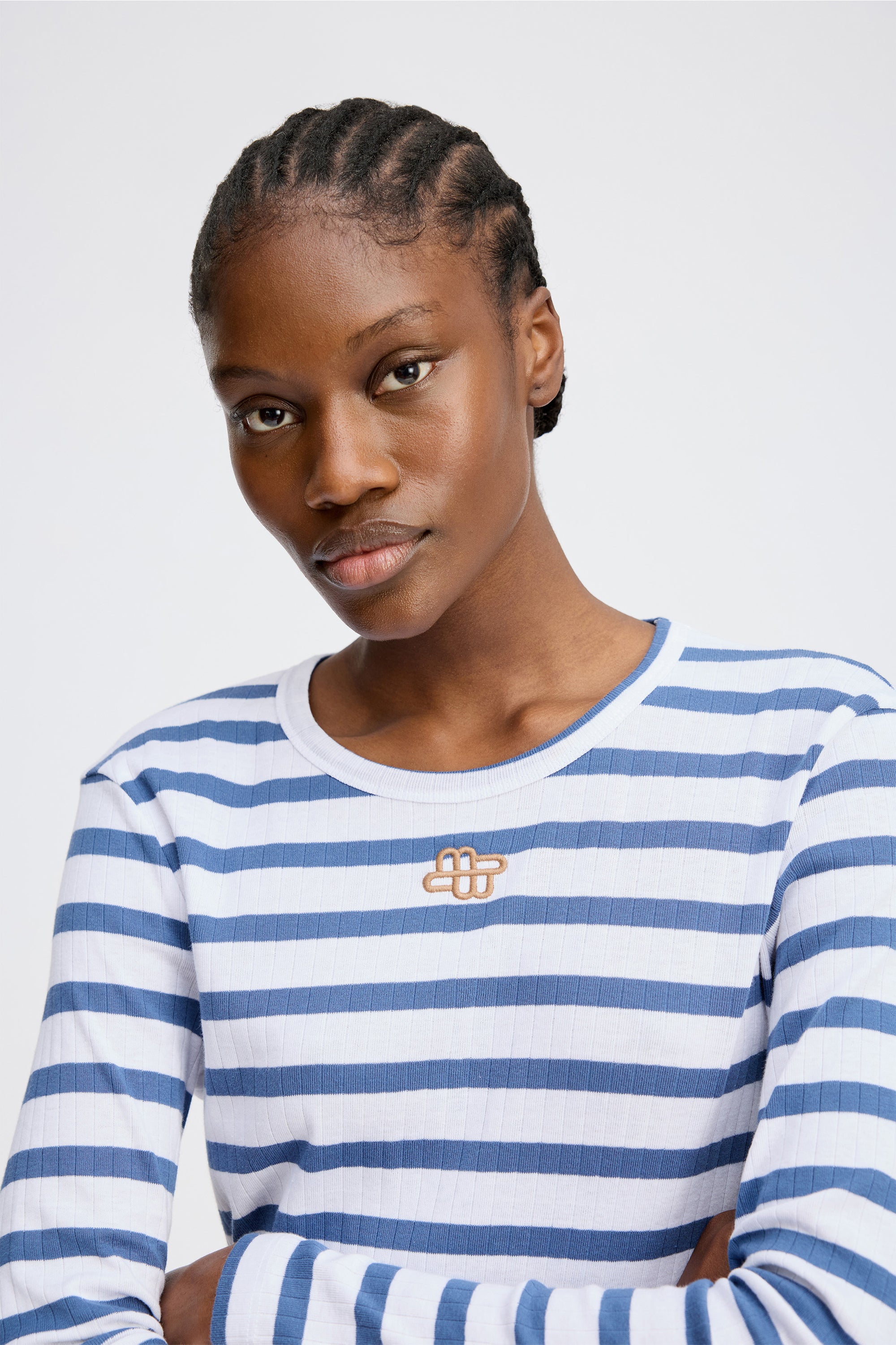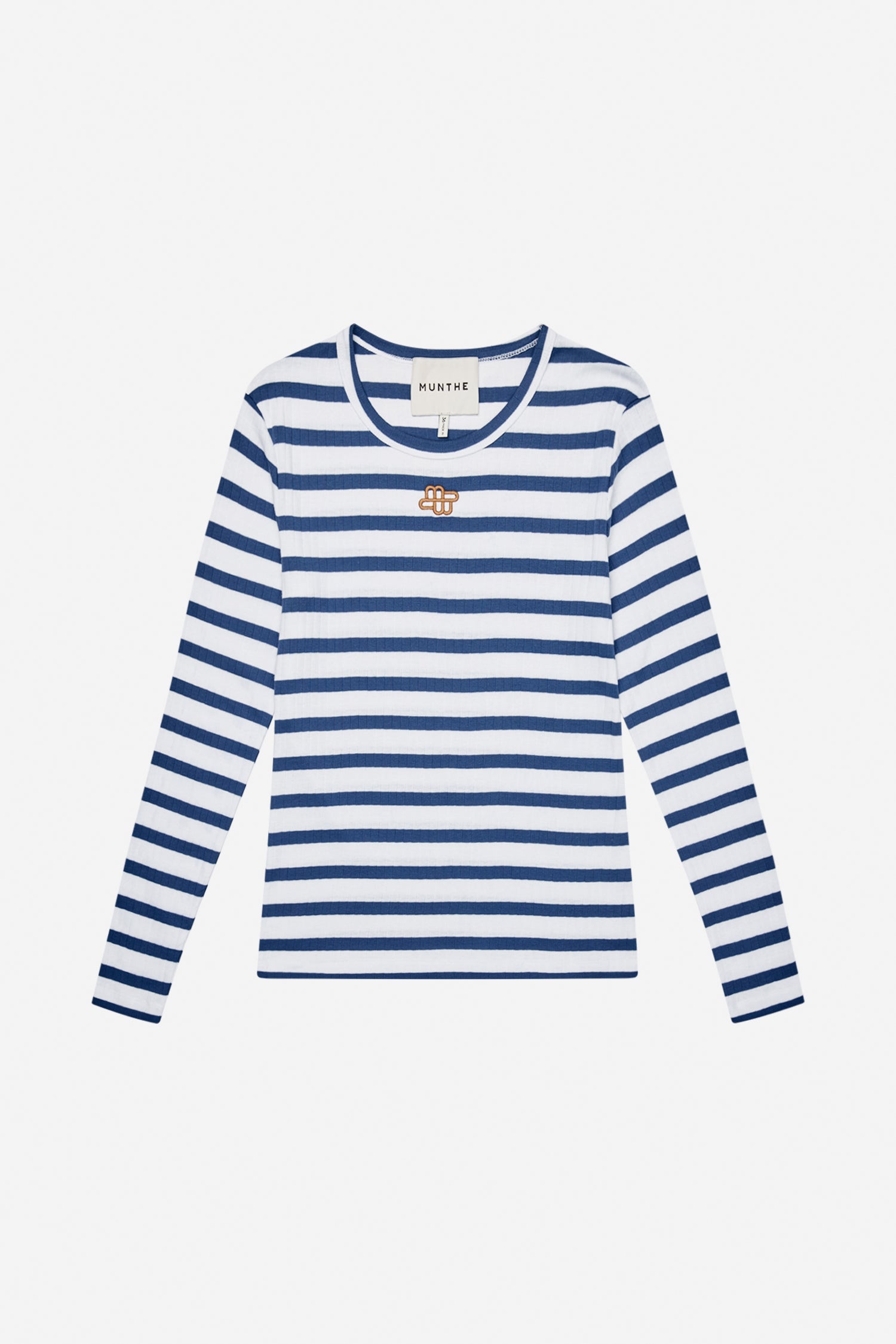 Soft striped T-shirt made of 100% organic cotton featuring an elegant embroidered MUNTHE emblem on the chest. This T-shirt is designed with a close-fitting silhouette, round neckline, long sleeves, and a low shoulder seam.