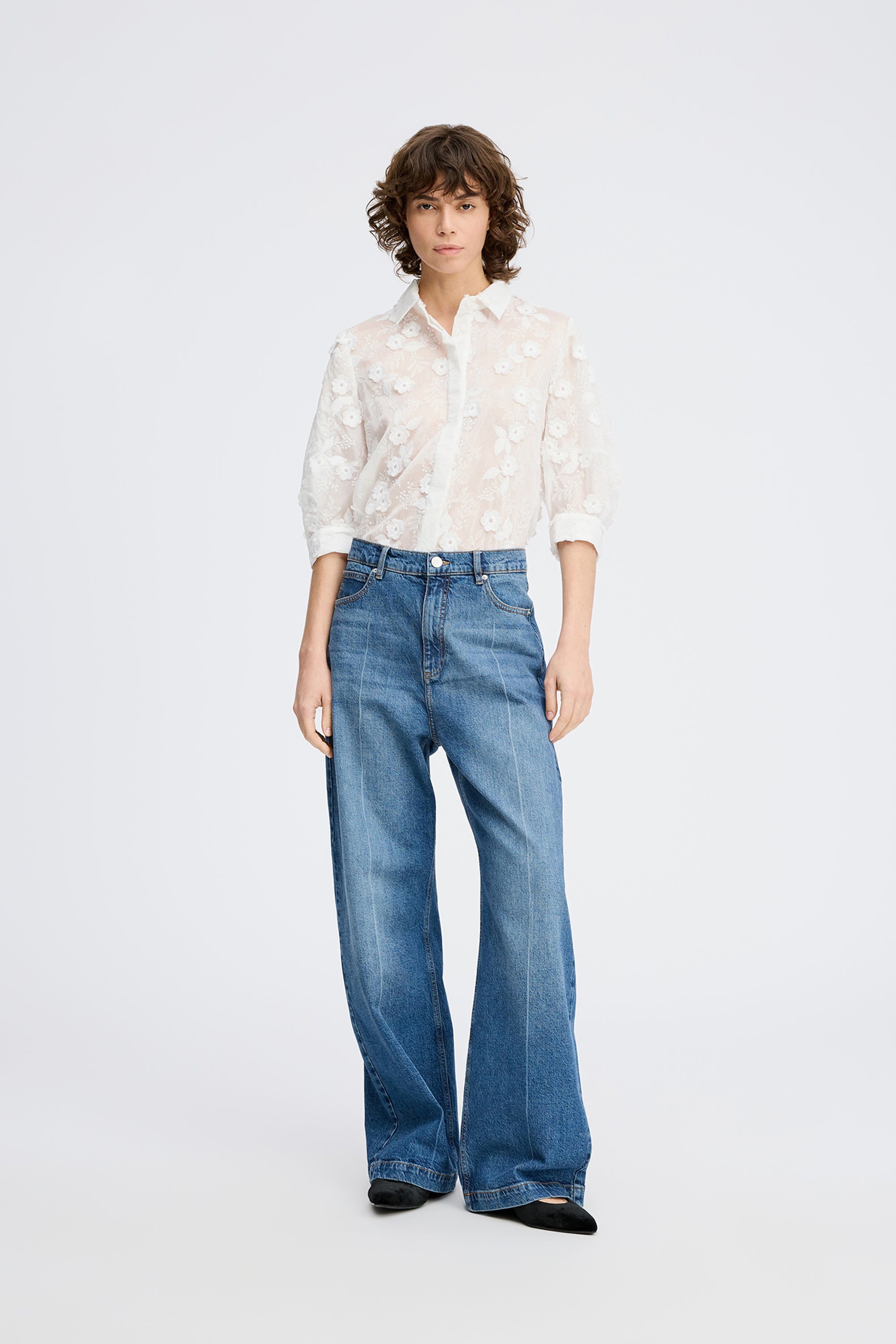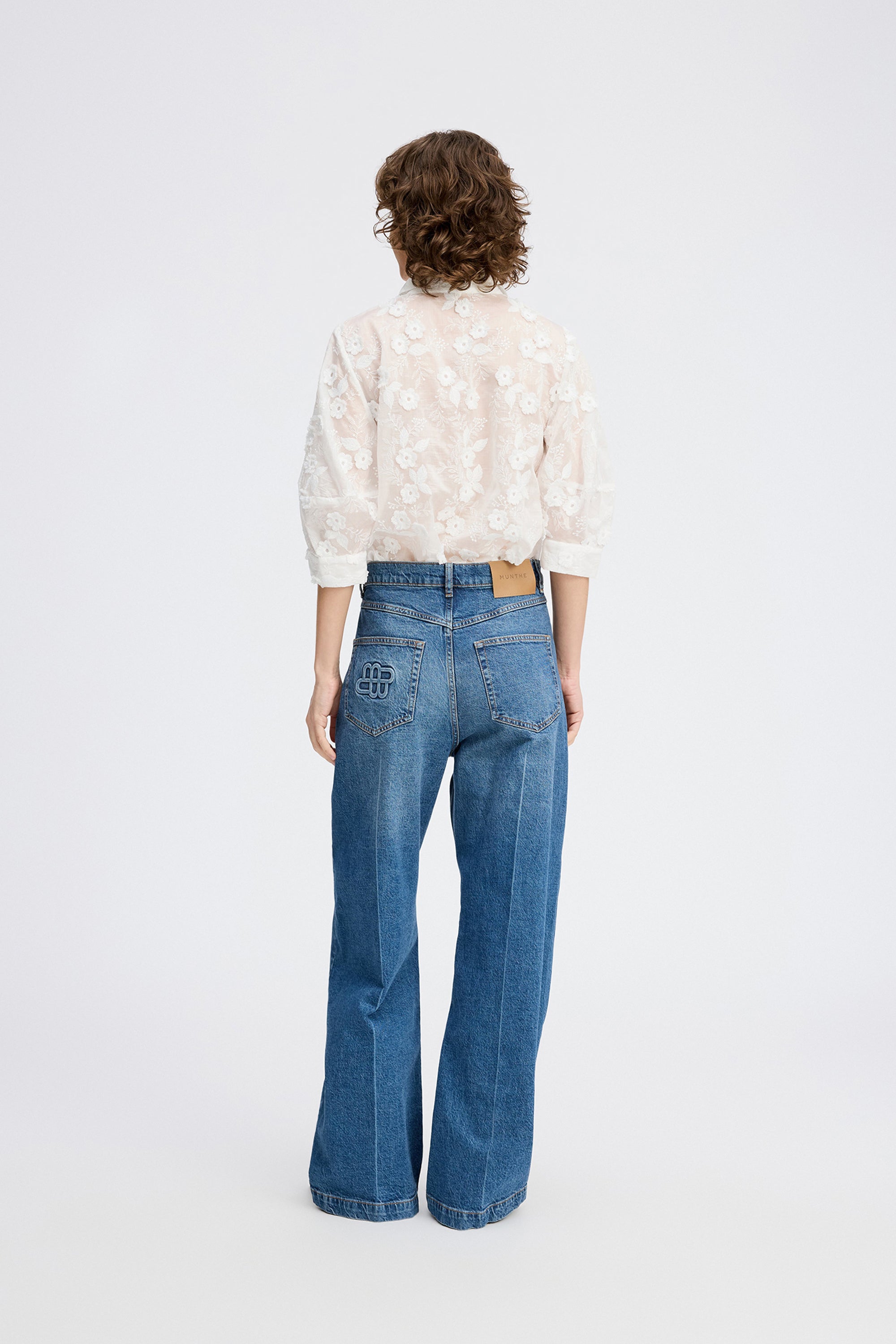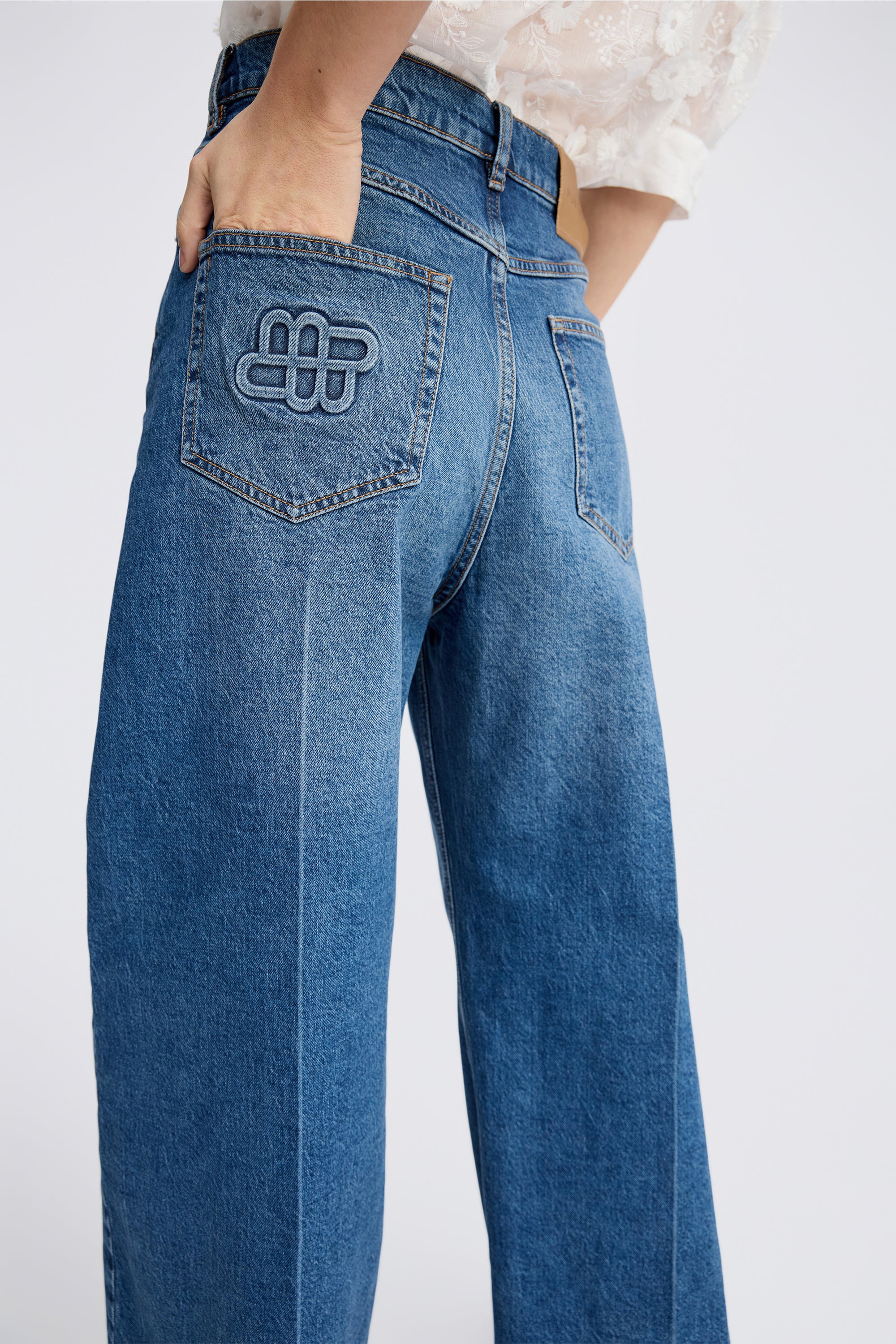 Jeans with beautiful wide legs designed with pleats at the front and back. The trousers feature an elegant MUNTHE emblem embossed on one of the back pockets. They are designed with front and back pockets and are fastened with a zipper and a single button.