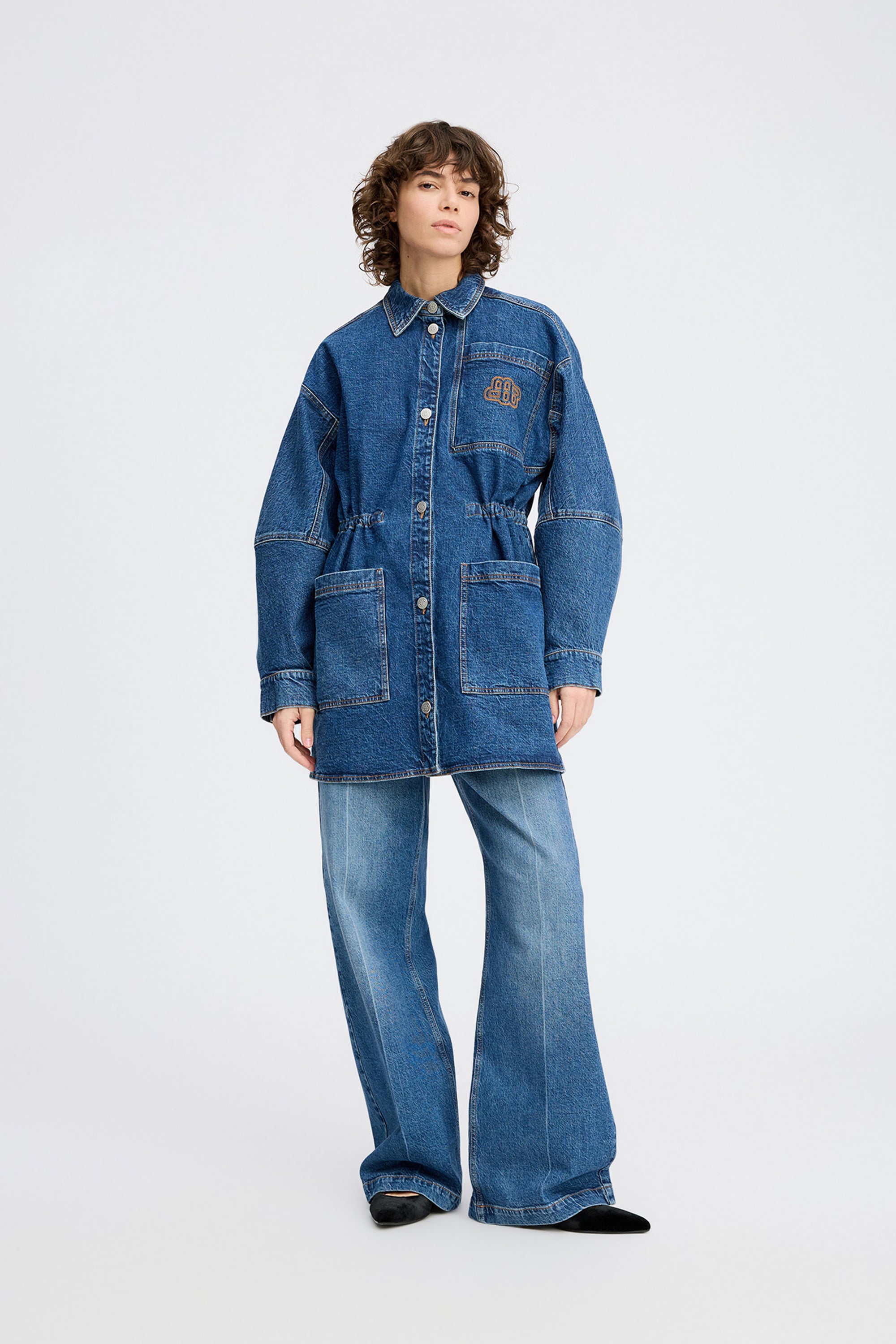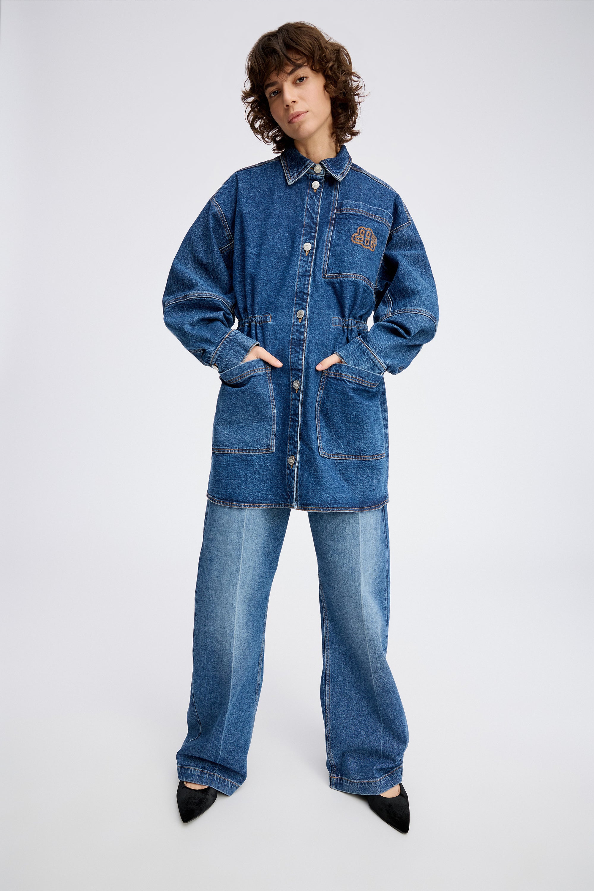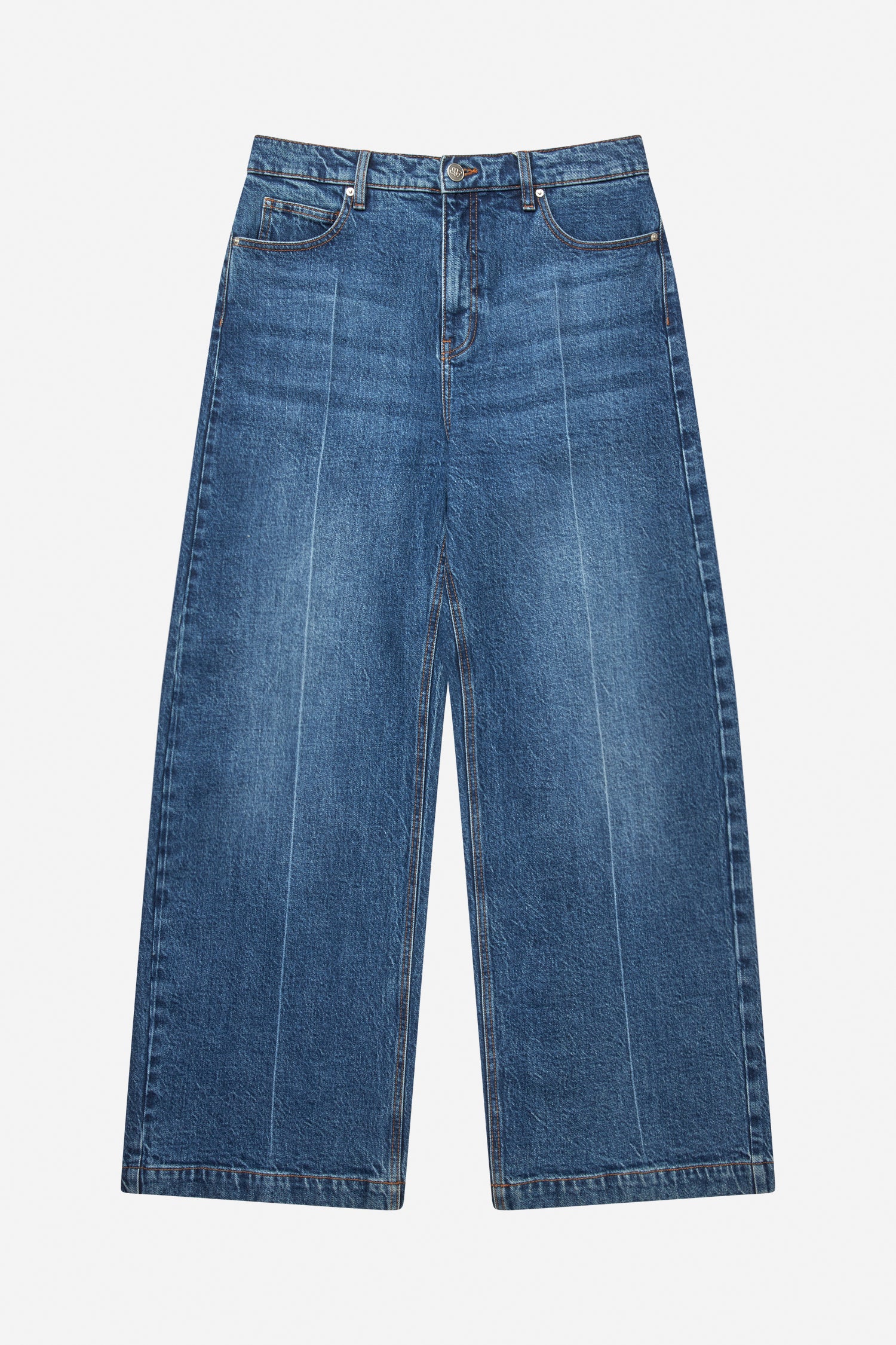 Jeans with beautiful wide legs designed with pleats at the front and back. The trousers feature an elegant MUNTHE emblem embossed on one of the back pockets. They are designed with front and back pockets and are fastened with a zipper and a single button.