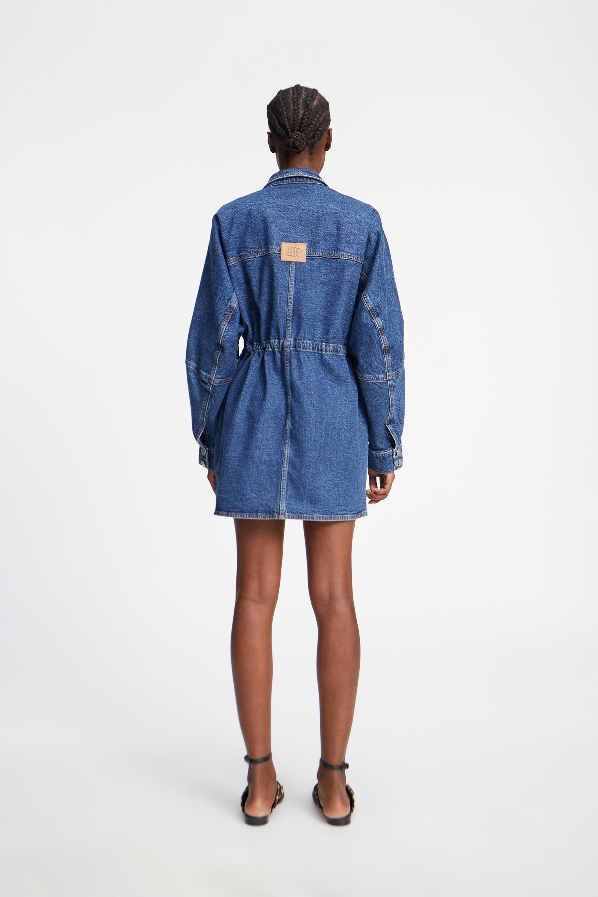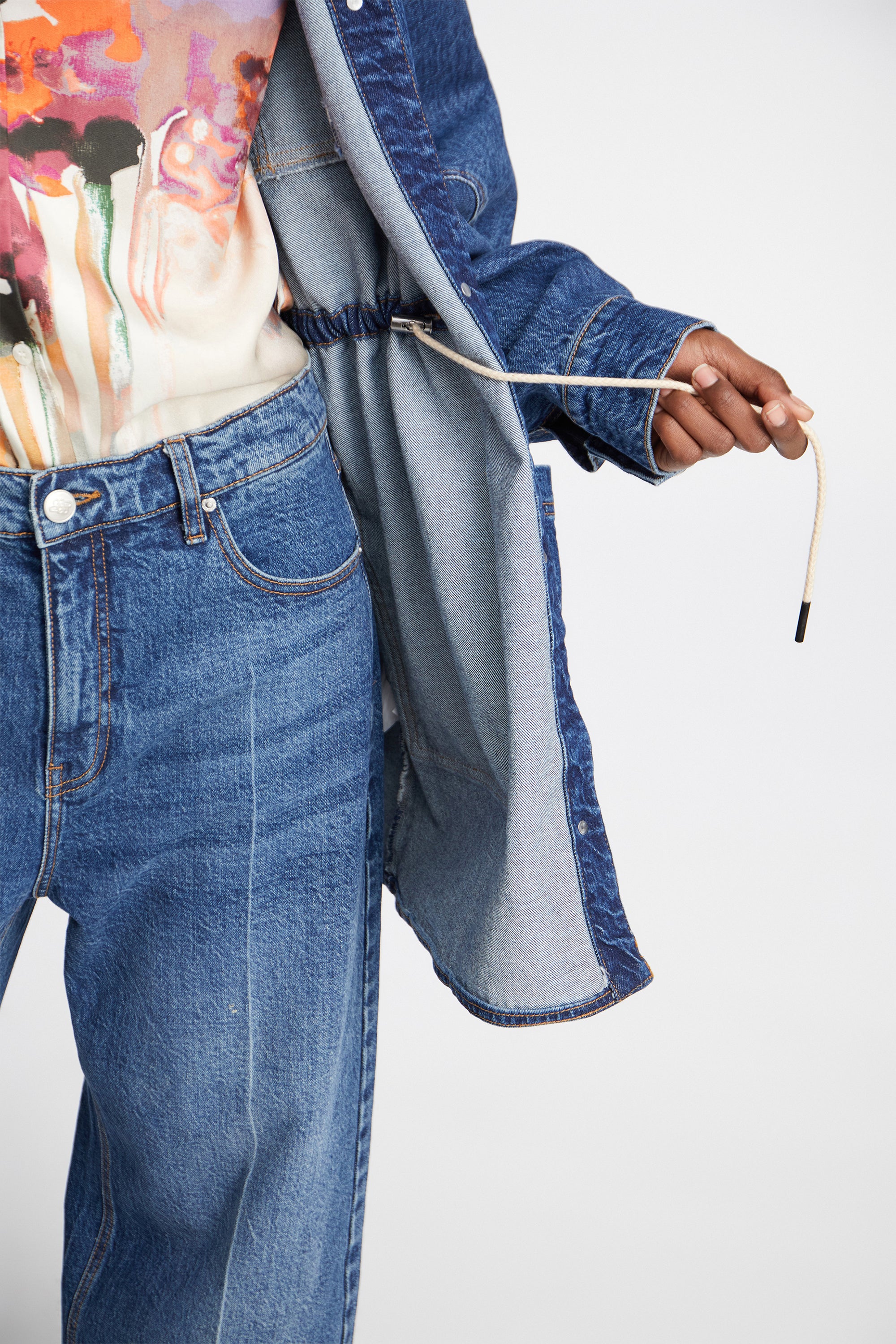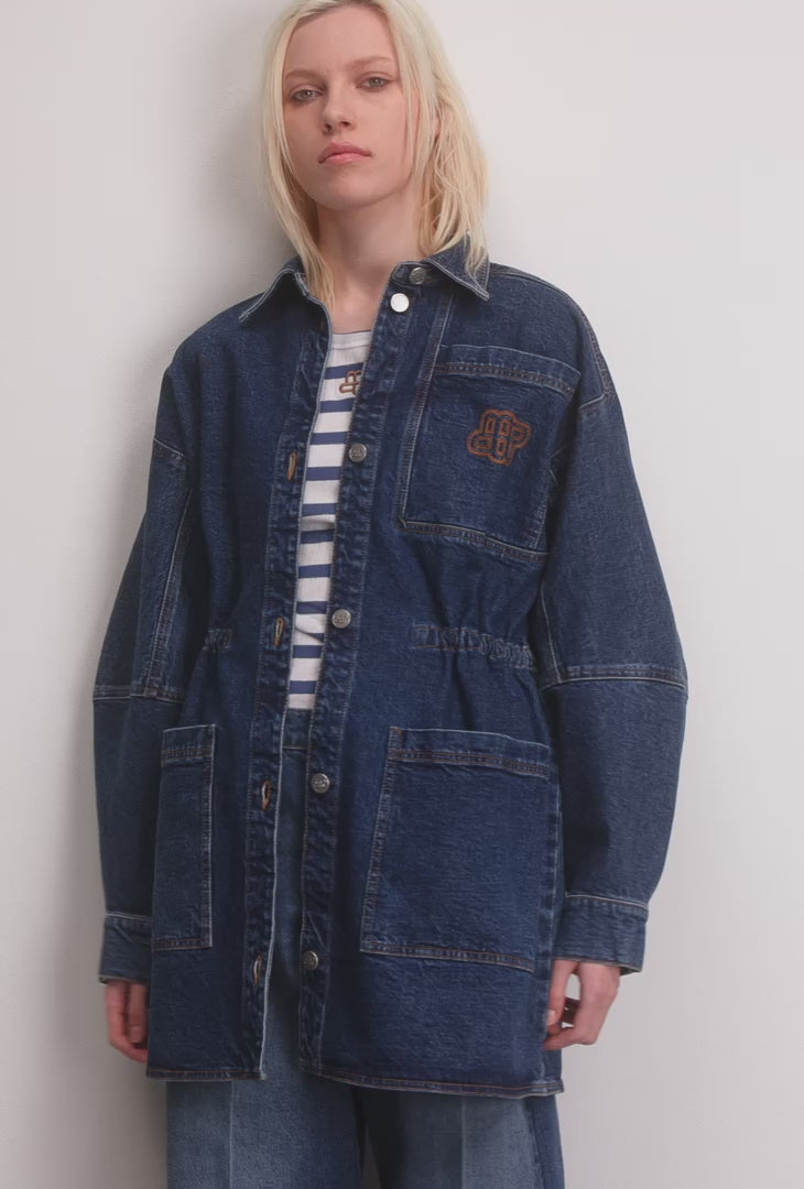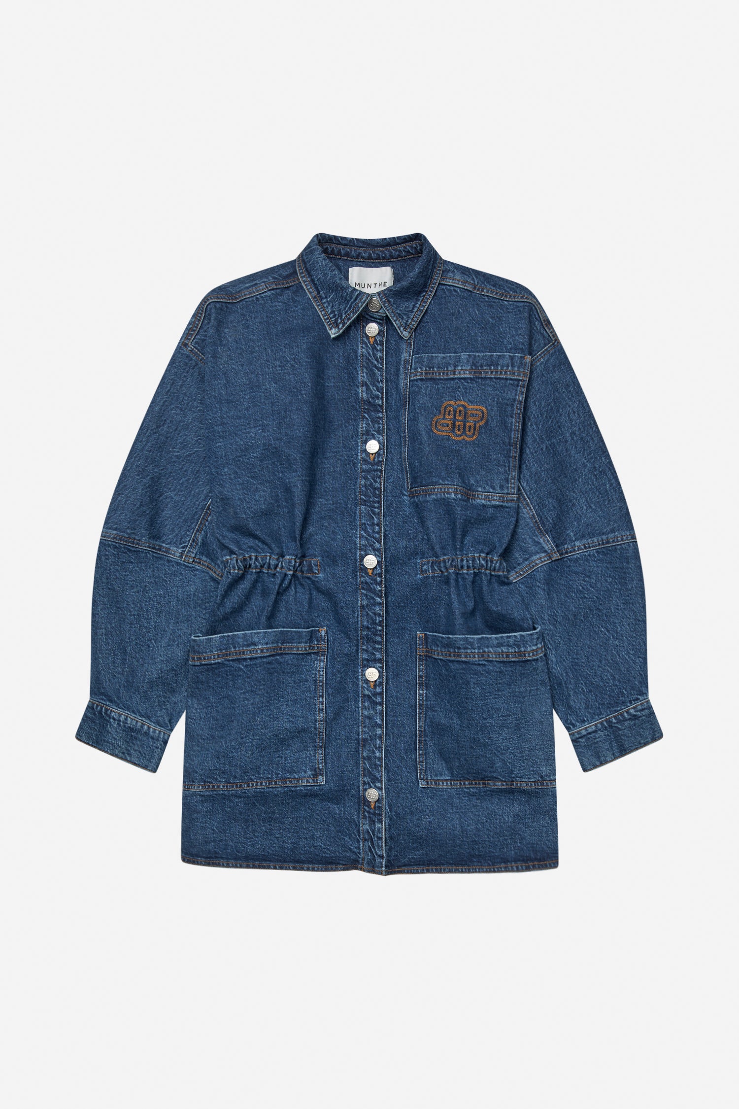 A denim jacket with stylish oversized pockets and a beautiful embroidered MUNTHE emblem on the chest. The jacket is designed to allow styling for a loose look or a more fitted silhouette using elegant, hidden white drawstrings.