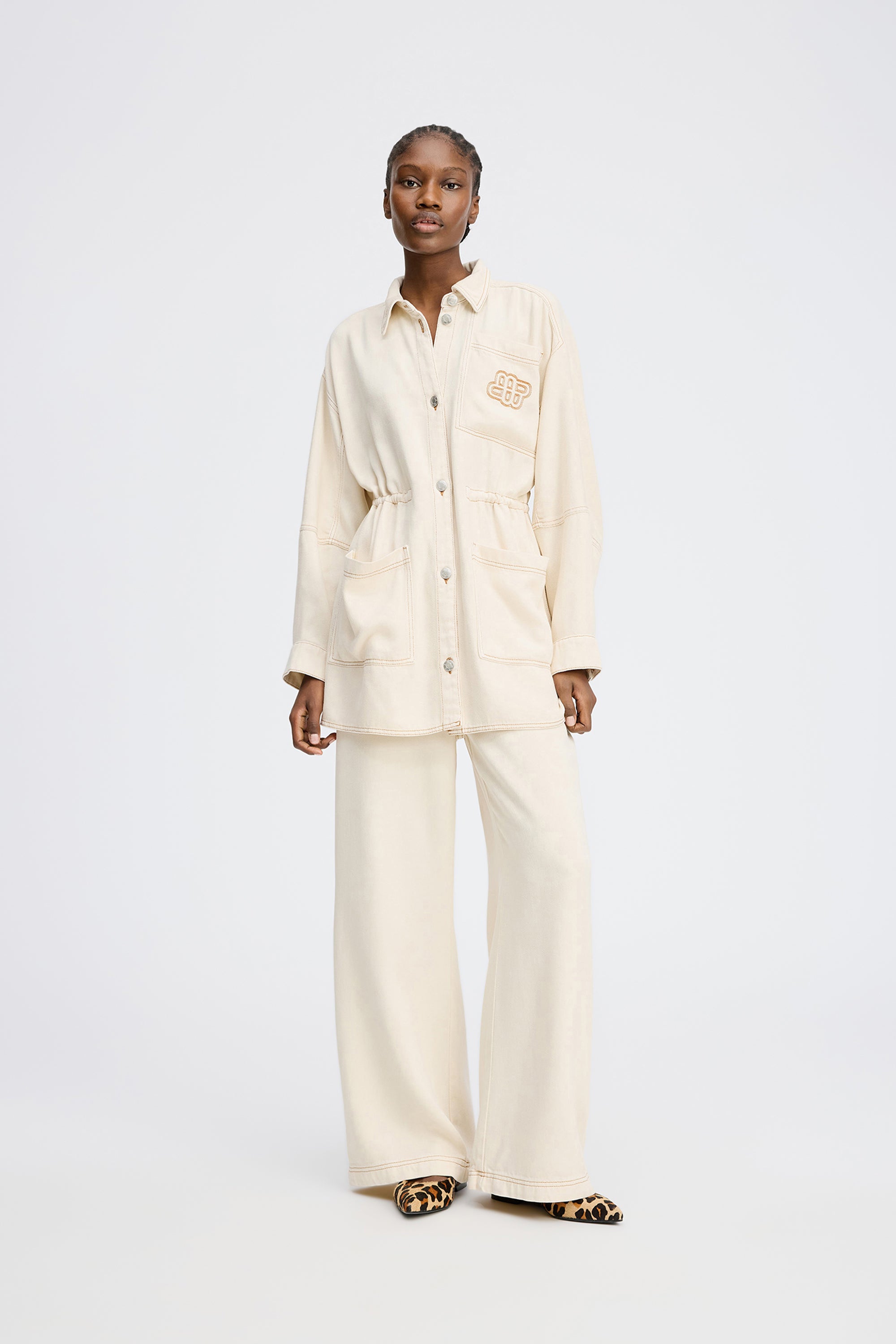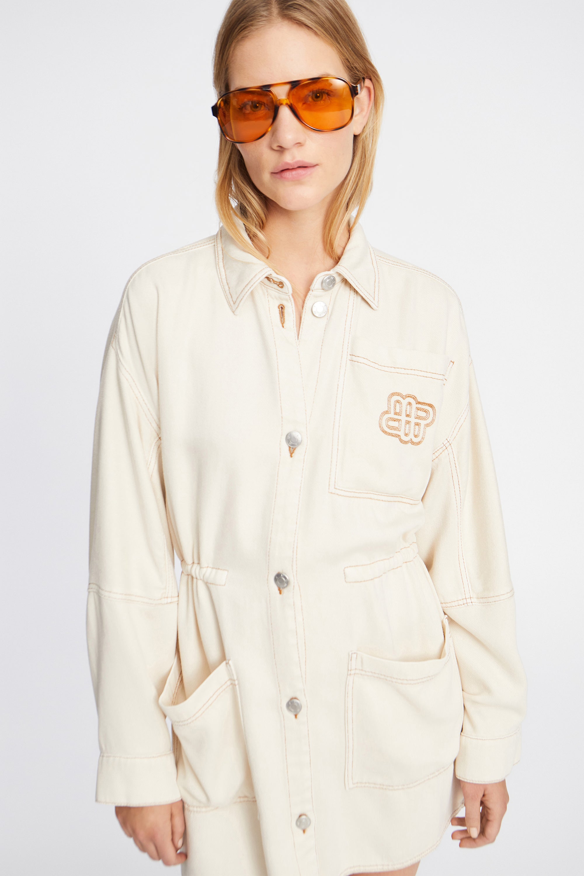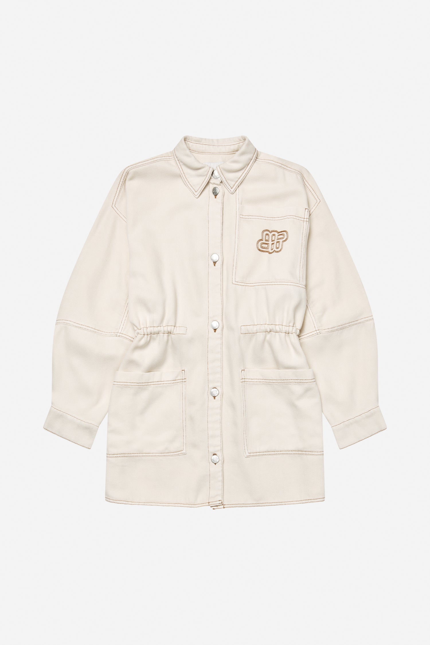 A denim jacket with stylish oversized pockets and a beautiful embroidered MUNTHE emblem on the chest. The jacket is designed to allow styling for a loose look or a more fitted silhouette using elegant, hidden white drawstrings.