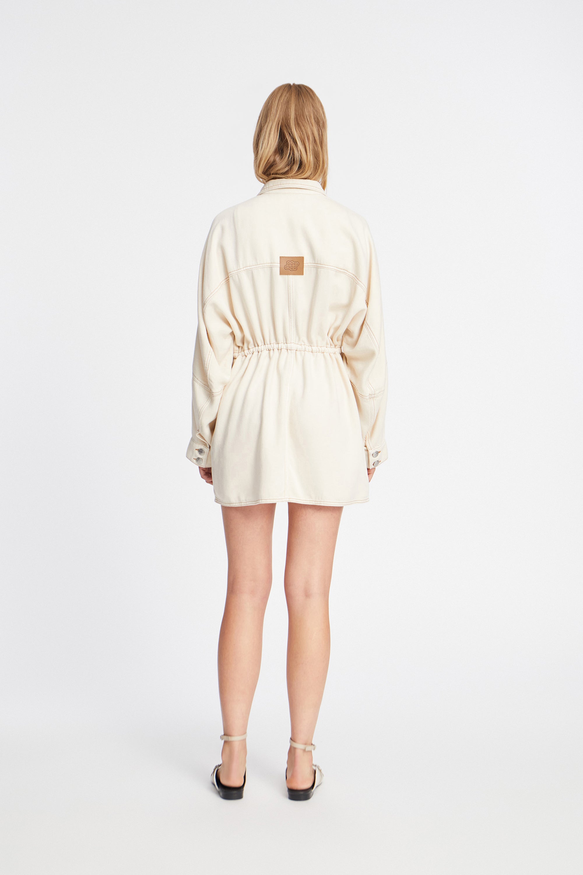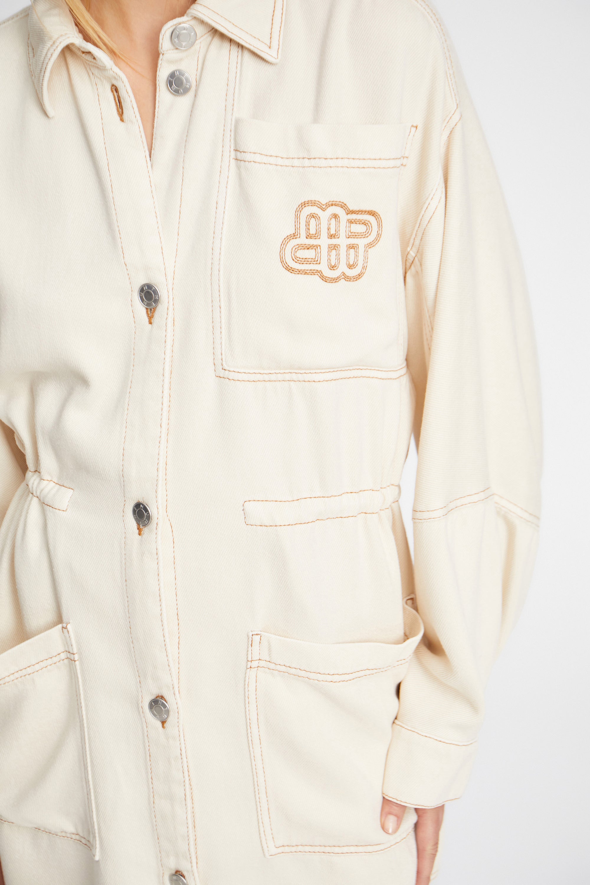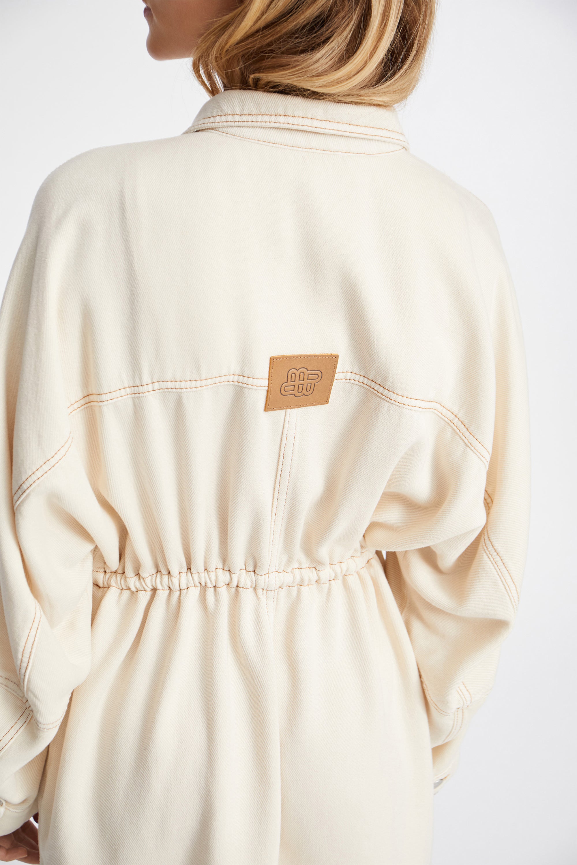 A denim jacket with stylish oversized pockets and a beautiful embroidered MUNTHE emblem on the chest. The jacket is designed to allow styling for a loose look or a more fitted silhouette using elegant, hidden white drawstrings.