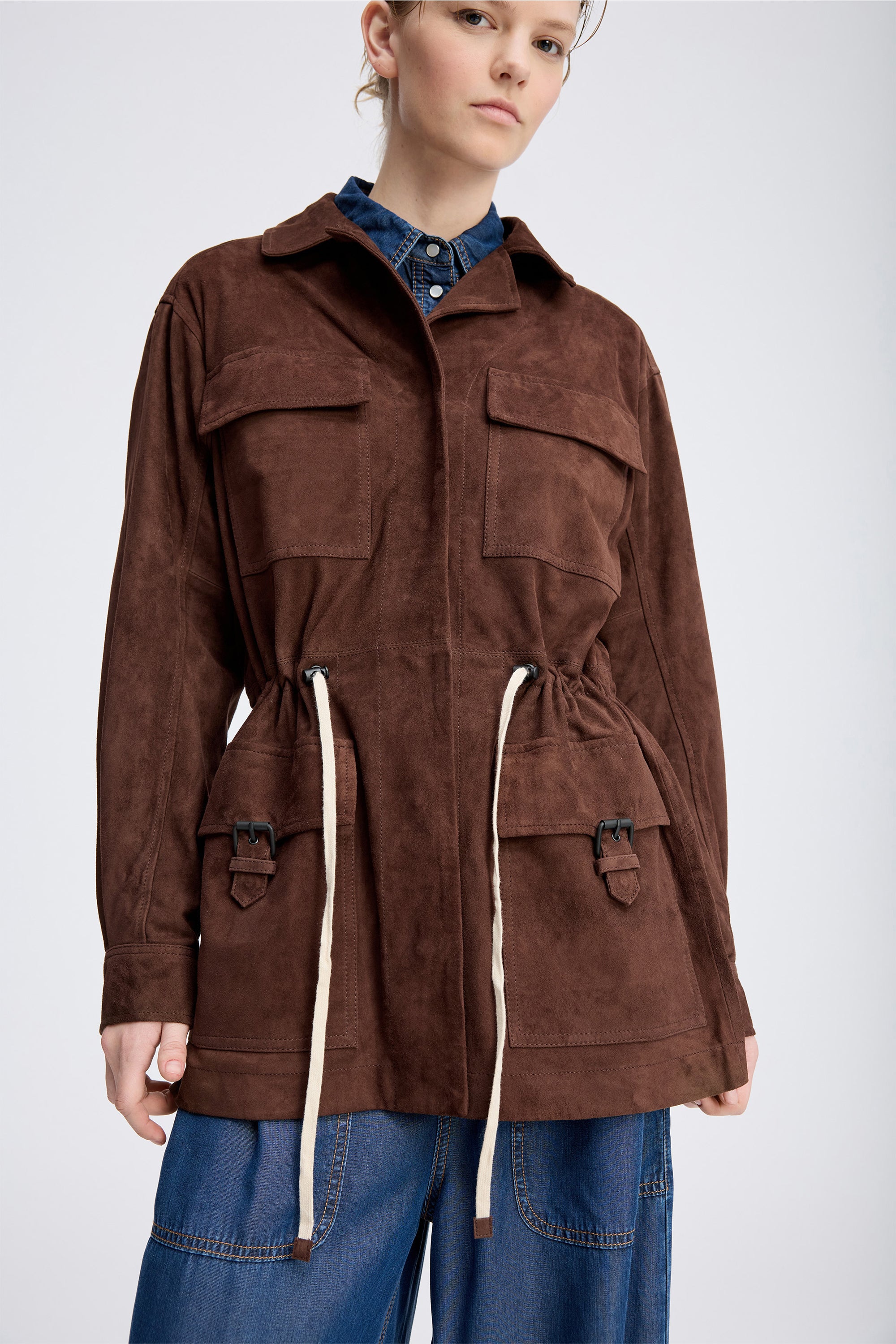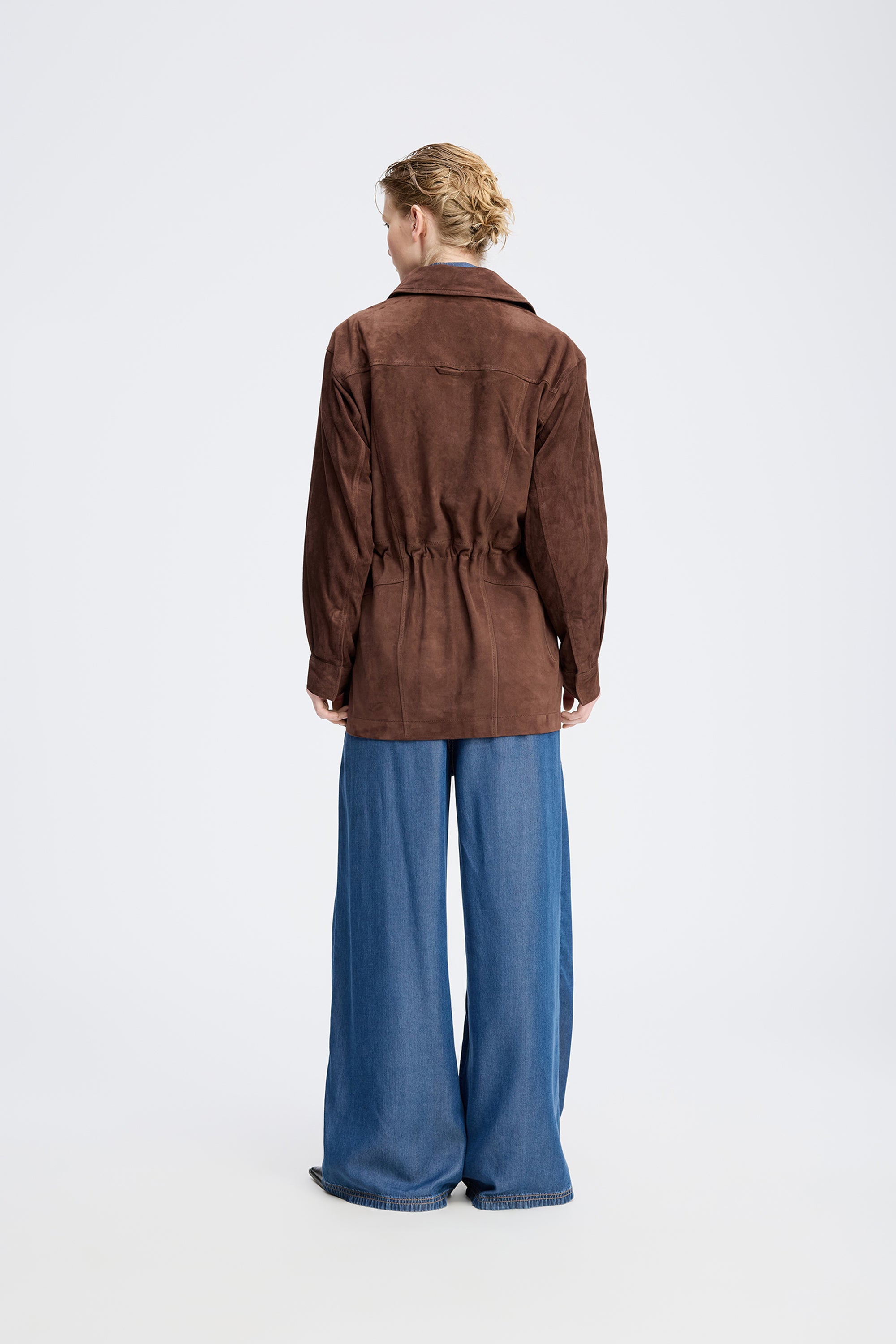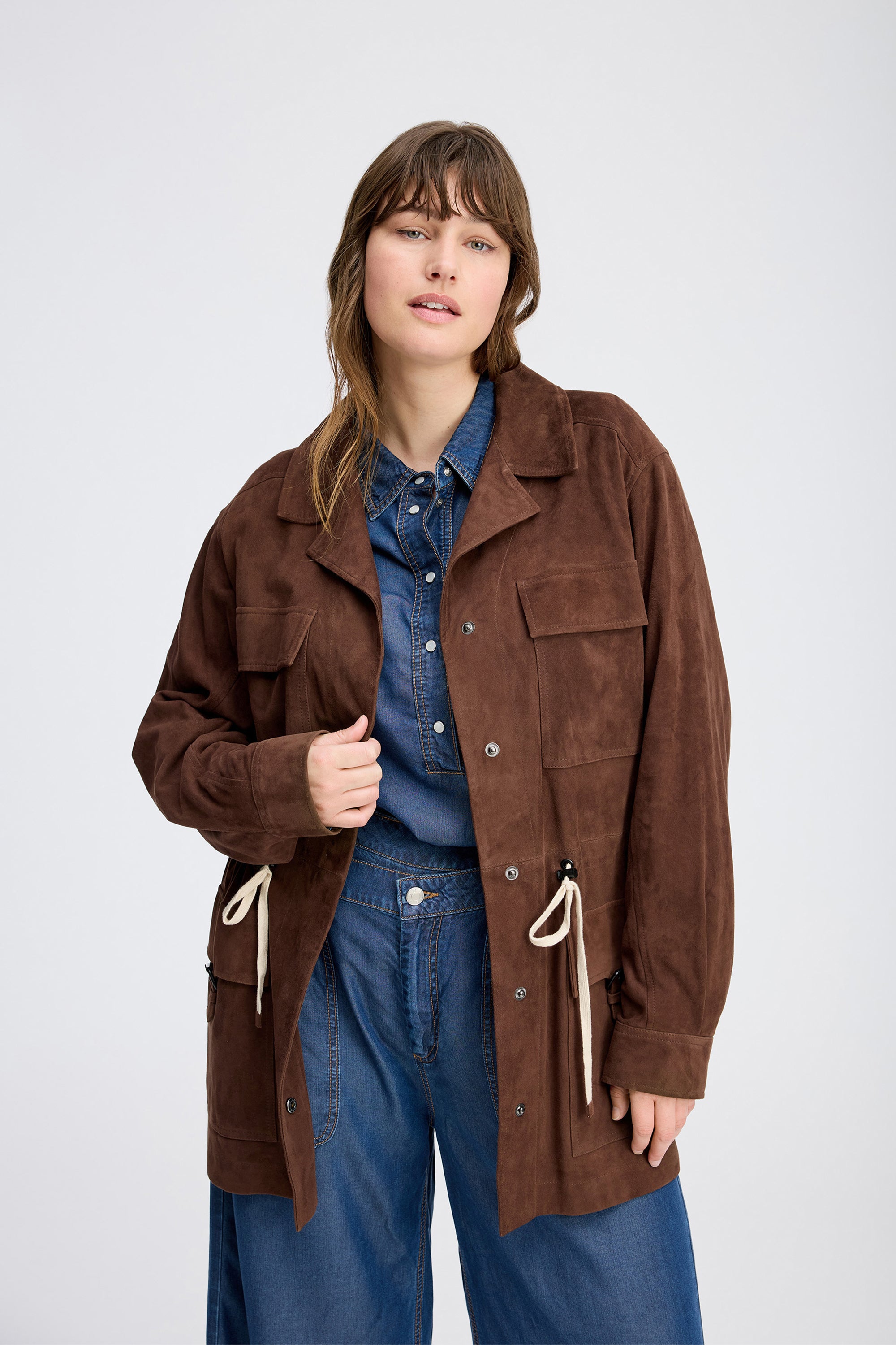 A suede leather jacket with stylish oversized pockets, where the lower ones can elegantly be closed with a buckle. The jacket is designed with the option to style it for a loose look or a more fitted silhouette using delicate white strings.