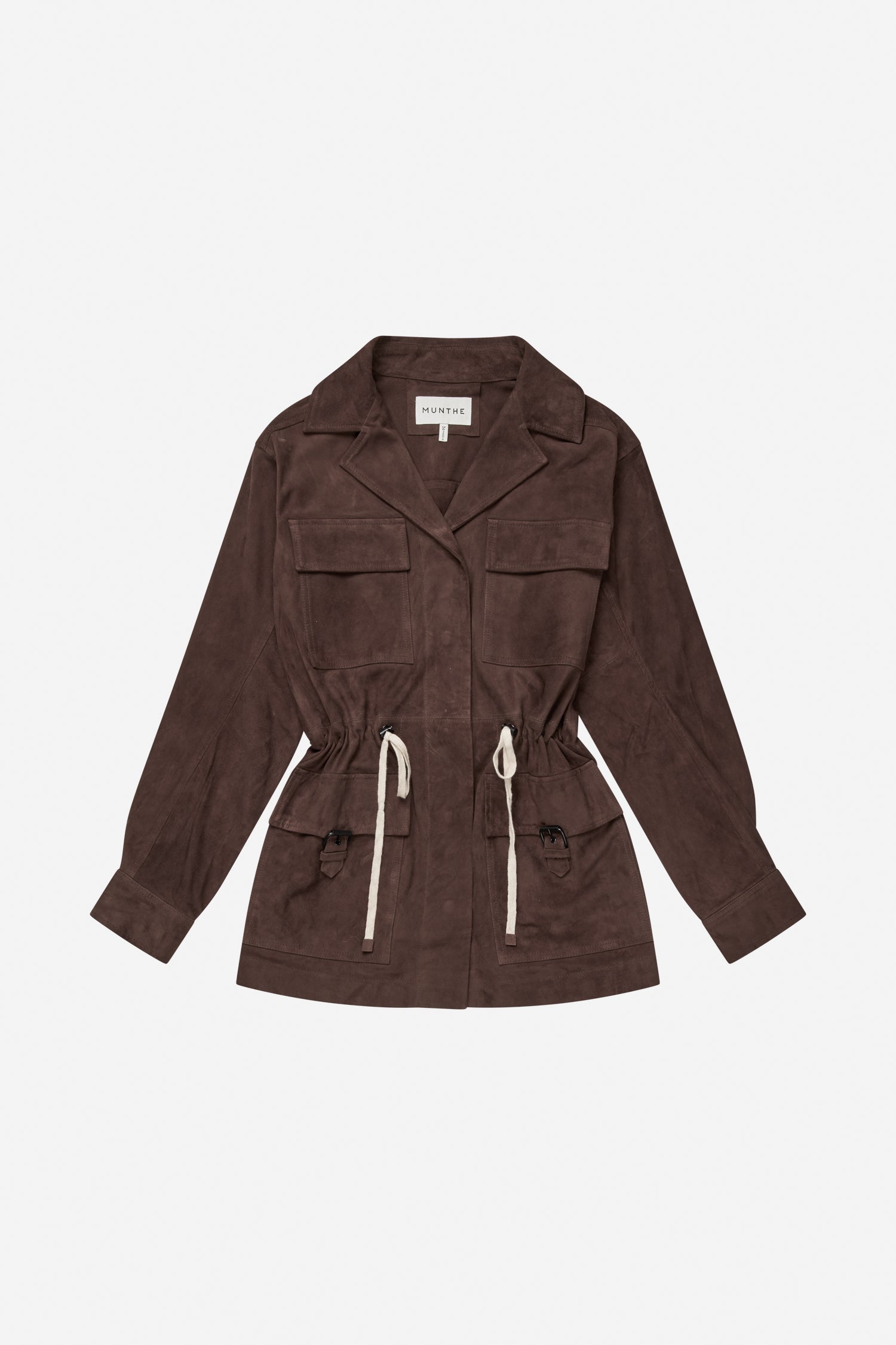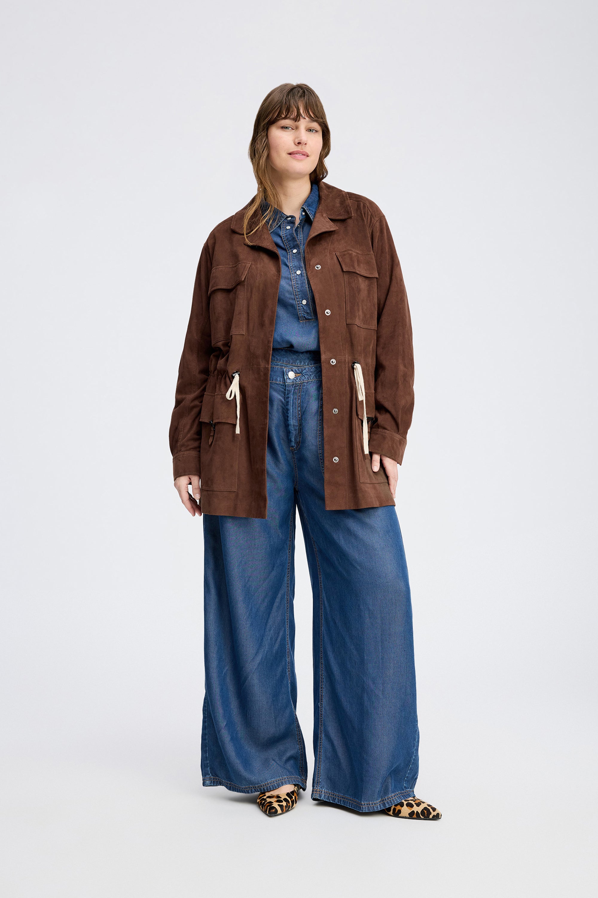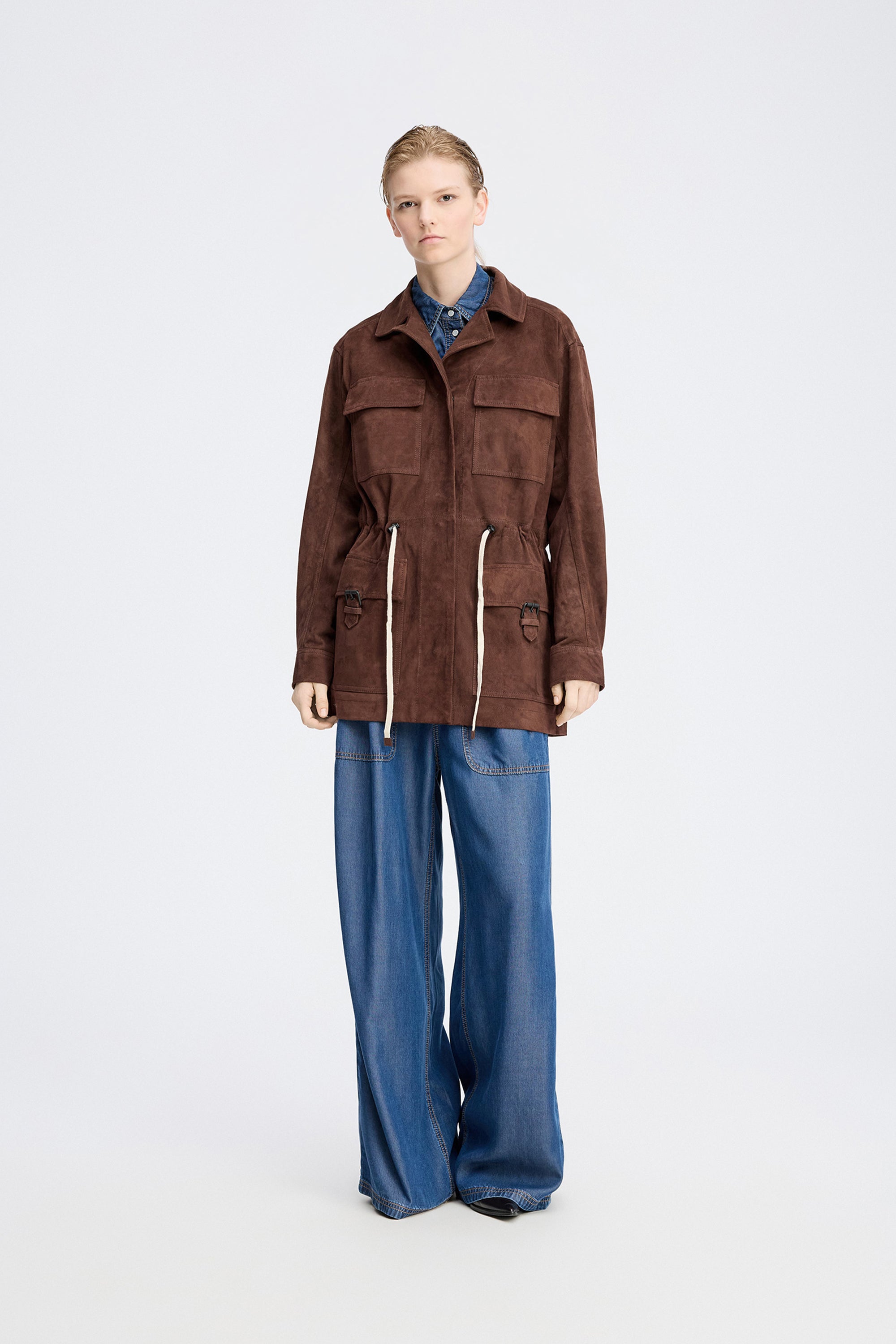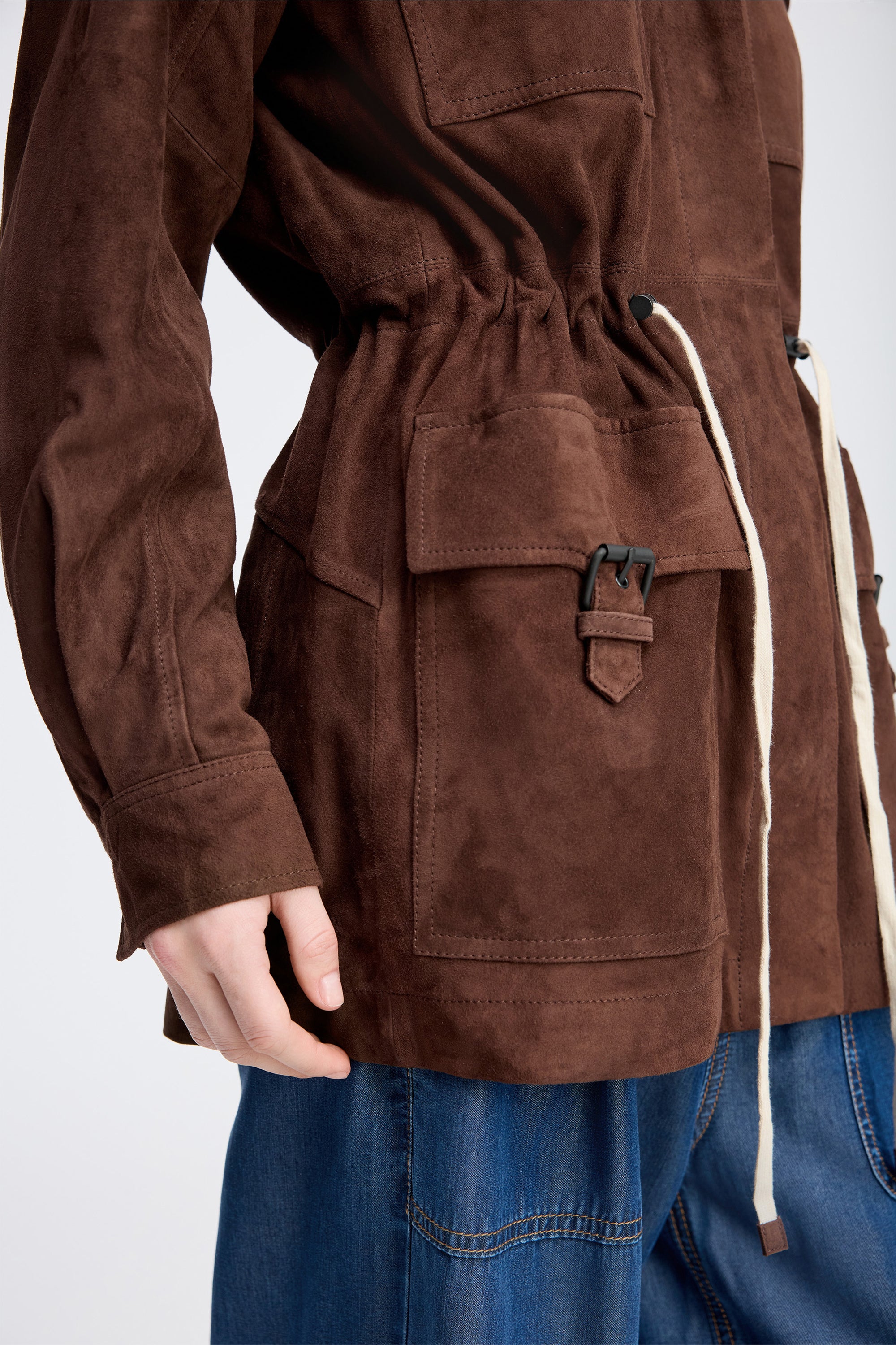 A suede leather jacket with stylish oversized pockets, where the lower ones can elegantly be closed with a buckle. The jacket is designed with the option to style it for a loose look or a more fitted silhouette using delicate white strings.
