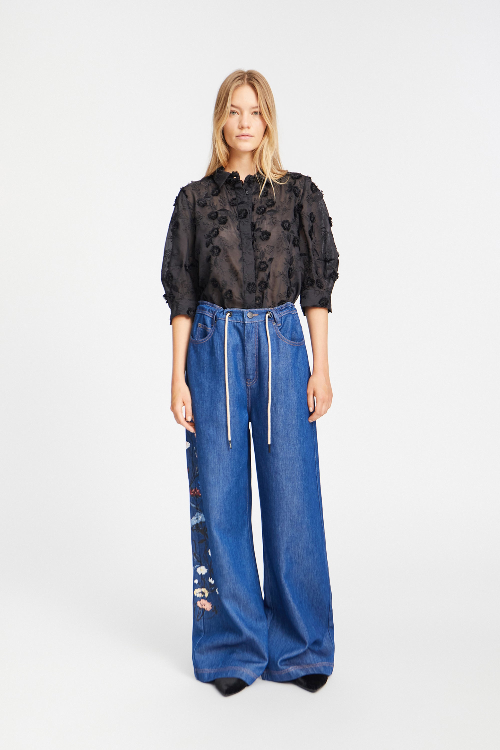 A beautiful shirt with delicate floral appliqués. The shirt features a button closure, semi-short sleeves that stop approximately below the elbow, and is designed with a slight puff.