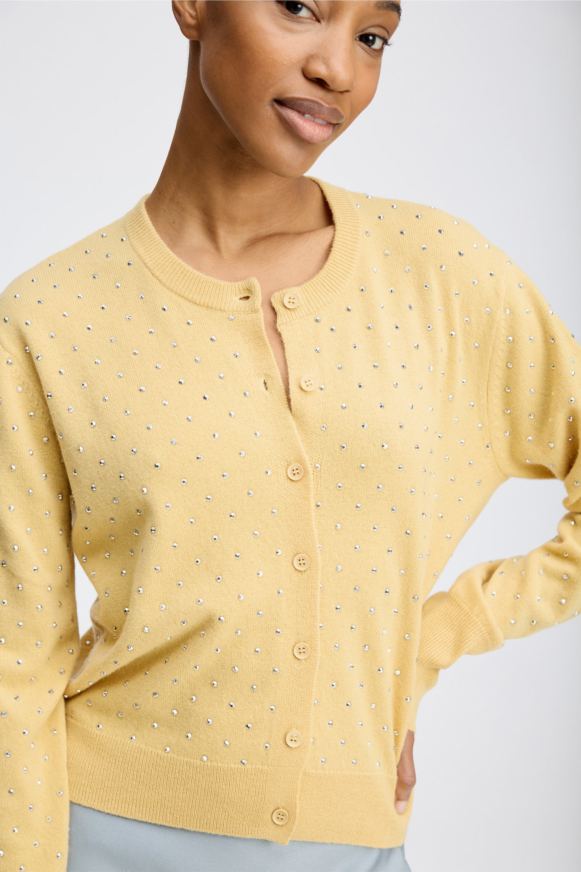 Beautiful, soft cardigan with elegant silver-colored studs. The cardigan features a classic round neckline, long sleeves, and a front button closure.