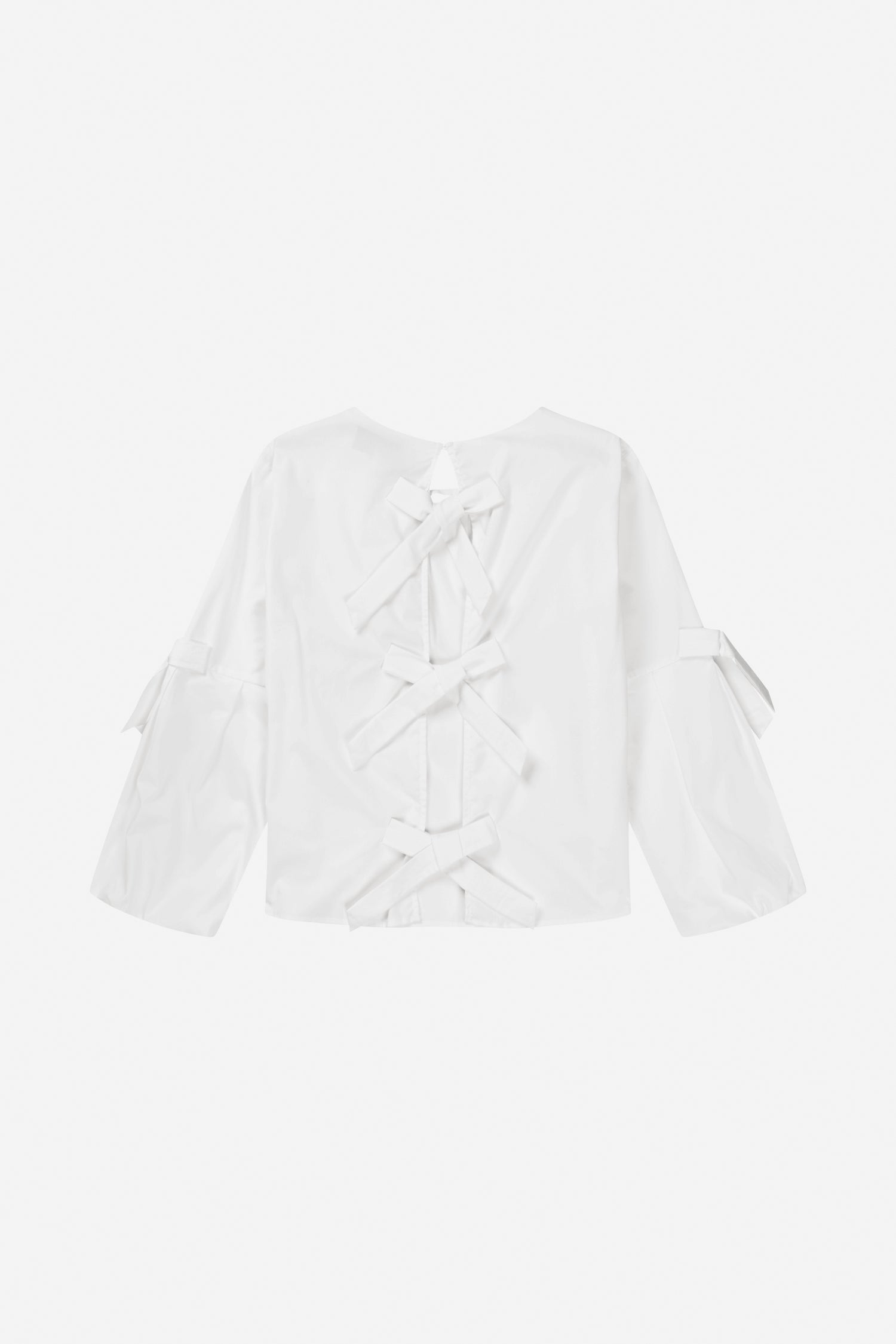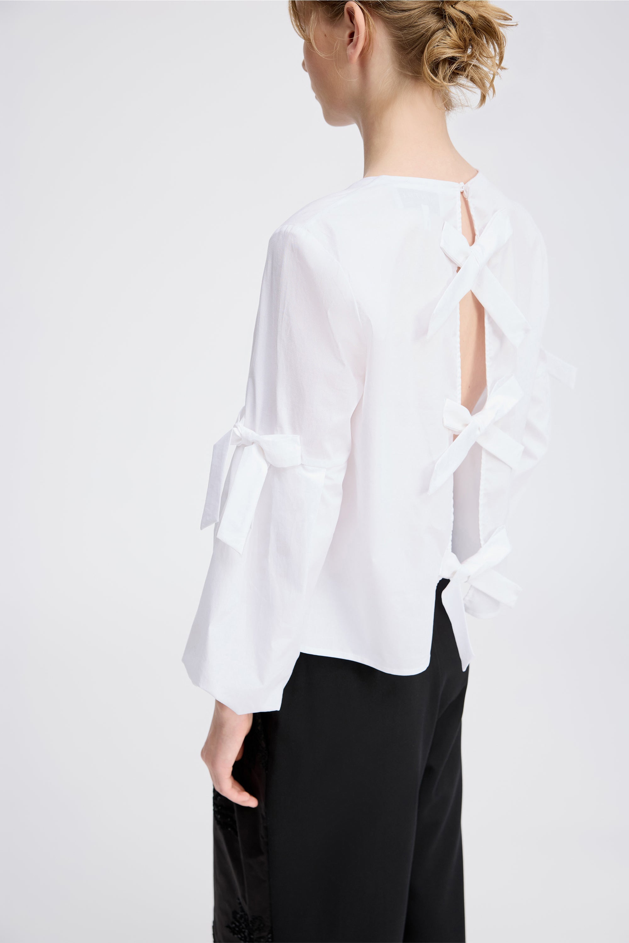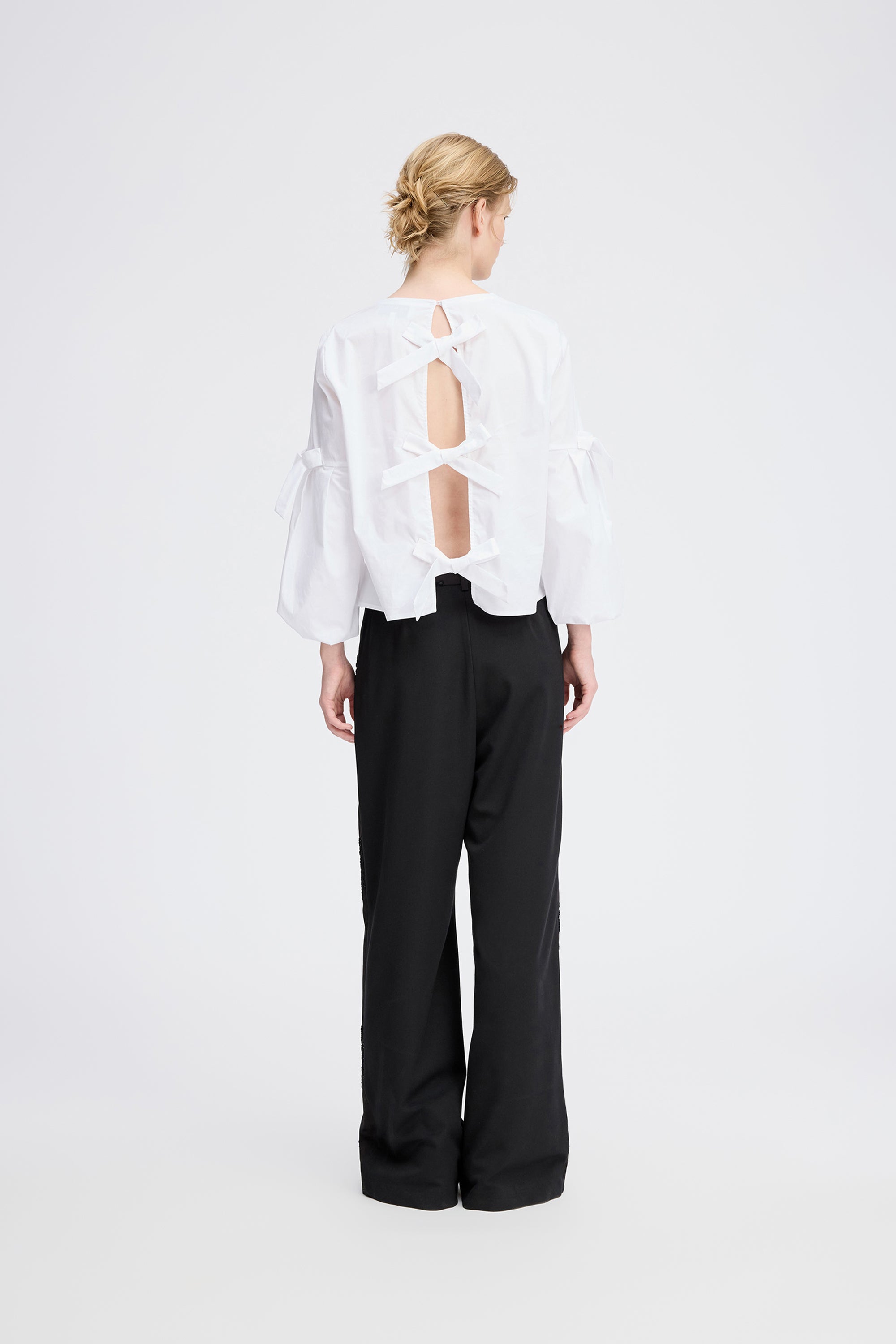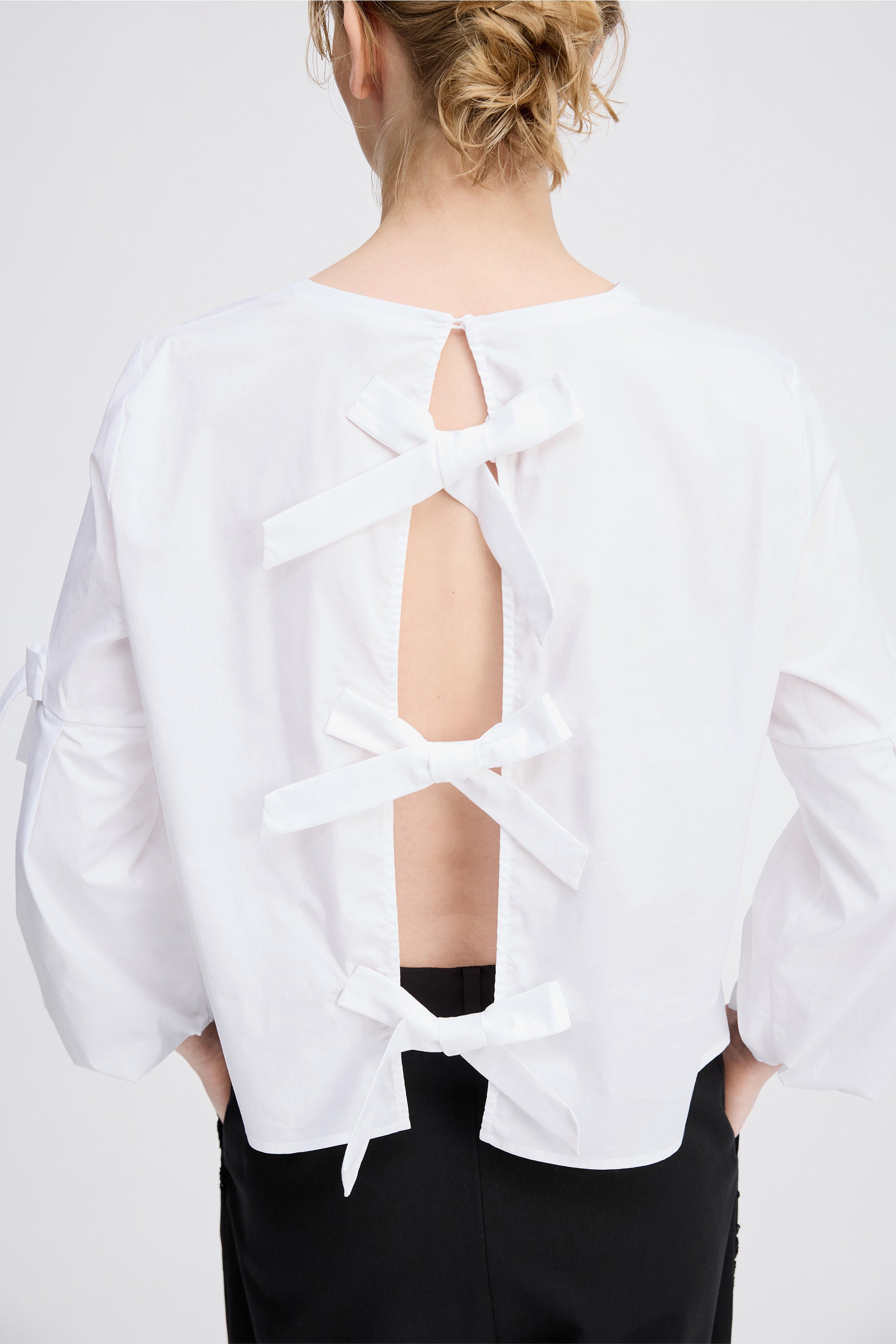Elegant blouse with delicate bow details on the sleeves and back. The blouse features a beautiful gathered detail at the neckline and sleeves and is designed with an open back, fastened with three beautiful bows.