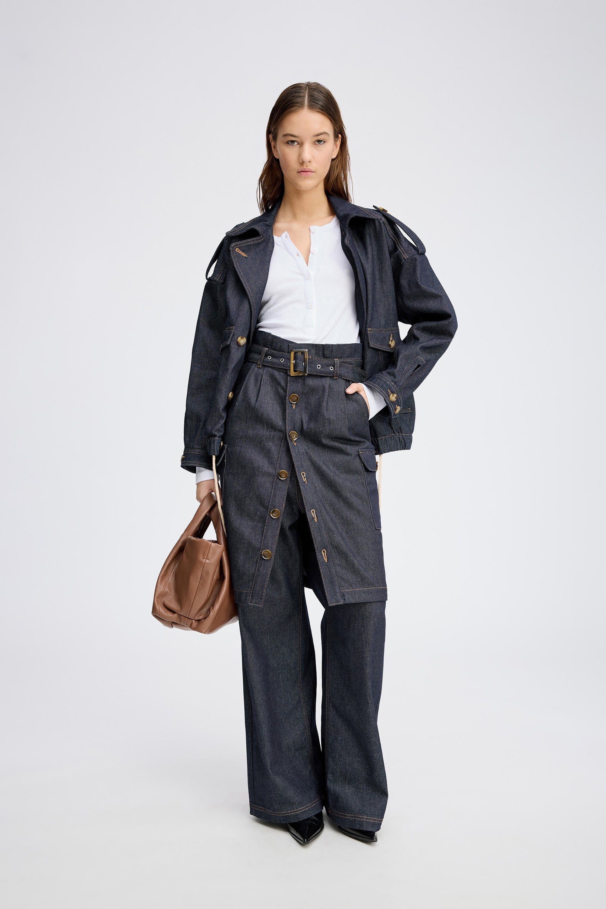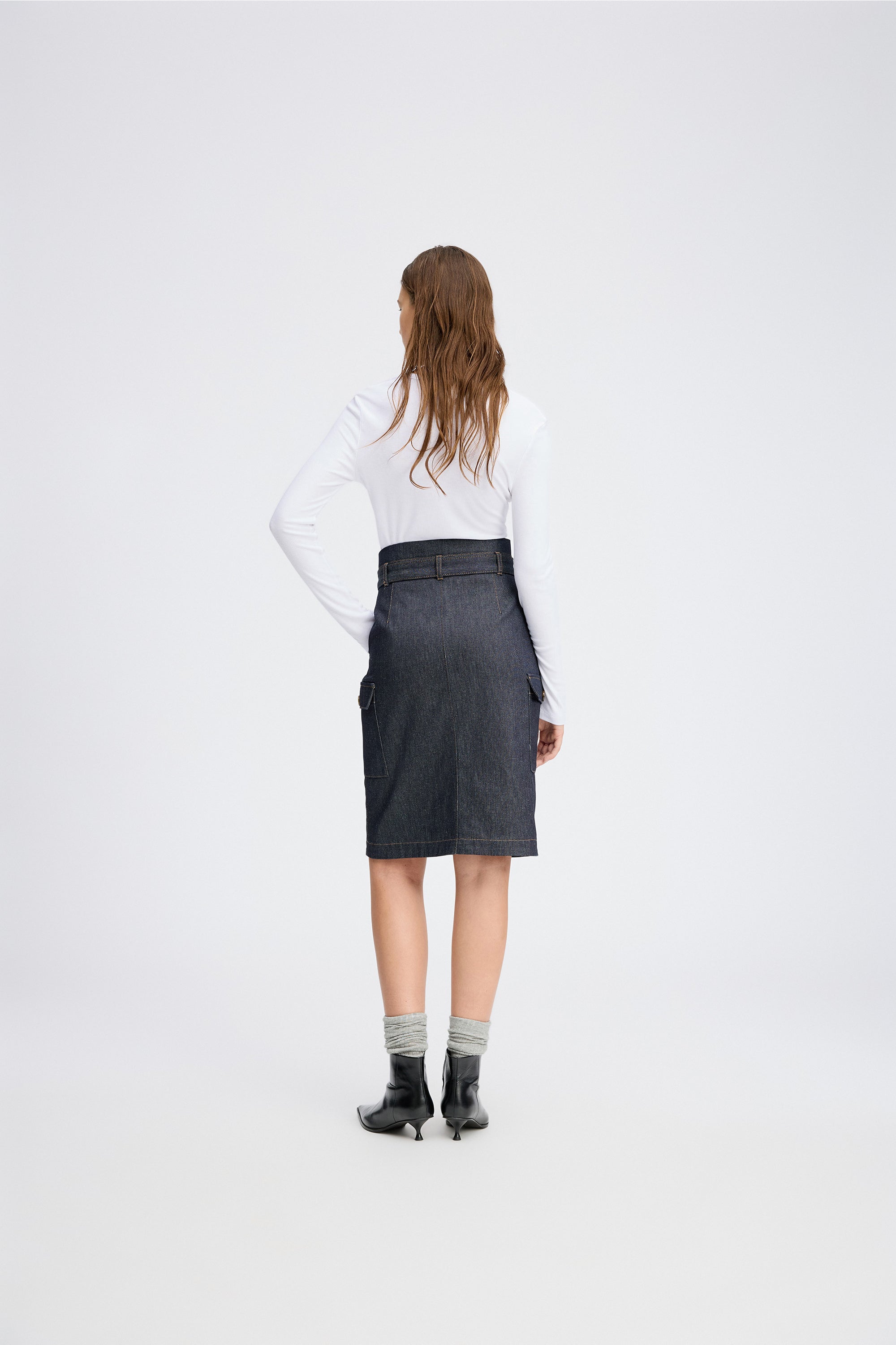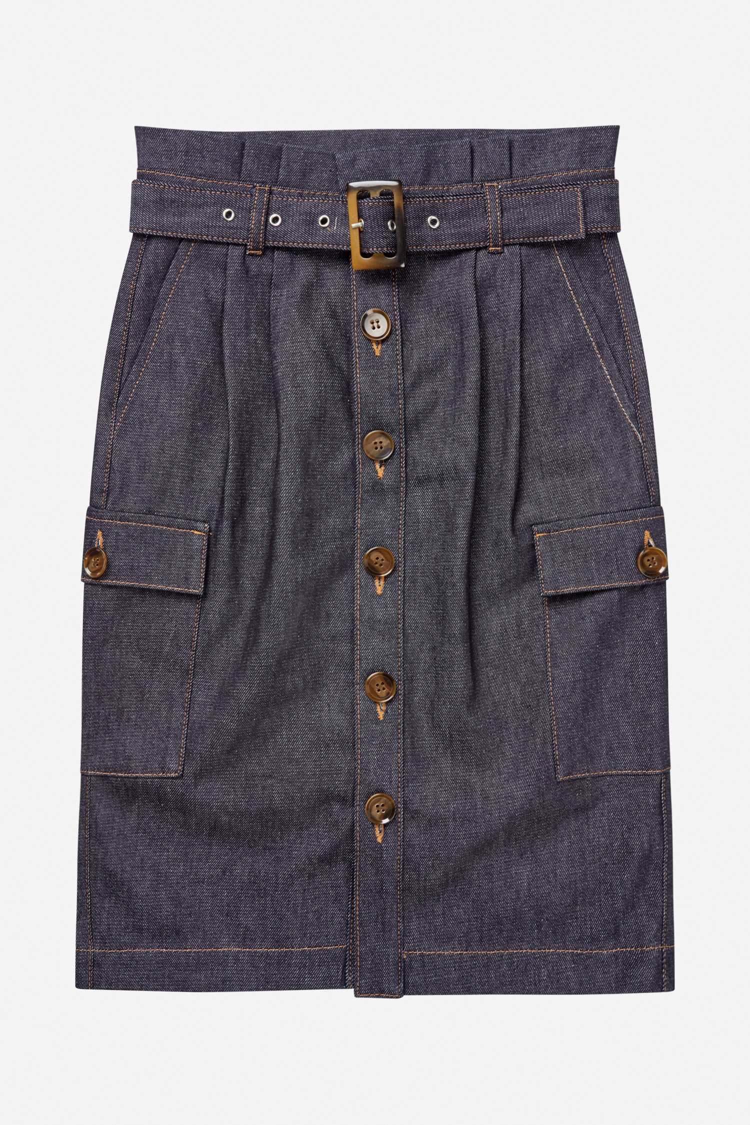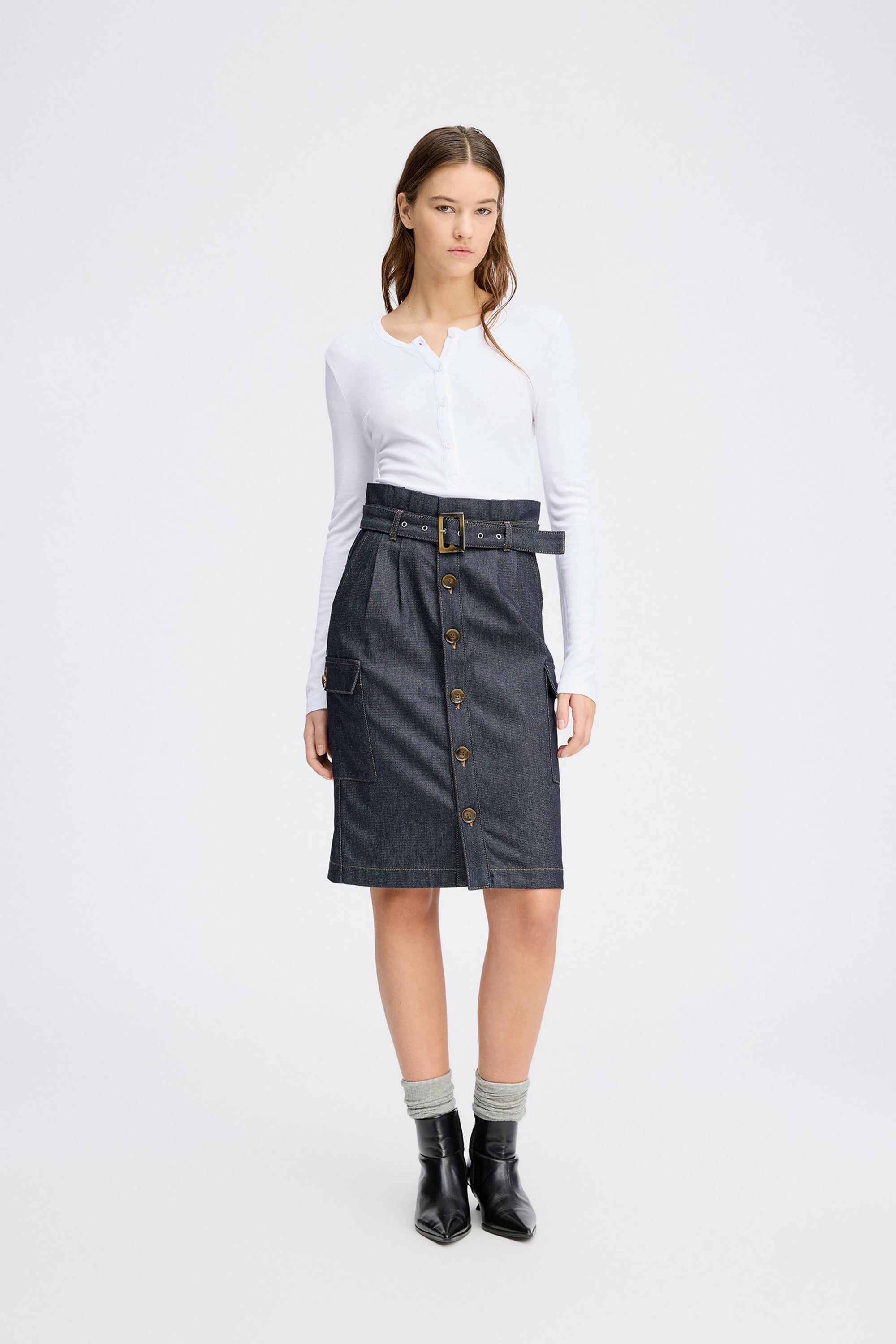 Elegant high-waisted denim skirt with front button closure, removable belt, and statement flap pockets at the sides.