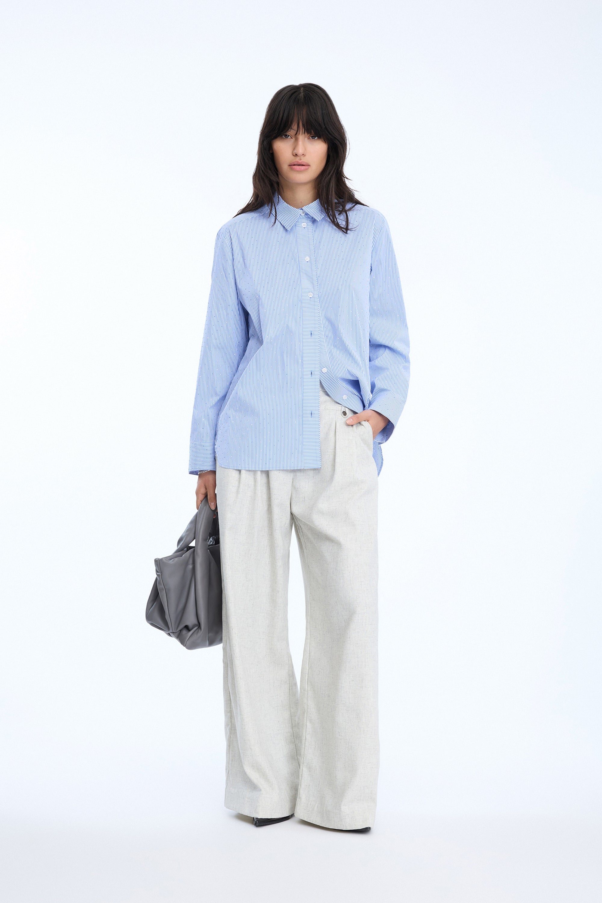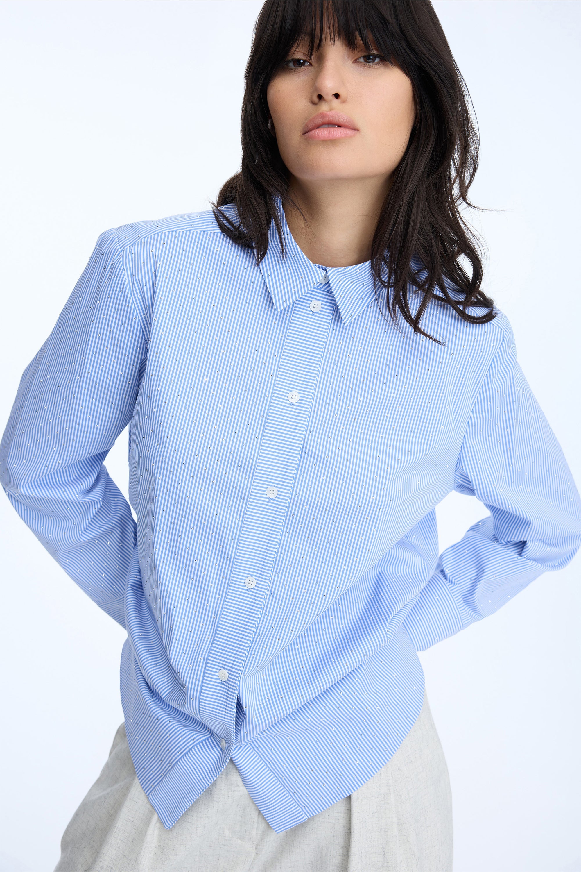 A beautiful interpretation of the classic shirt, adorned with elegant small rhinestones. The shirt features pinstripes that are turned to run horizontally along the button closure. It has long sleeves with stylish cuffs and is designed with a loose fit.
