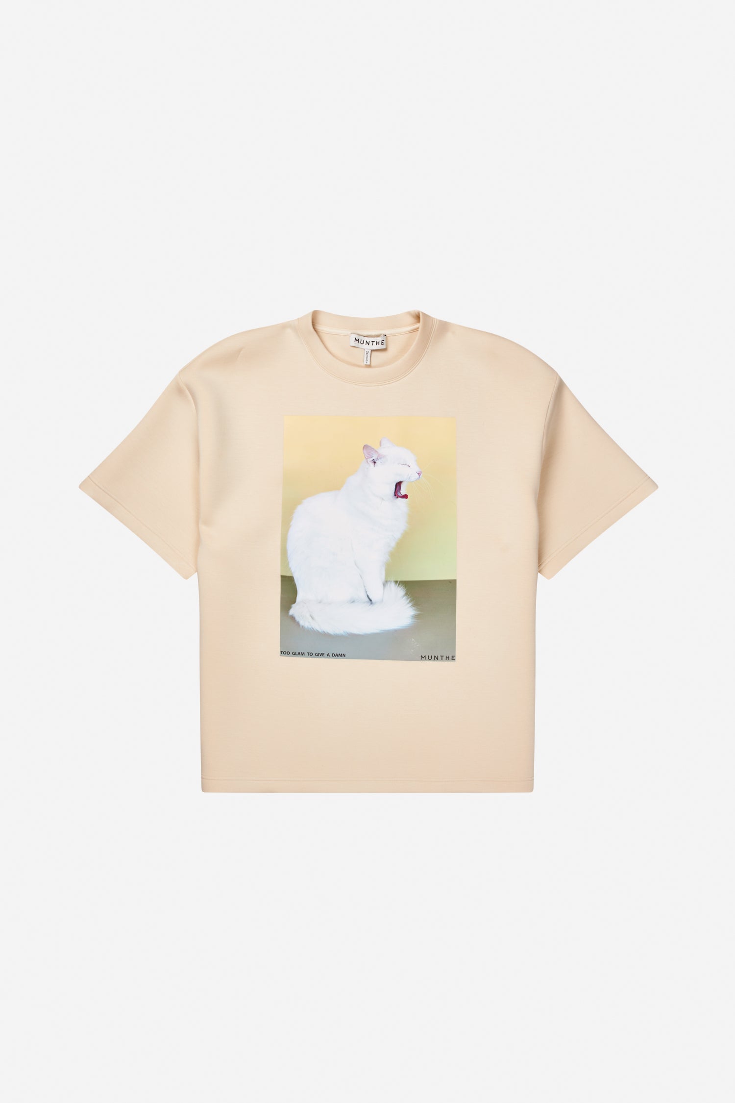 Neoprene blouse with an elegant cat print. This blouse is oversized, has short sleeves, and a round neckline.