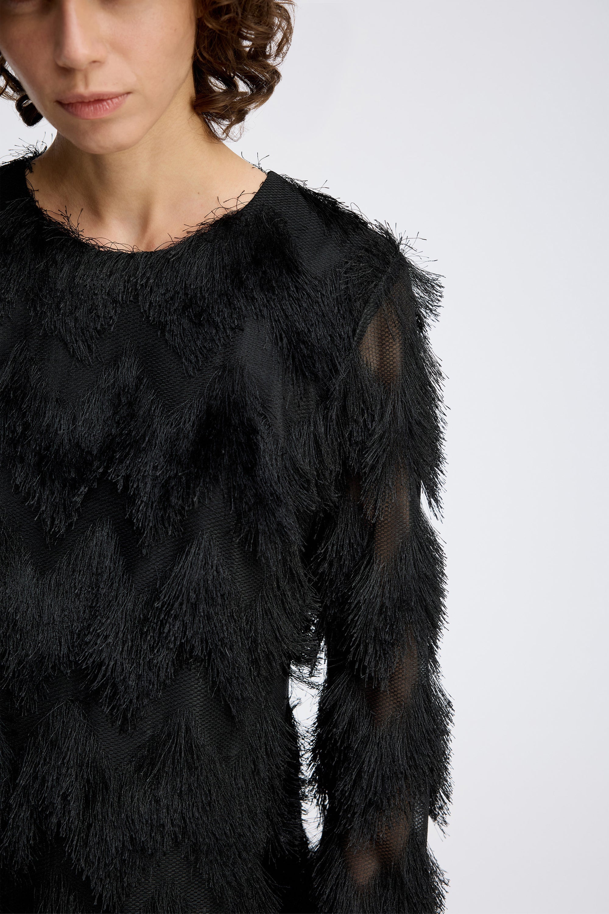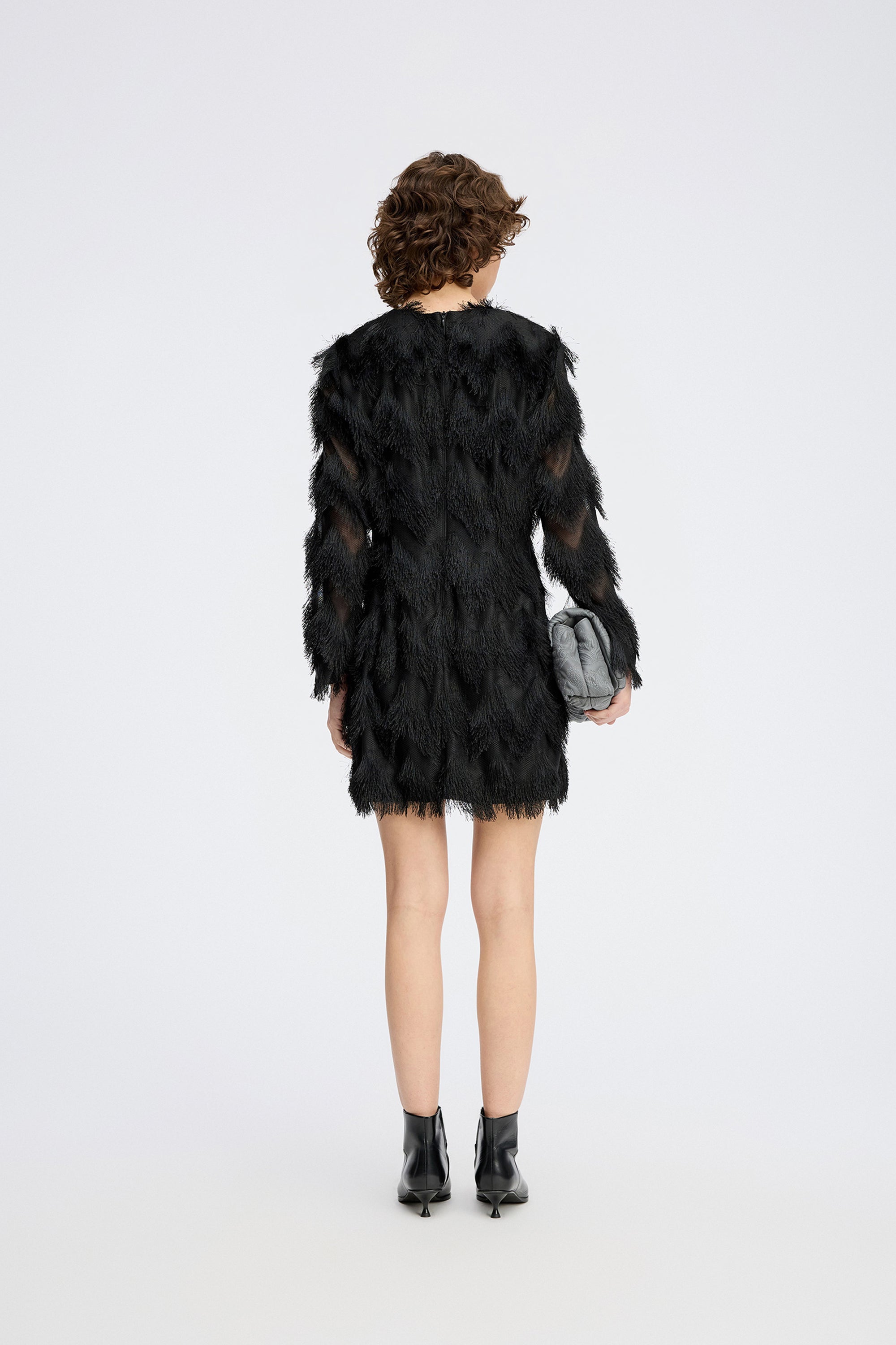 Dress with elegant fringe details in a beautiful zigzag pattern. The dress features a round neckline, long sleeves, and a zip fastening at the back.