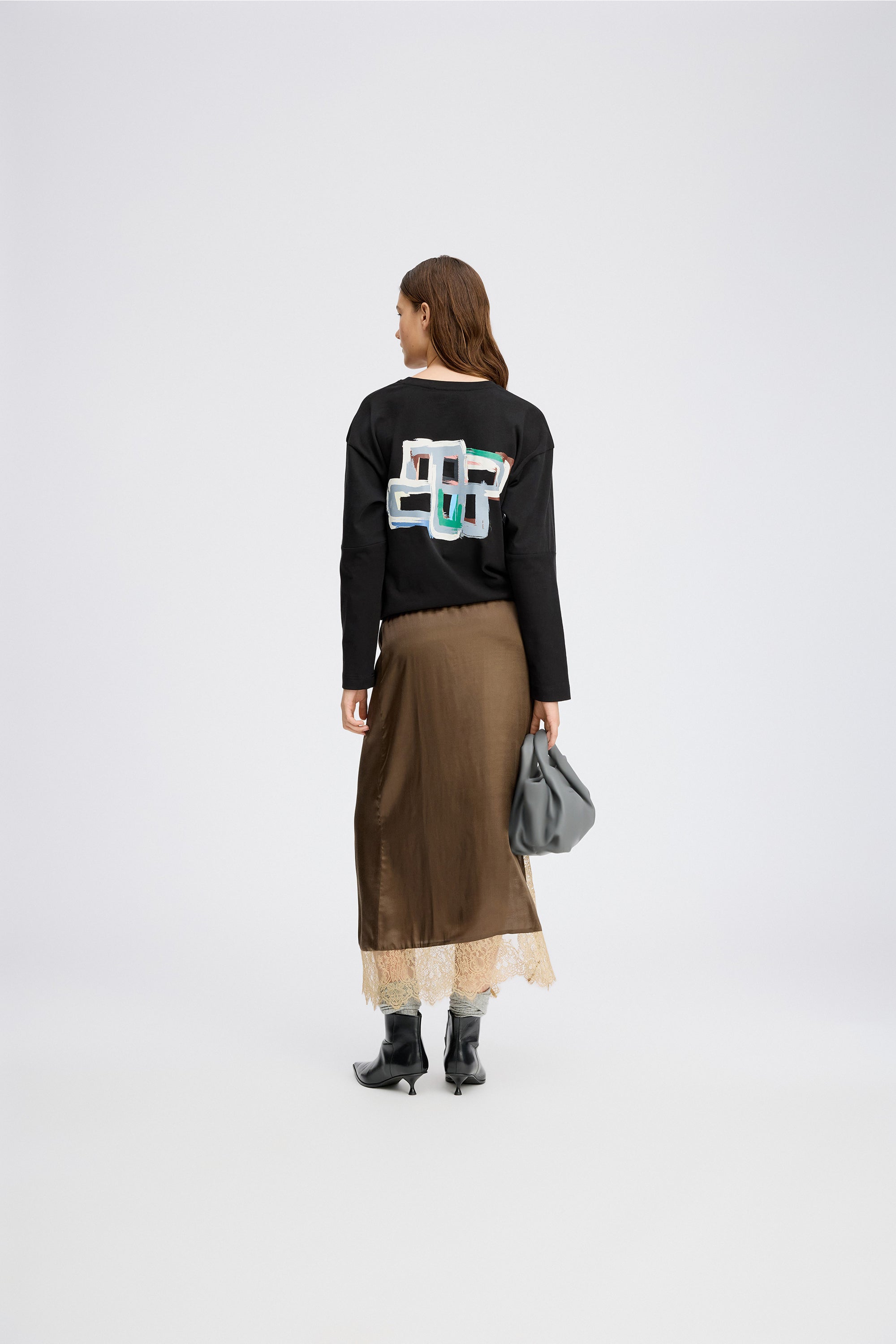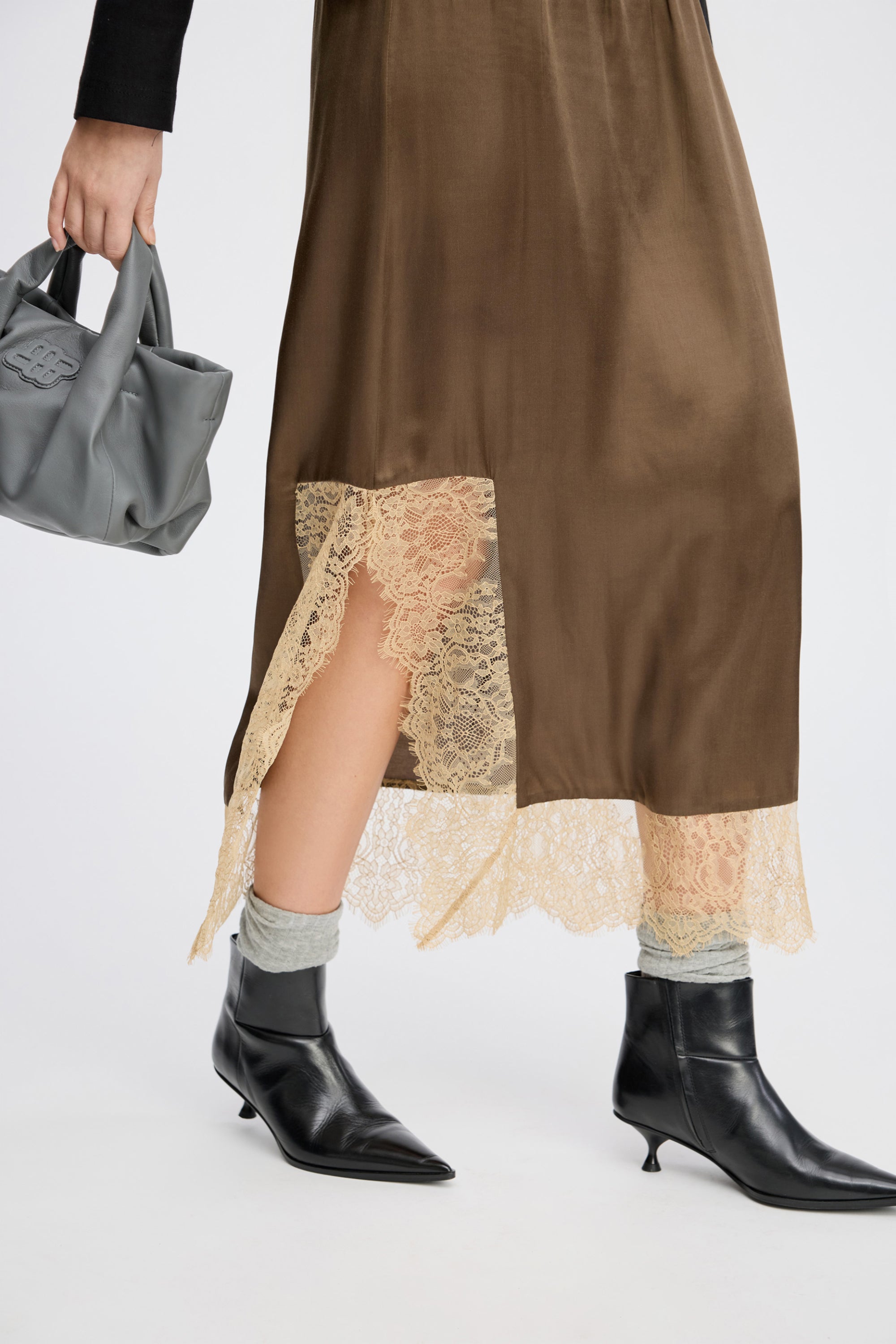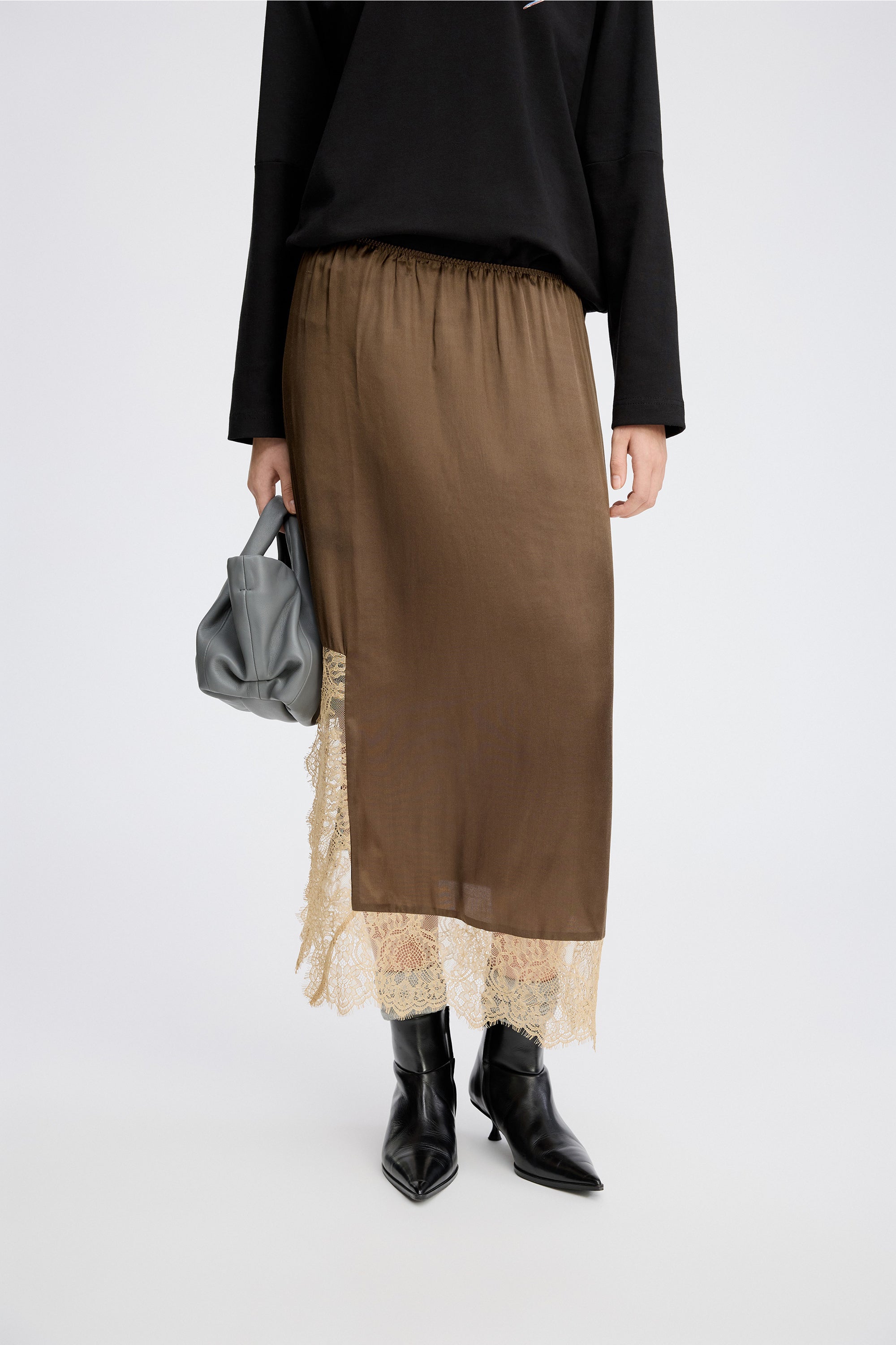 Skirt with a beautiful lace detail along the hem and an elegant, asymmetric design that drapes beautifully, featuring an elastic waistband for an easy fit.