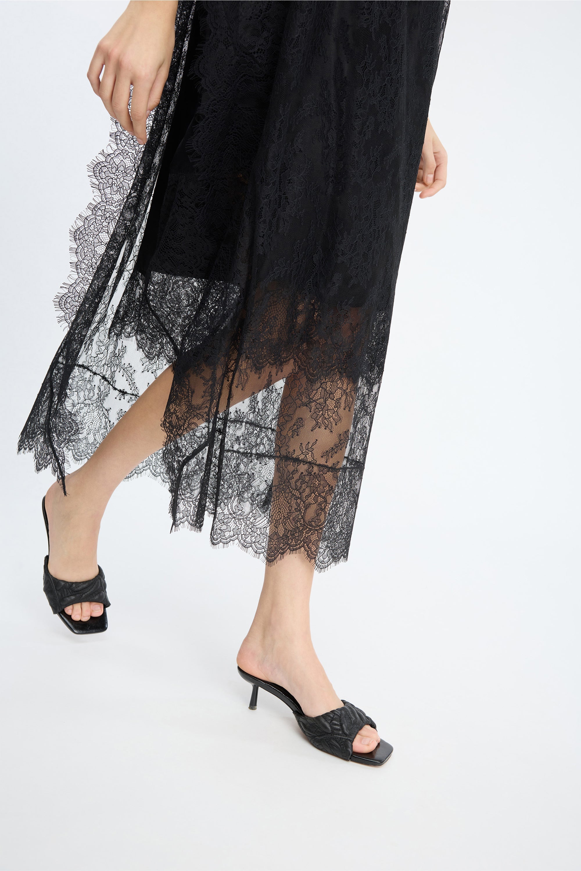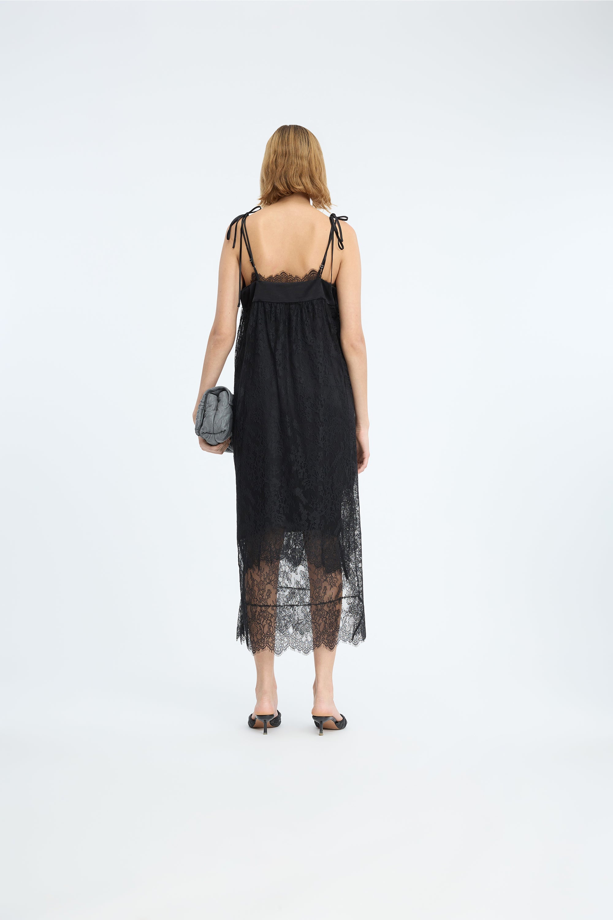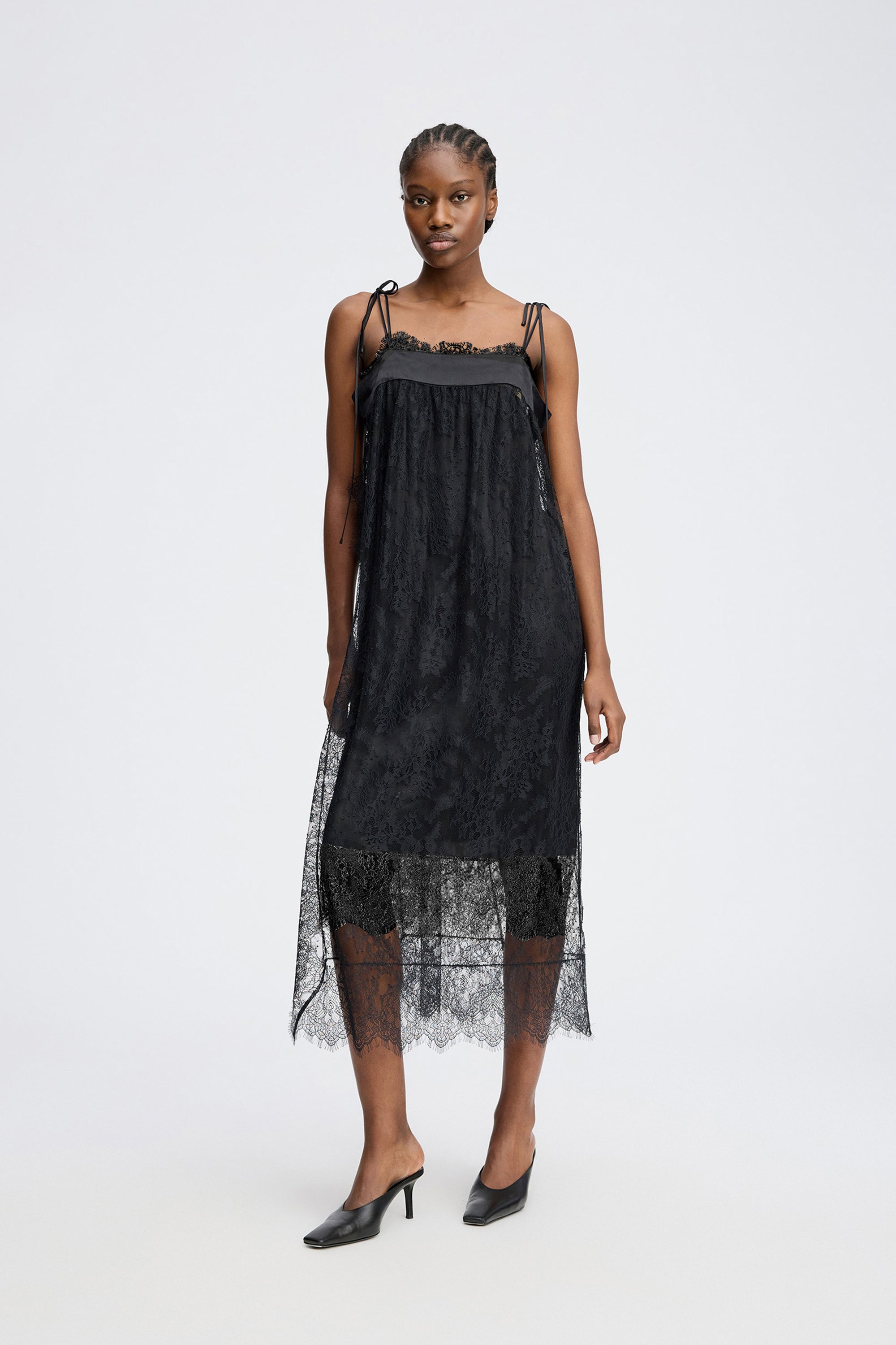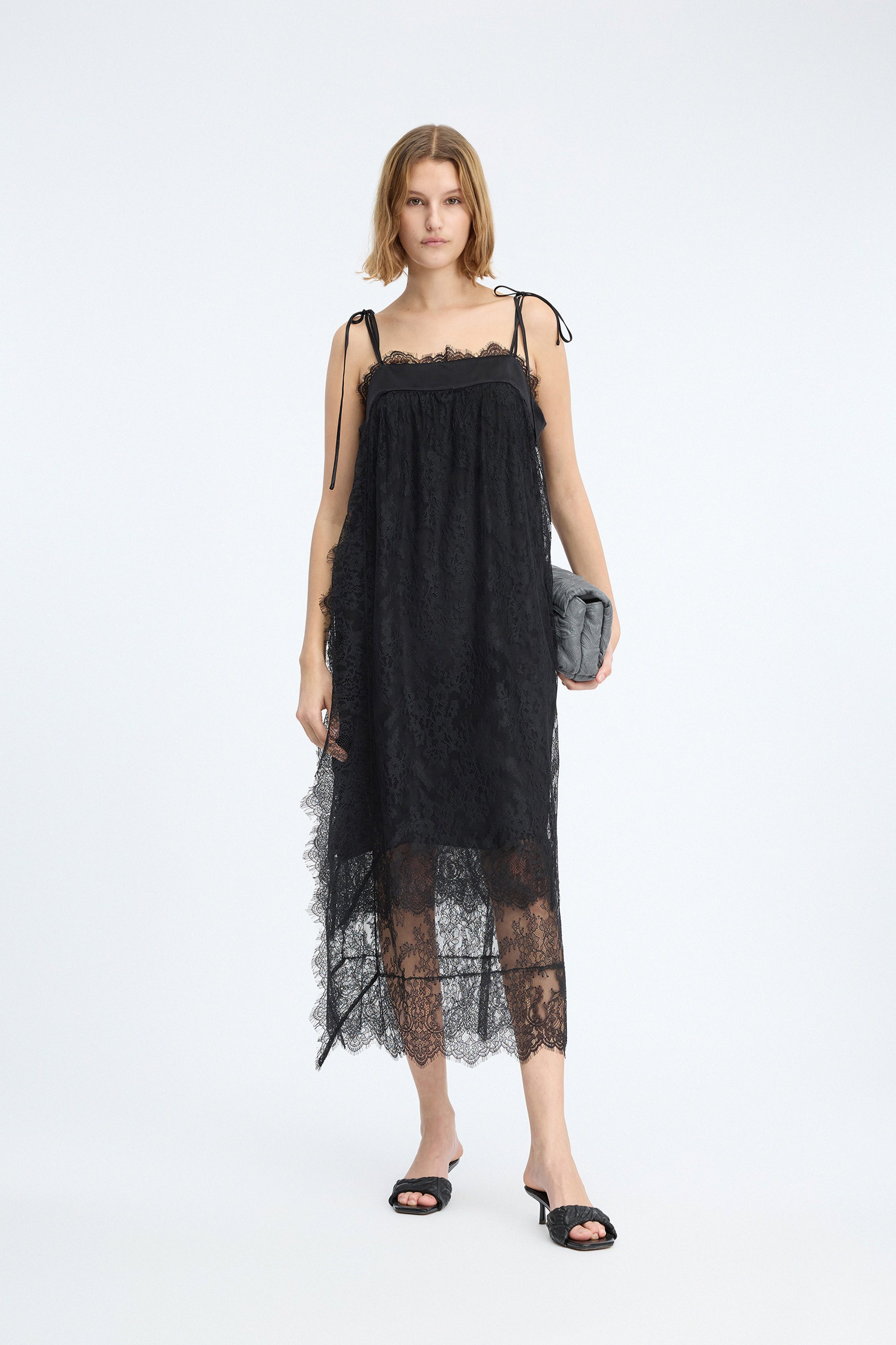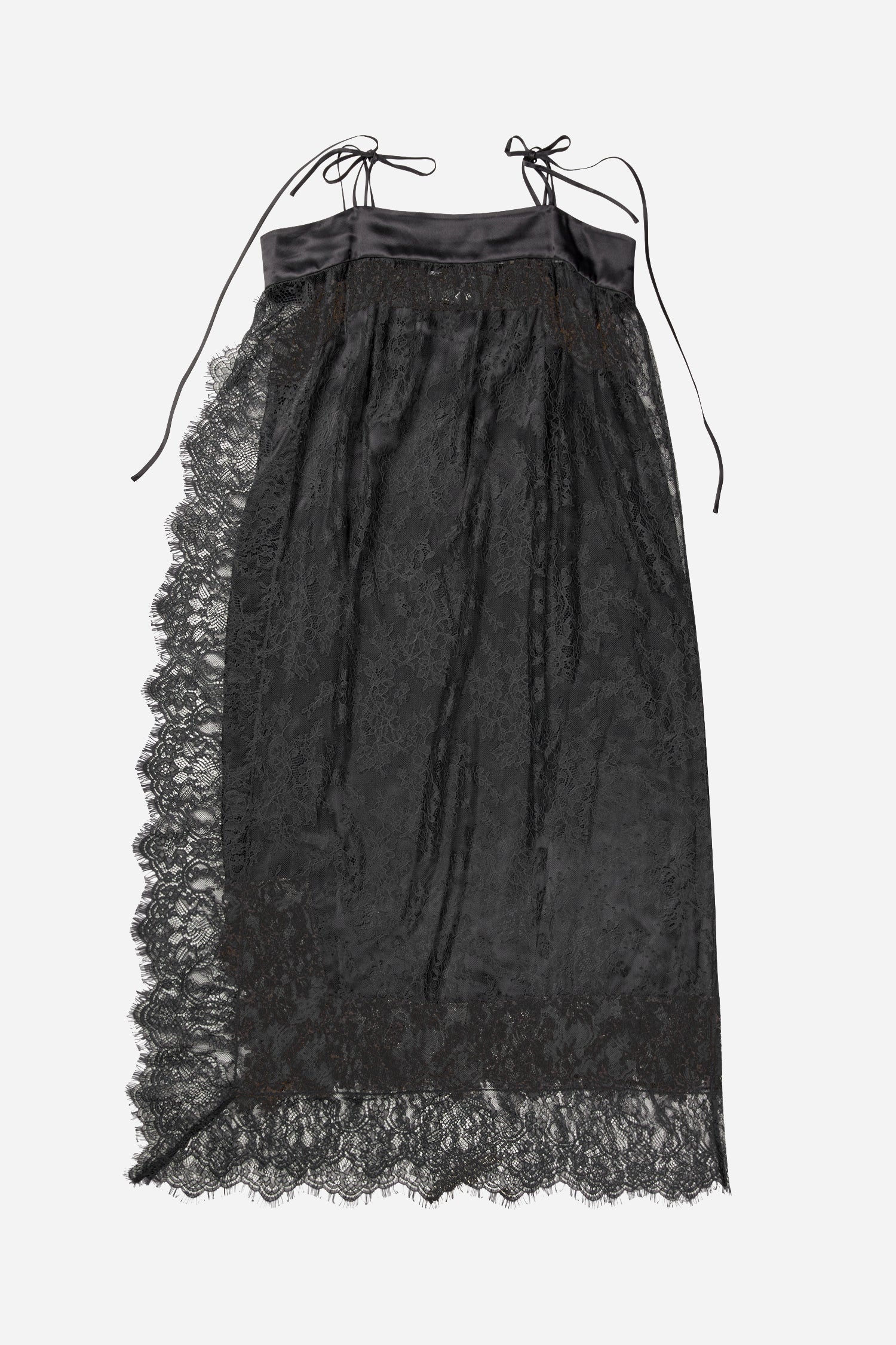 Beautiful lace dress with an elegant ribbon detail at the neckline and delicate tie straps on the shoulders. The dress features an asymmetric lace hem. This versatile piece can be styled with or without a slip dress.
