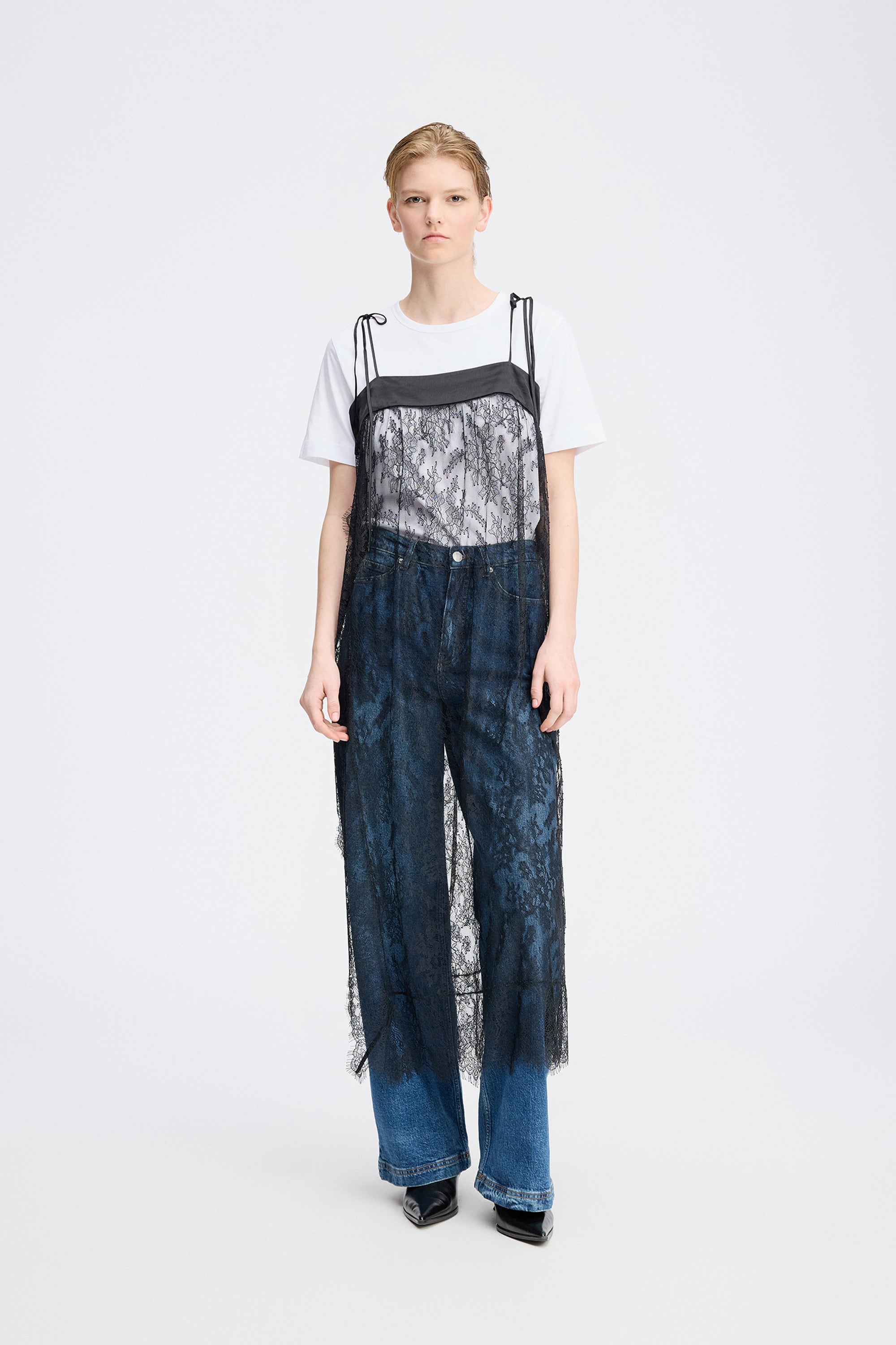 Elegant lace dress with delicate lace trims. Designed with thin, adjustable straps and an asymmetric lace hem. Wear it on its own, or style it with a Rocco Slip underneath.