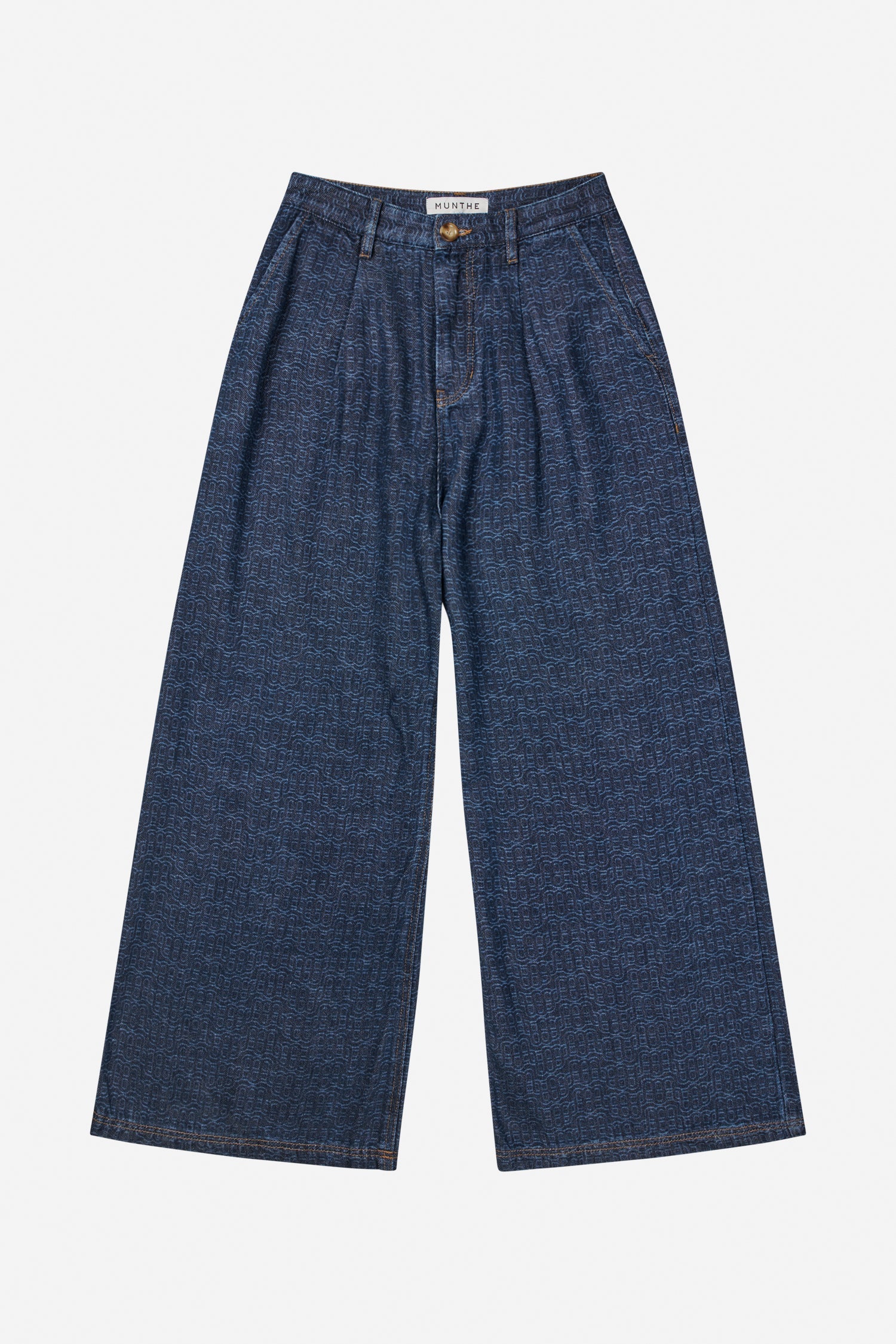 Jeans in soft denim with a subtle, woven MUNTHE emblem in matching blue tones. Designed with wide legs, a high waist, slanted pockets, and a classic button and zip closure.