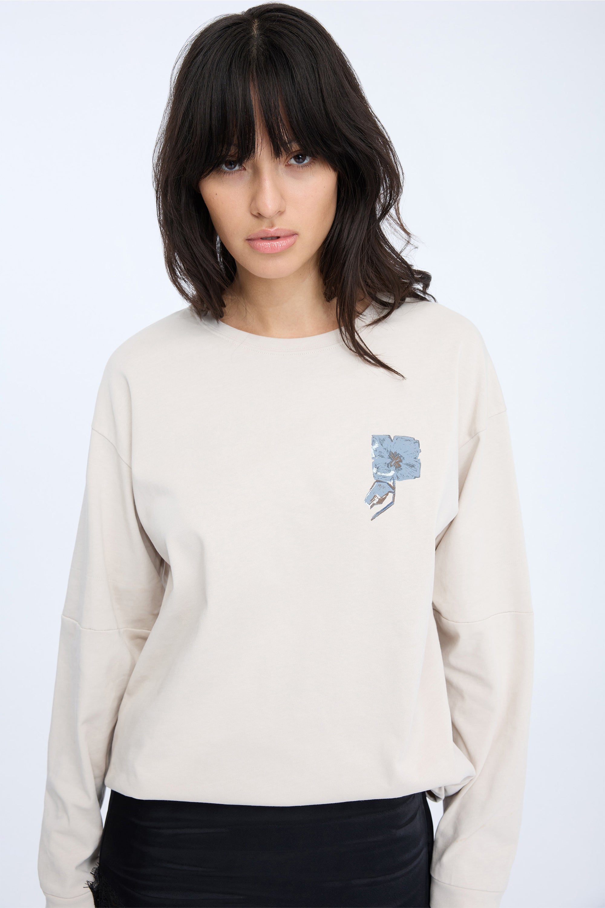 Elegant T-shirt with a small artistic flower print on the front and a beautiful graphic MUNTHE emblem on the back. The T-shirt has a loose fit, long sleeves, and a round neckline.