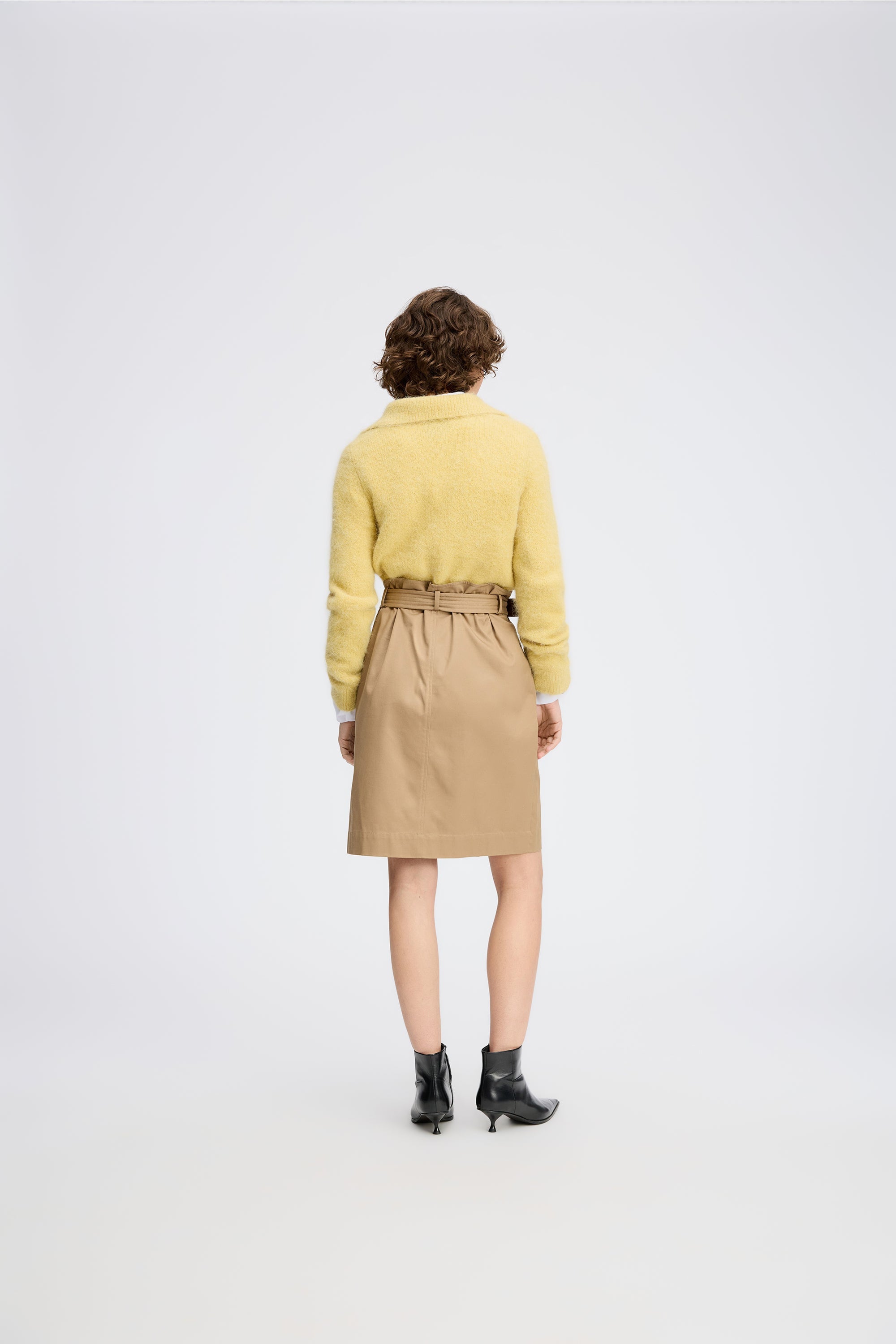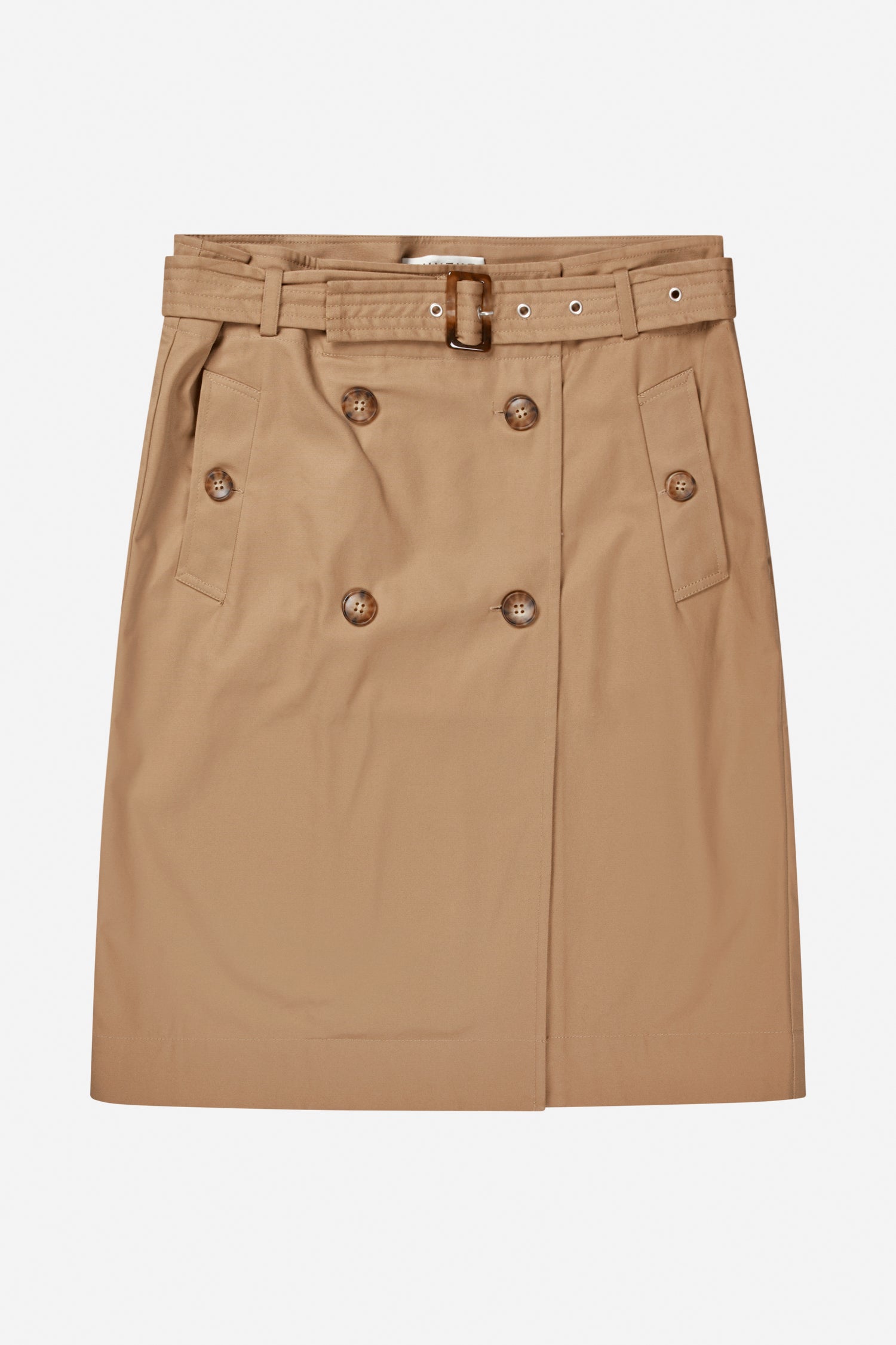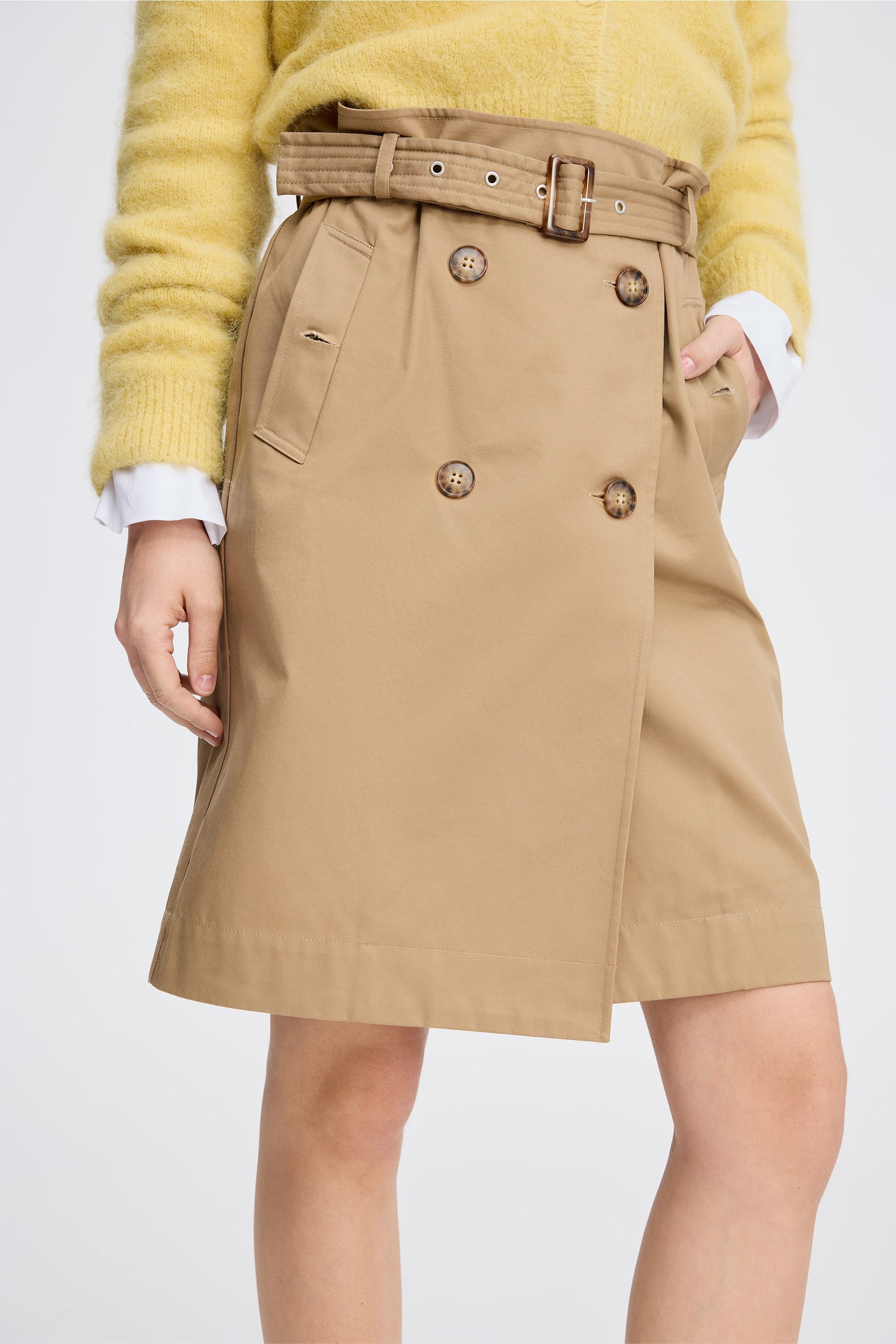 Classic skirt with decorative double-breasted buttons and a beautiful belt at the waist. Designed with elegant pockets.