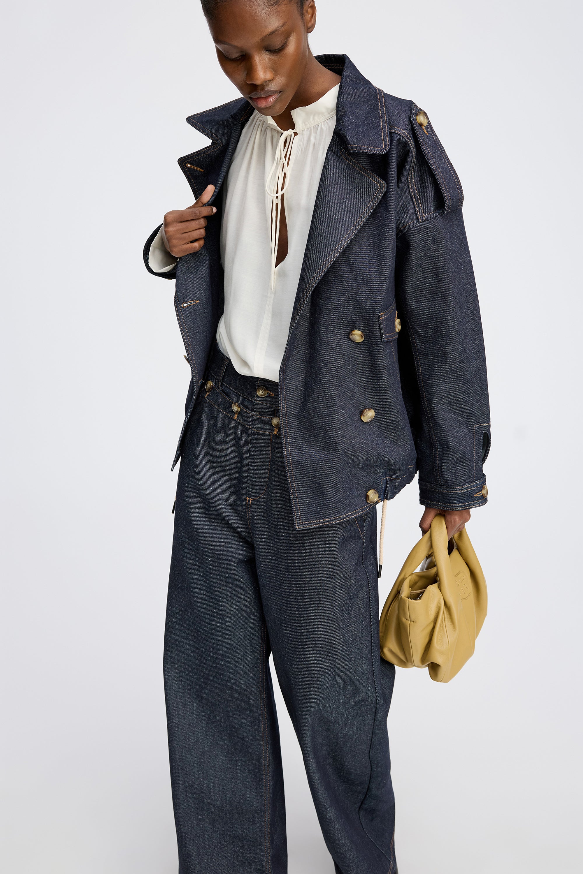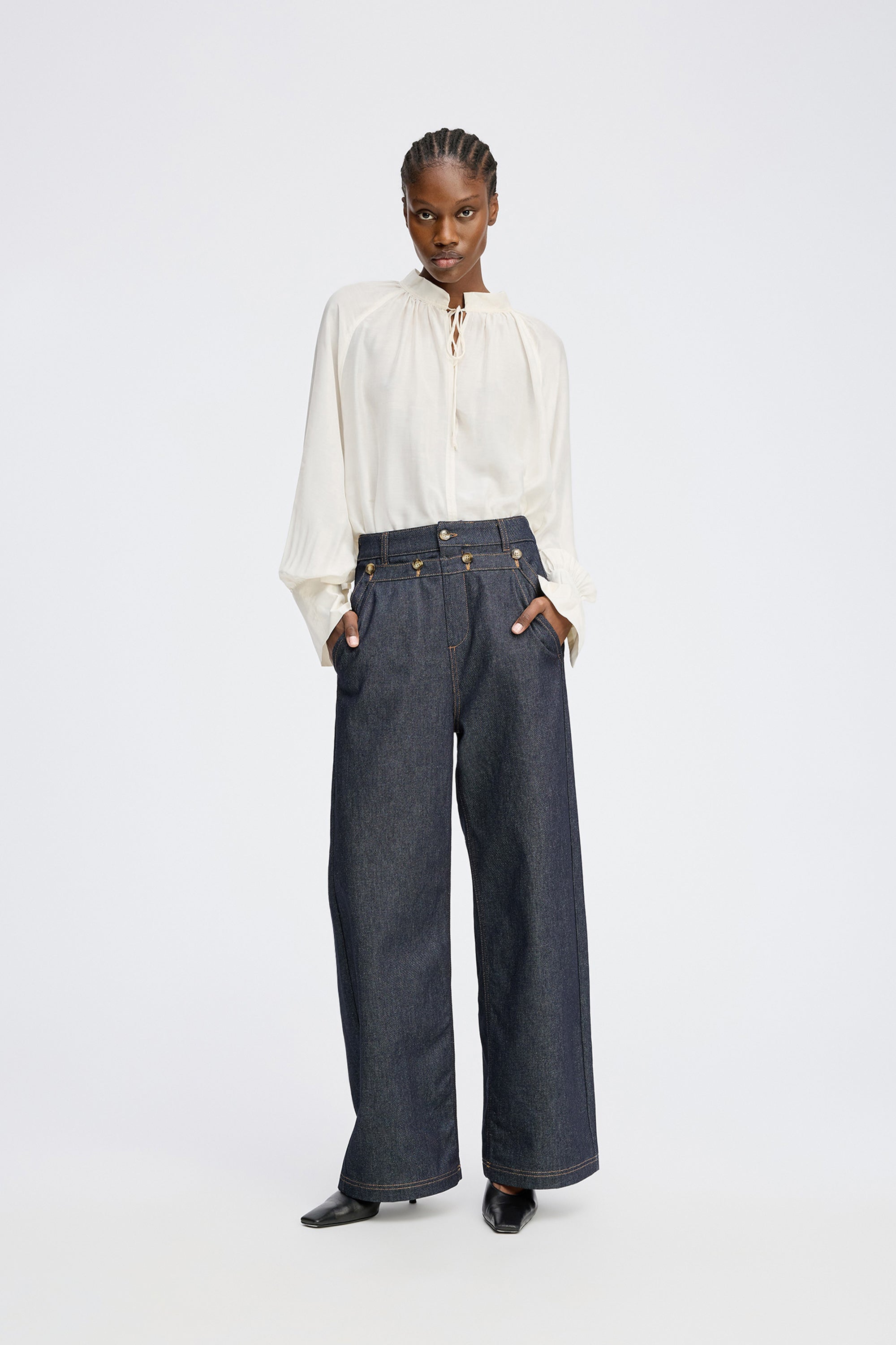 Elegant blouse crafted from a light and airy fabric. The blouse features long sleeves with wide cuffs, a loose fit, and a tie at the neckline.