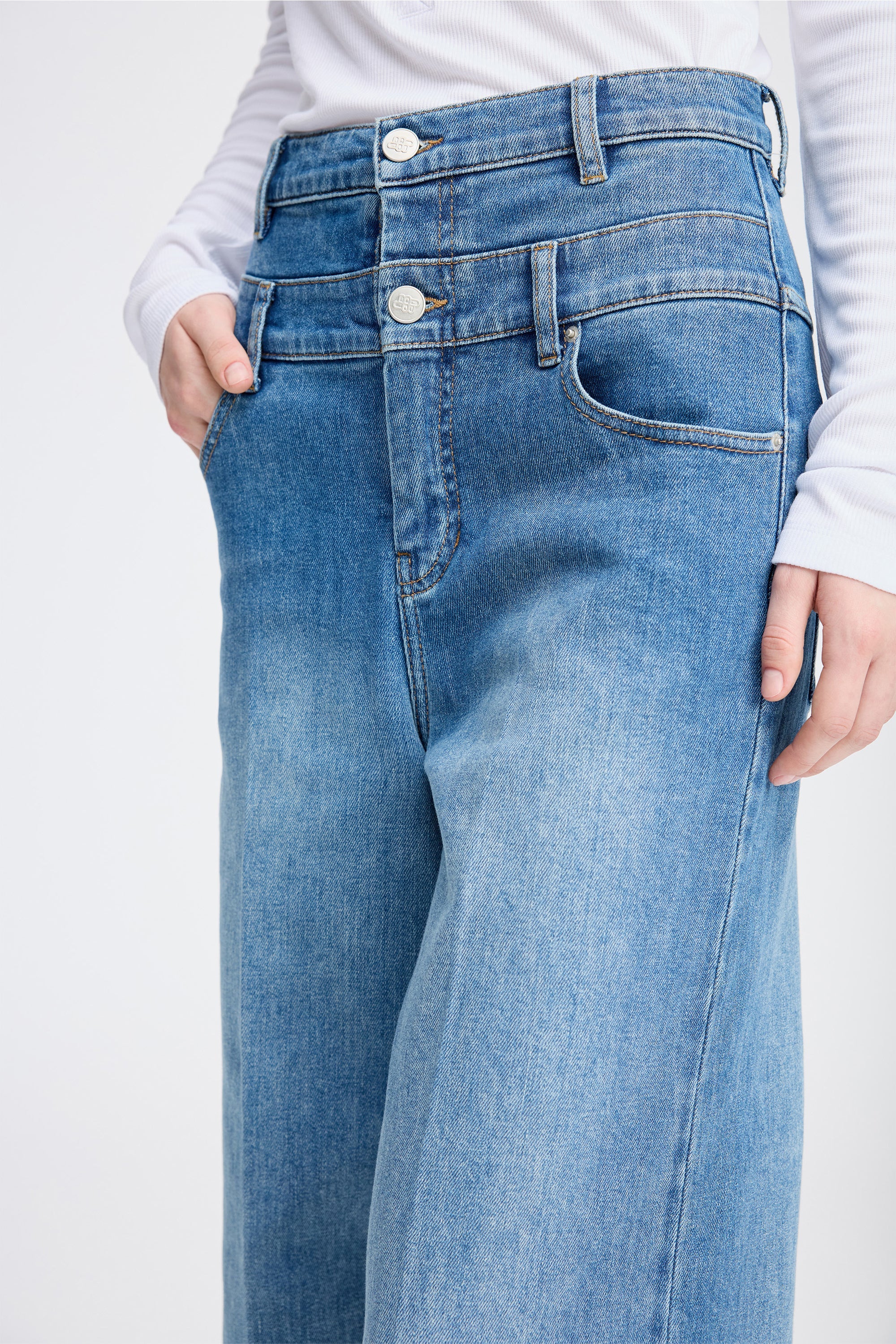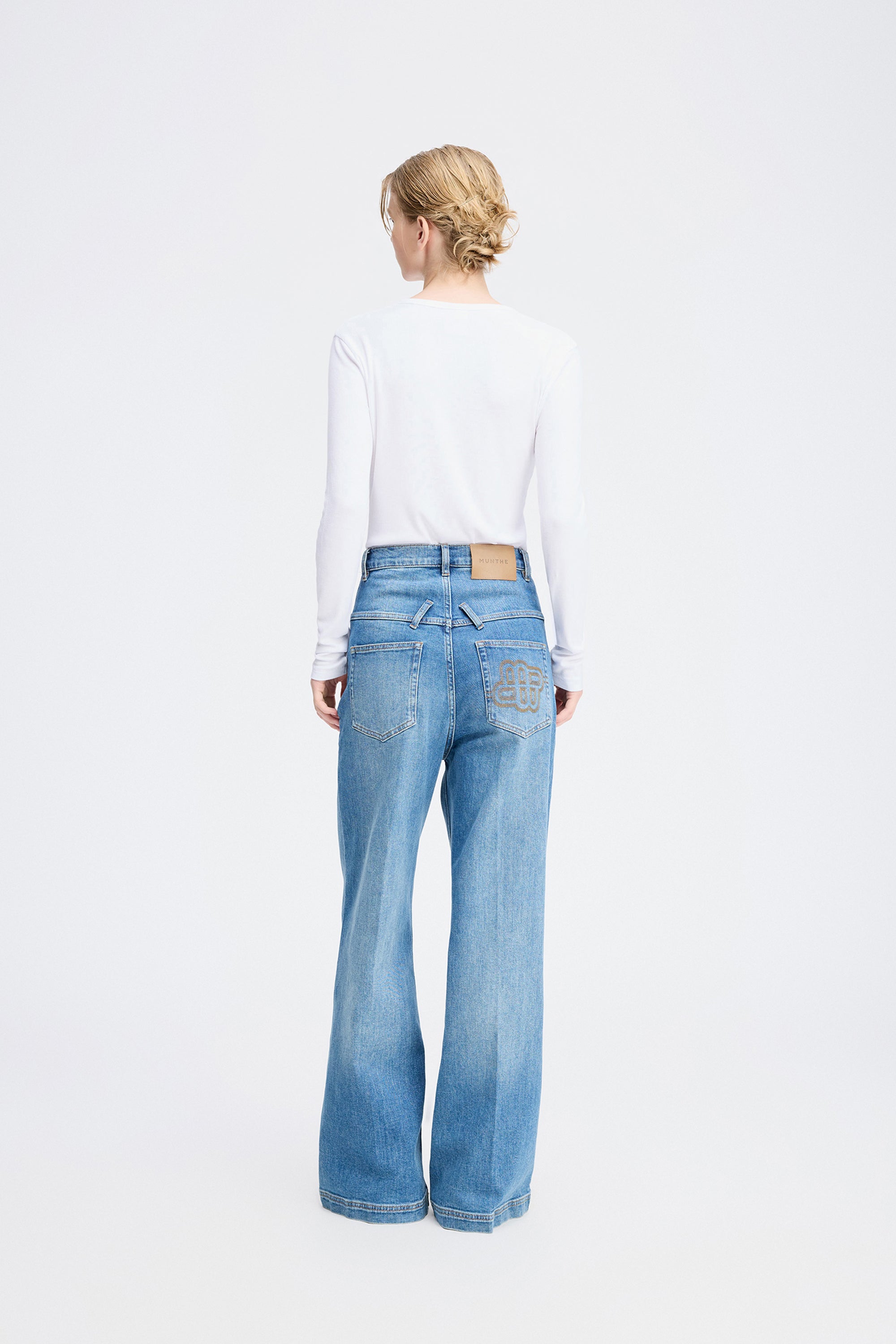 High-waisted jeans with contrast stitching. These jeans are designed with a beautiful MUNTHE emblem on the back pocket, wide legs, belt loops, pockets, and an elegant double button fastening.