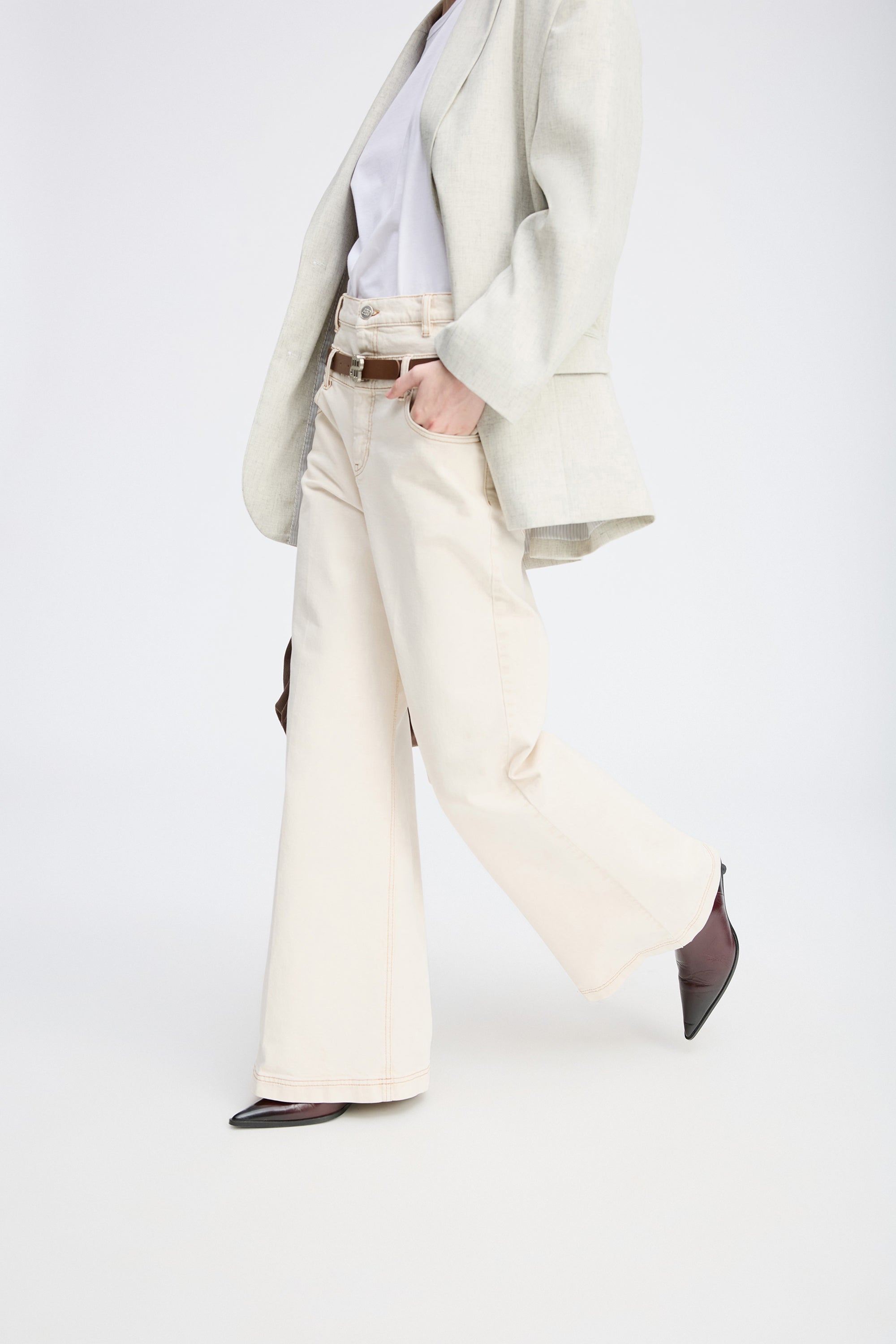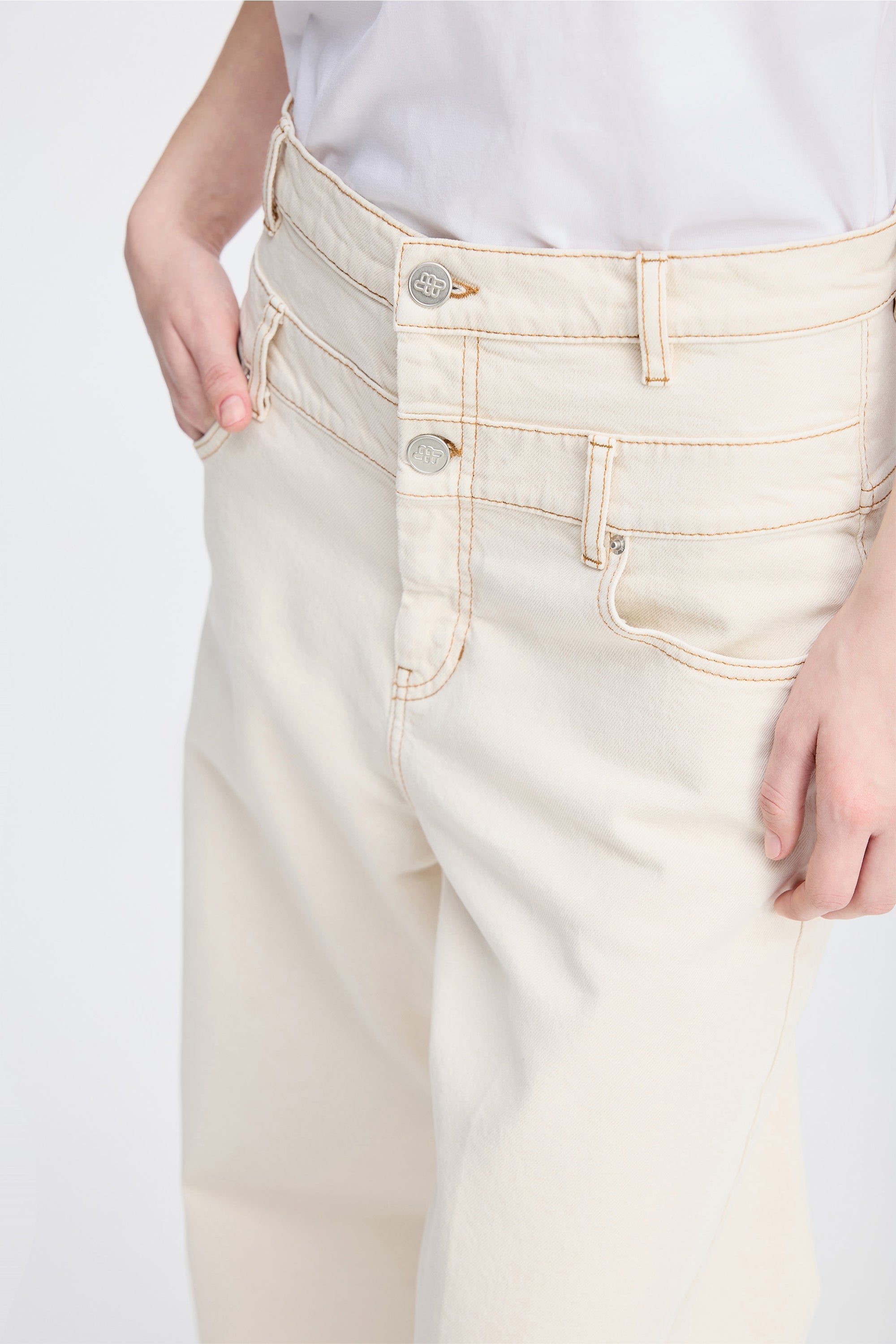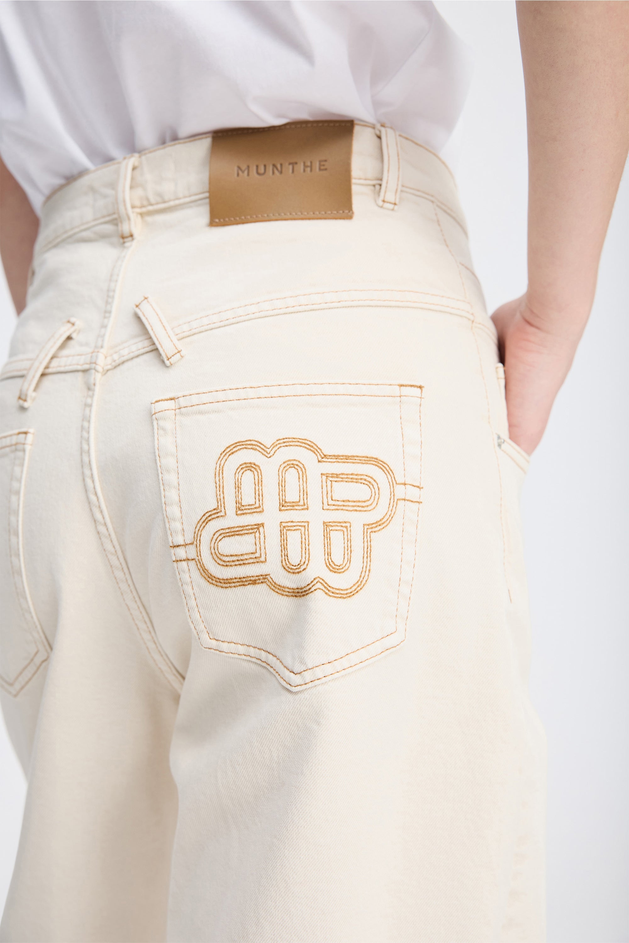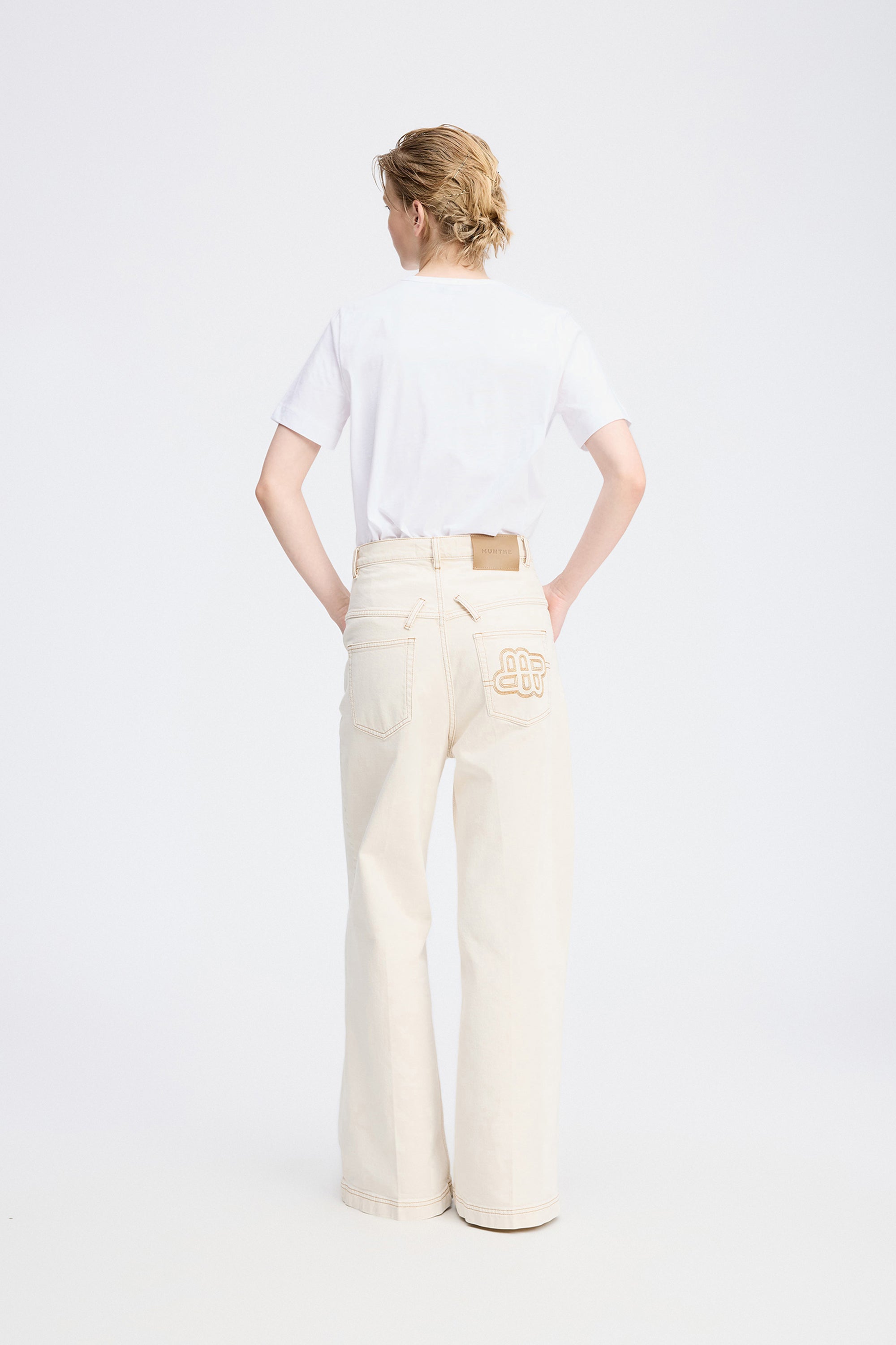 High-waisted trousers in an off-white denim quality with contrast stitching. These jeans are designed with a beautiful MUNTHE emblem on the back pocket, wide legs, belt loops, pockets, and an elegant double button fastening.