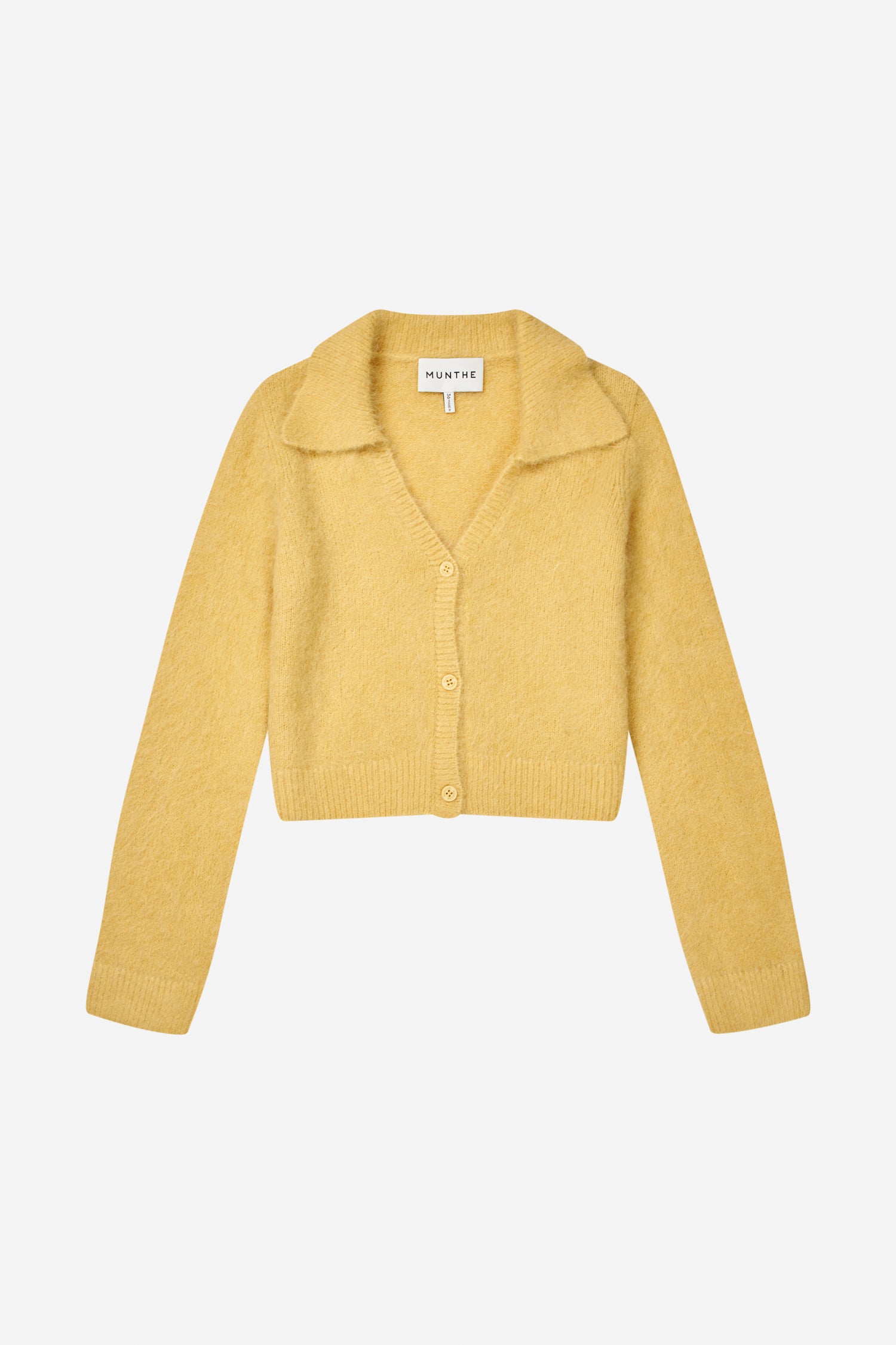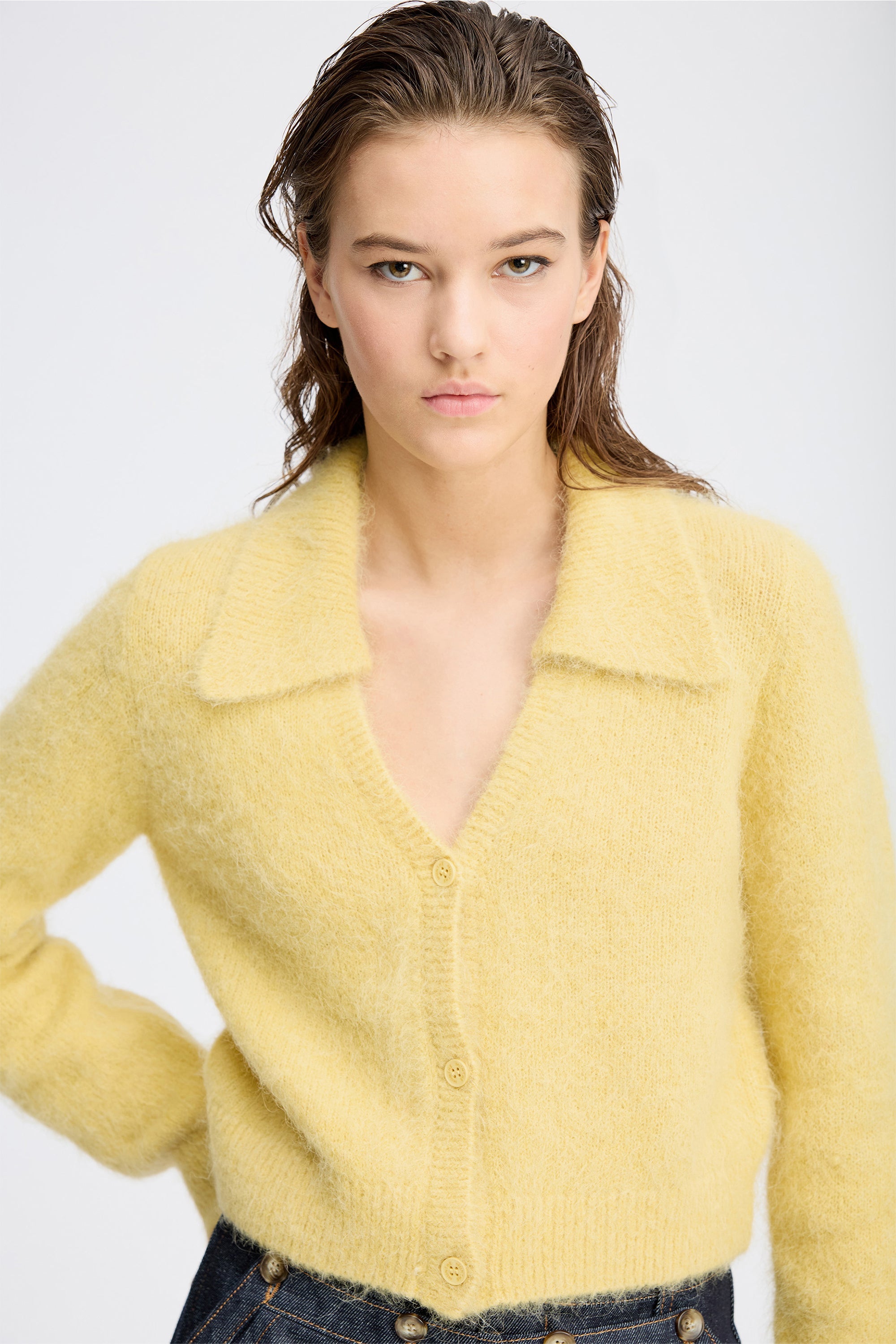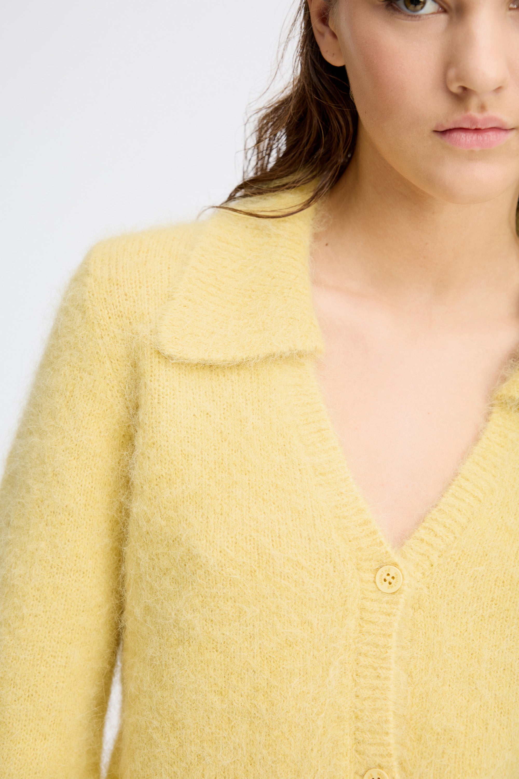 Beautiful, soft cardigan with an elegant collar and ribbed edges at the sleeves and hem. The knit is designed with a deep V-neckline and front button closure.