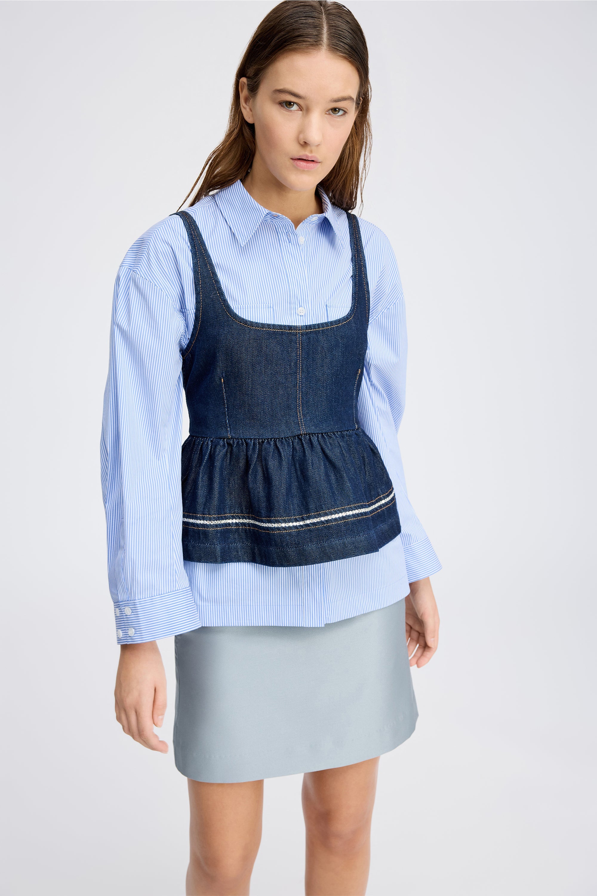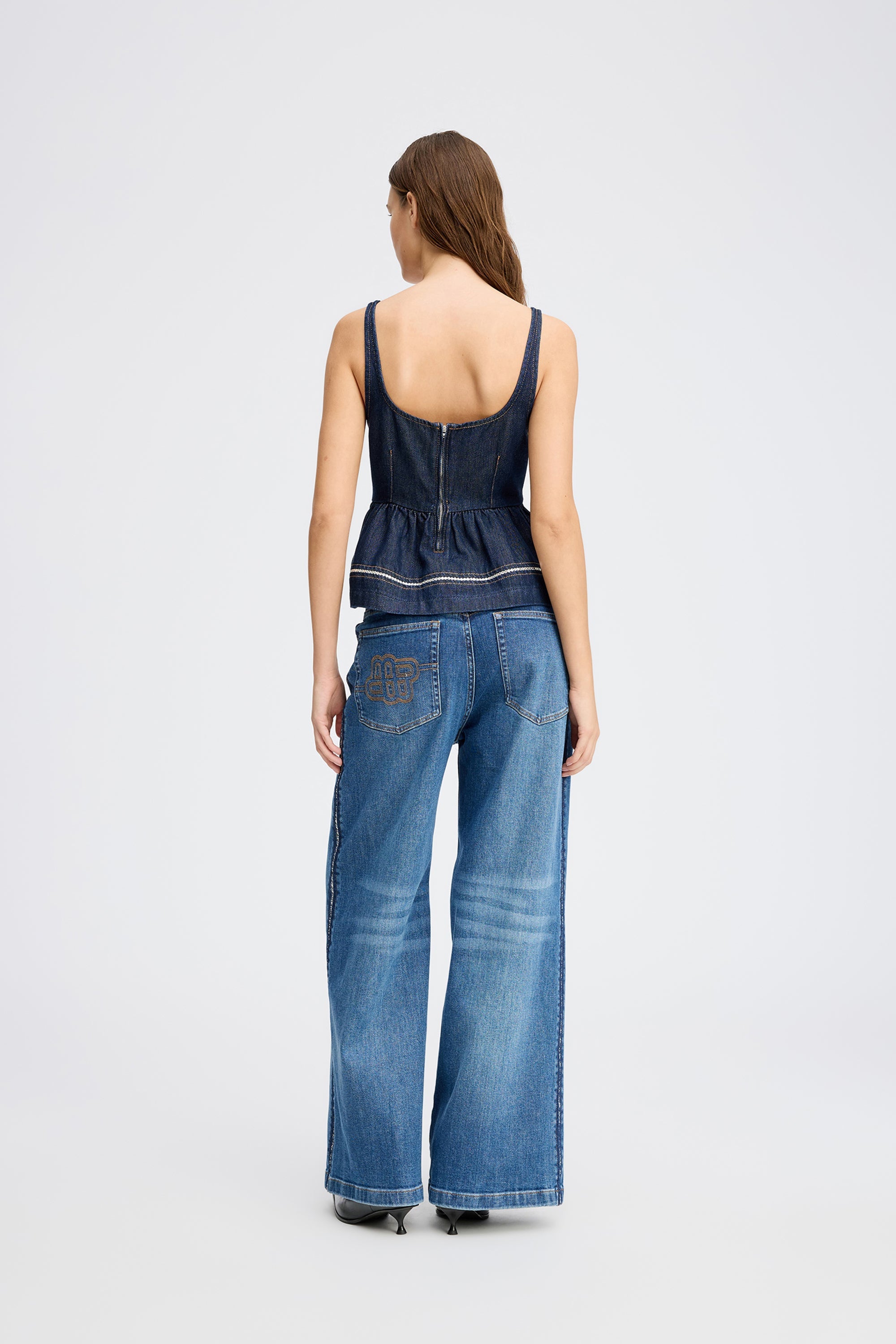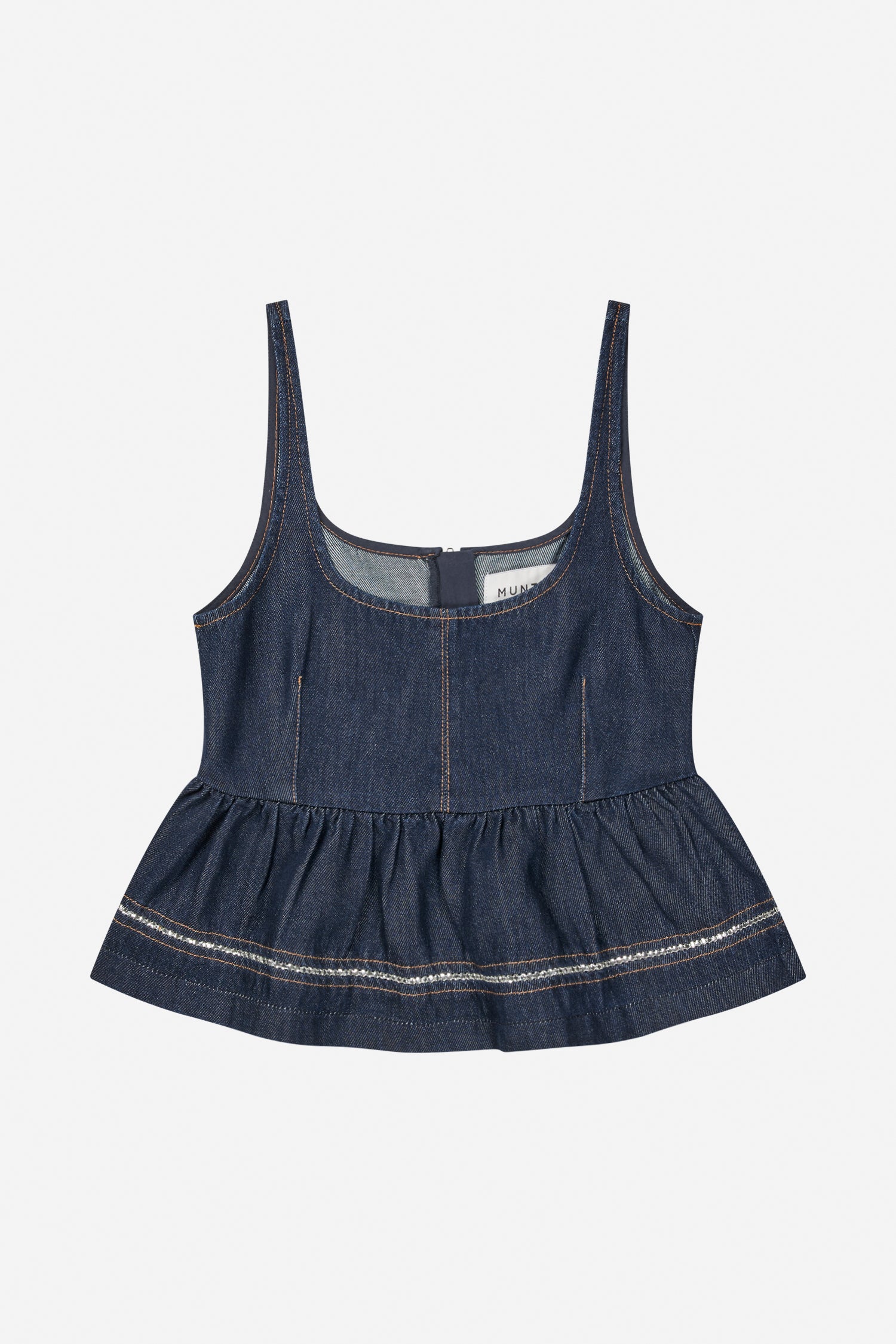 Beautiful denim top with wide straps and an elegant peplum cut. The top features decorative stitching and delicate rhinestone details along the edge.
