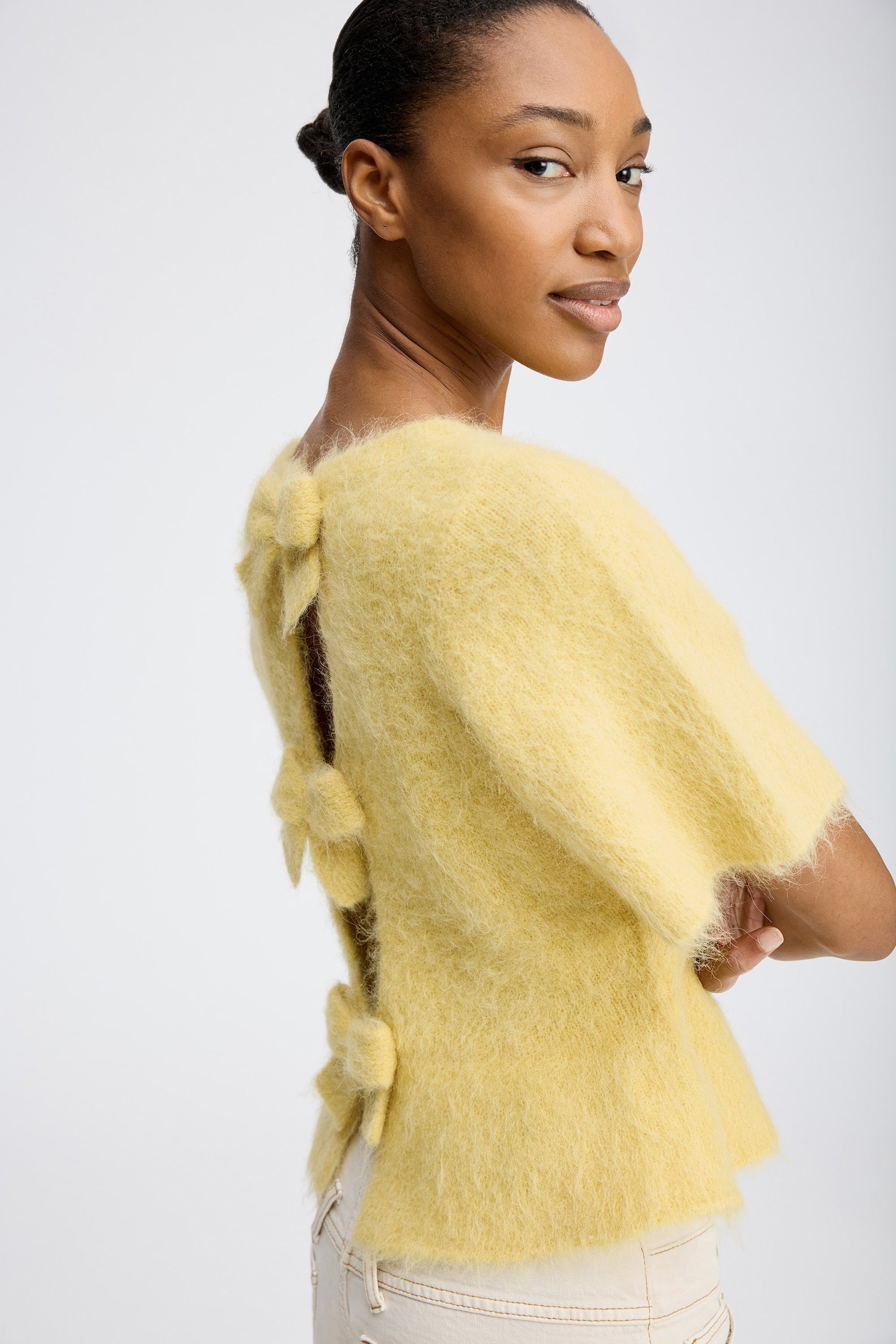 Soft, short-sleeved knit with three beautiful bows on the back. The lower part of the knit is designed with a subtle peplum effect.
