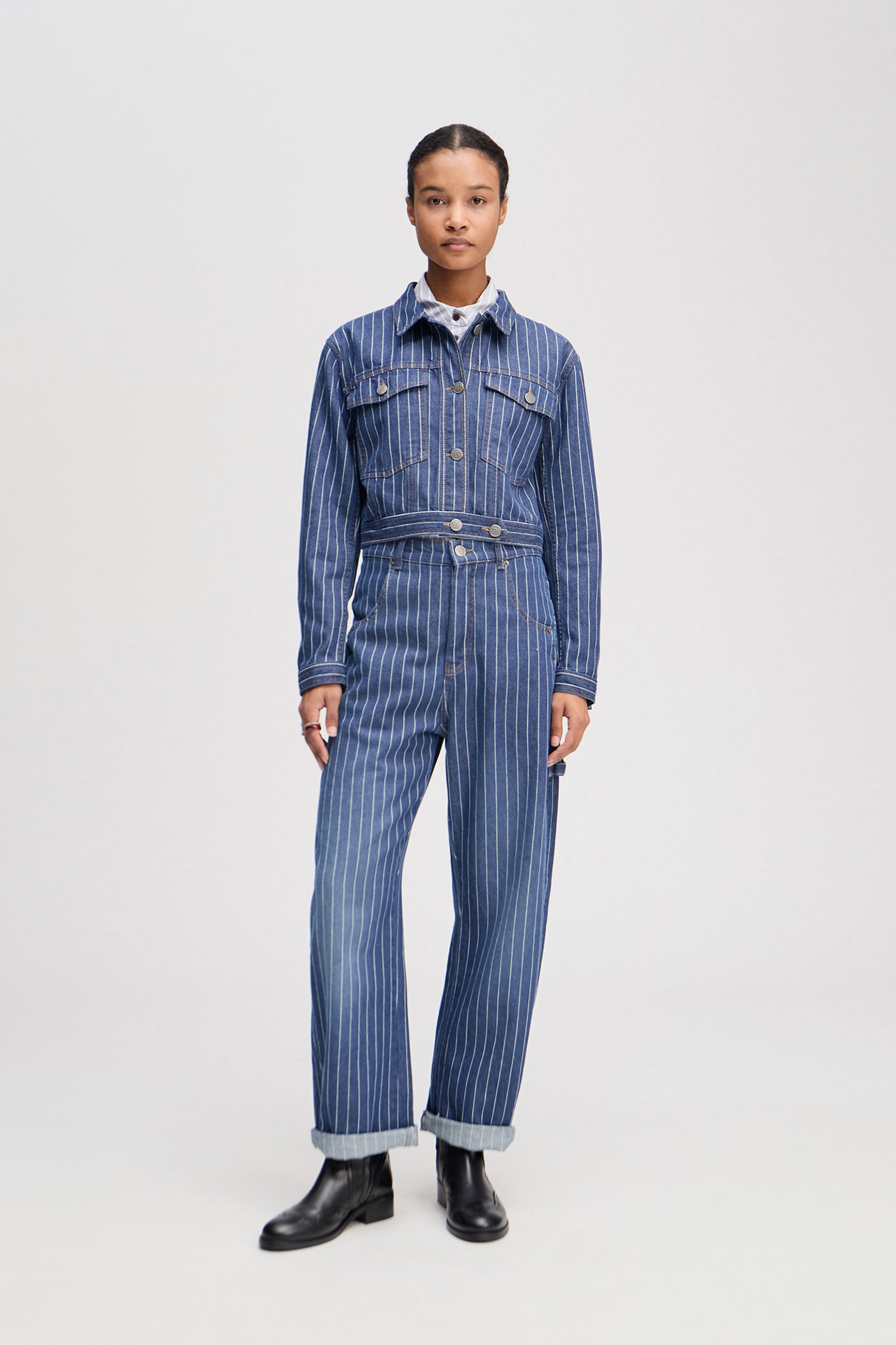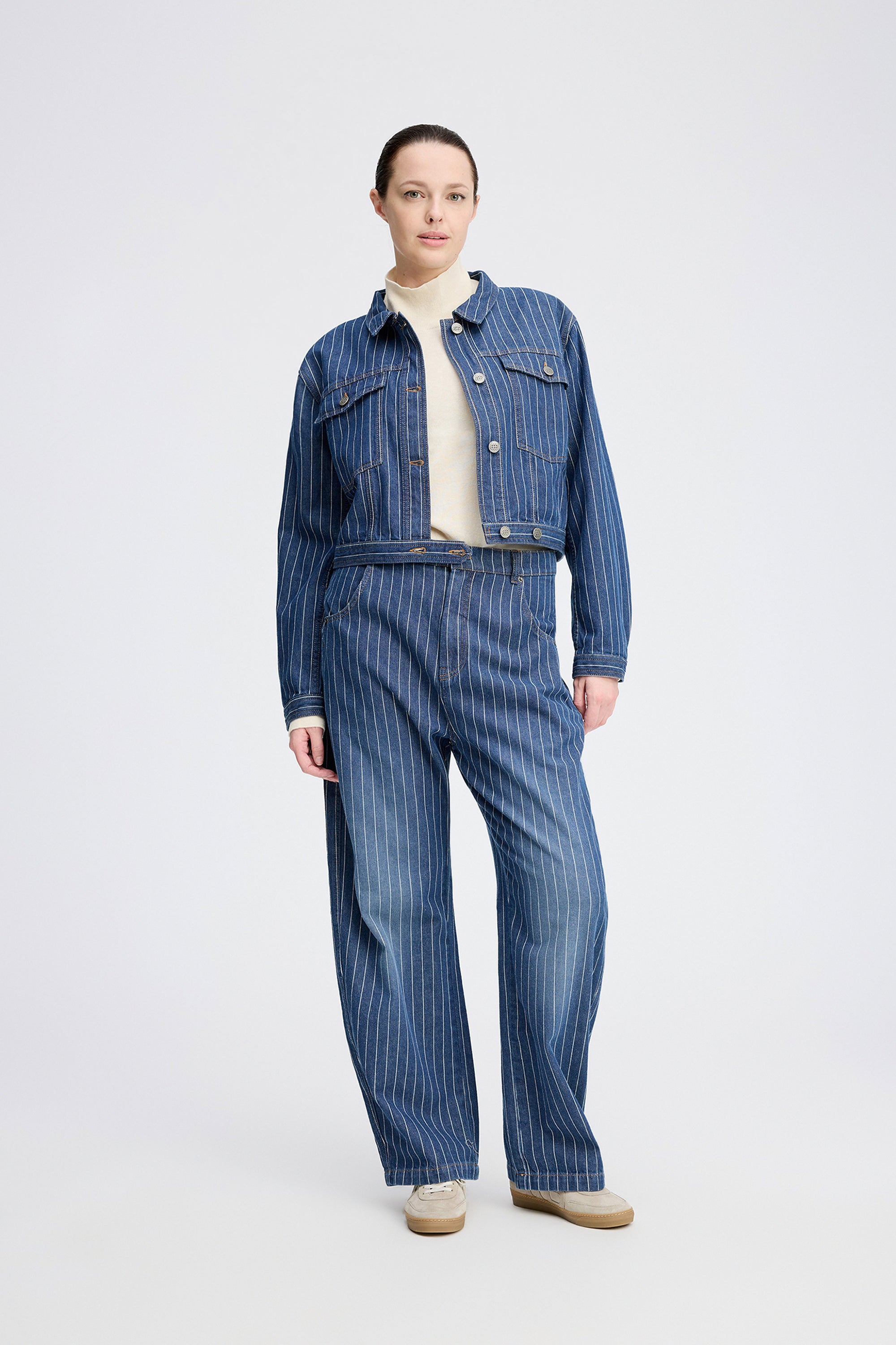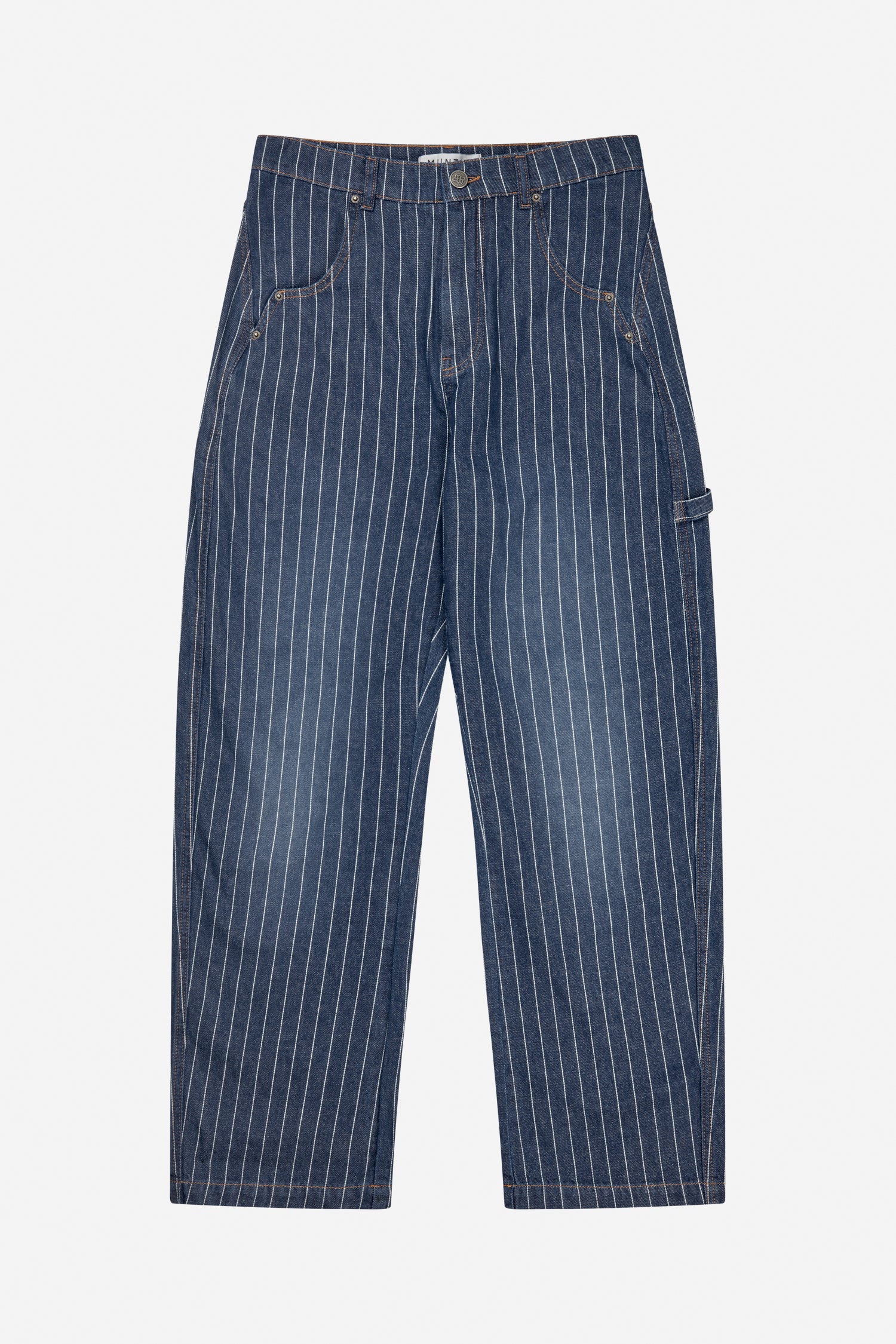 Cargo pants-inspired denim trousers with elegant pinstripes, side pockets, and oversized back pockets. The trousers are made of 100% organic cotton.