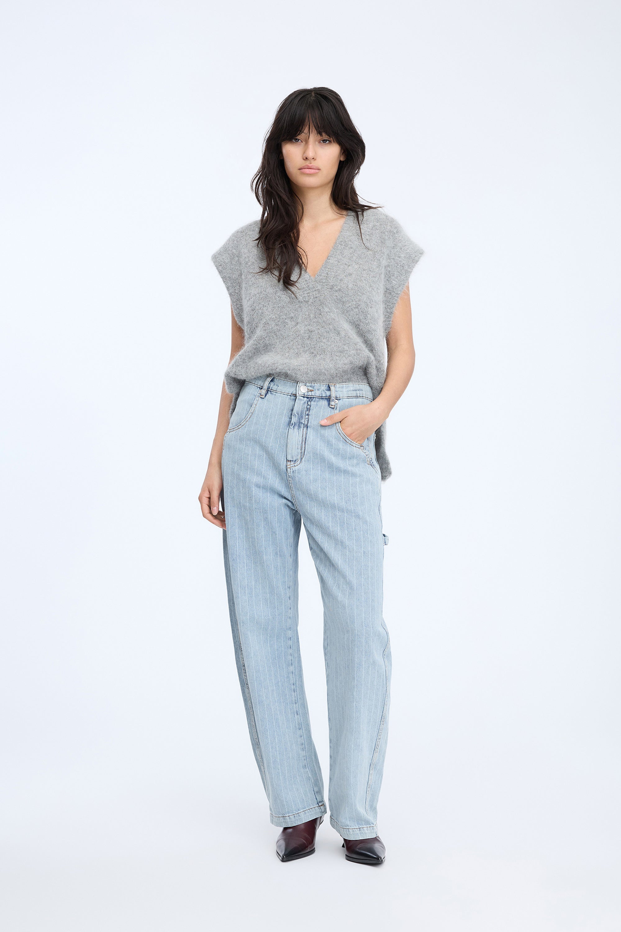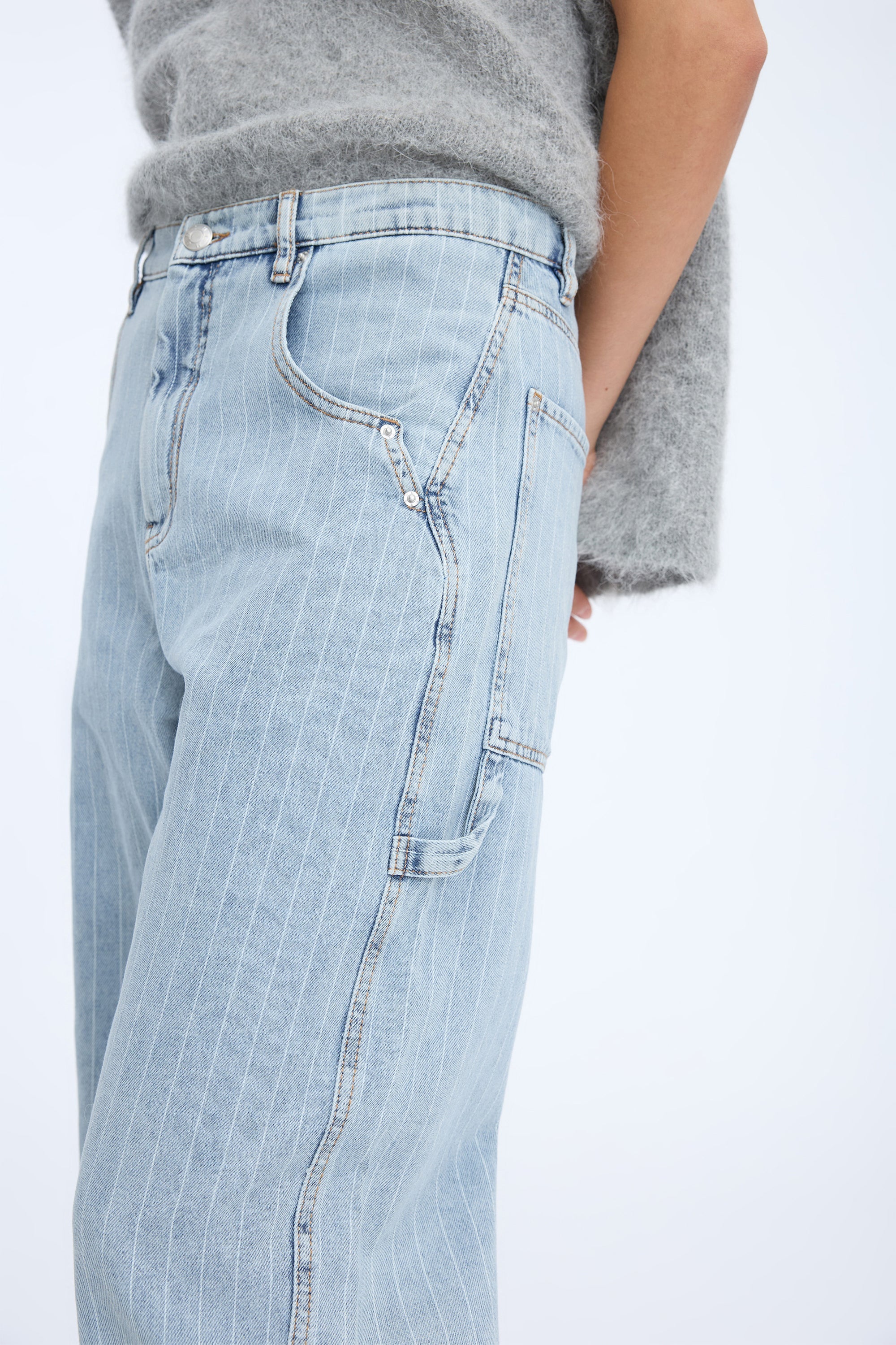 Denim pants with elegant pinstripes, oversize back pockets and cargo pants inspired details. The pants are made from 100% organic cotton.