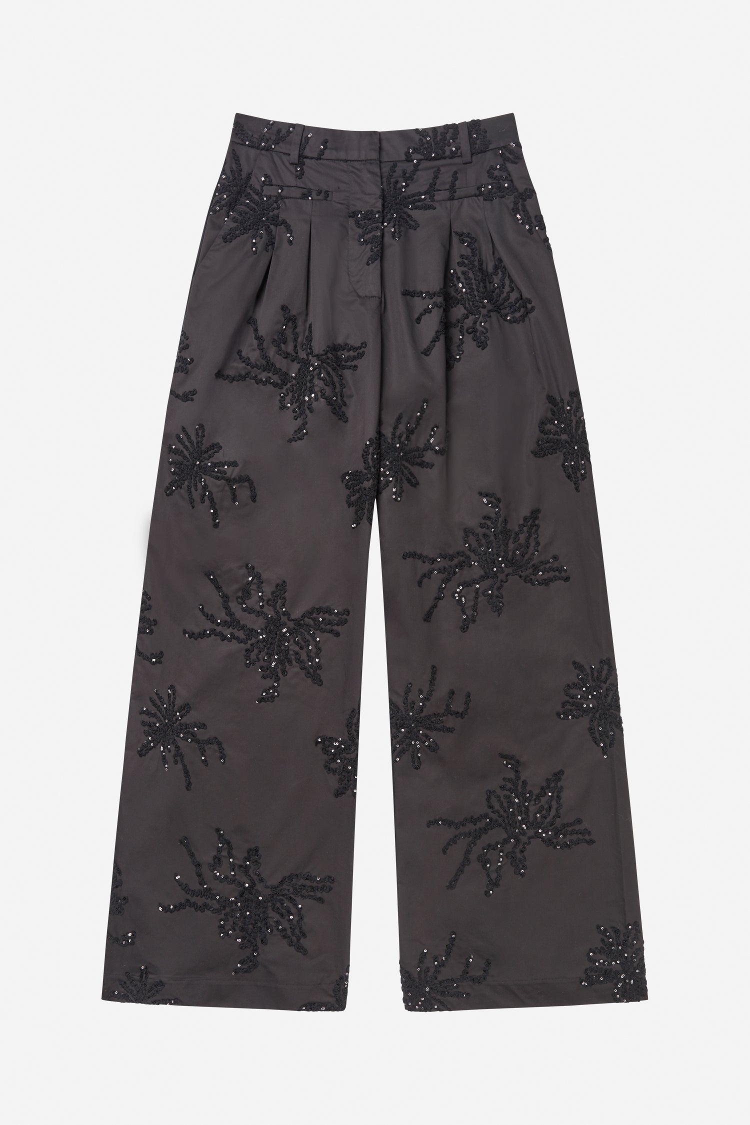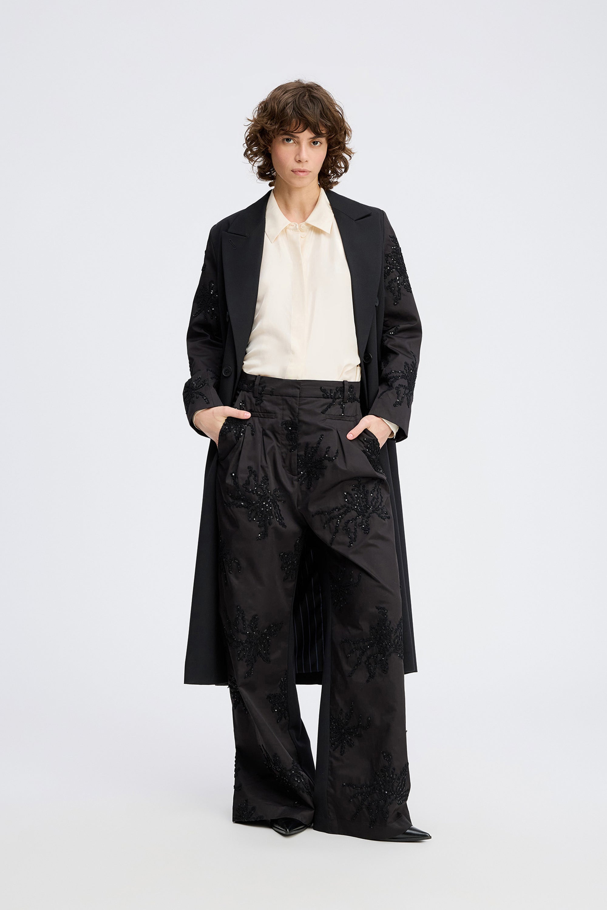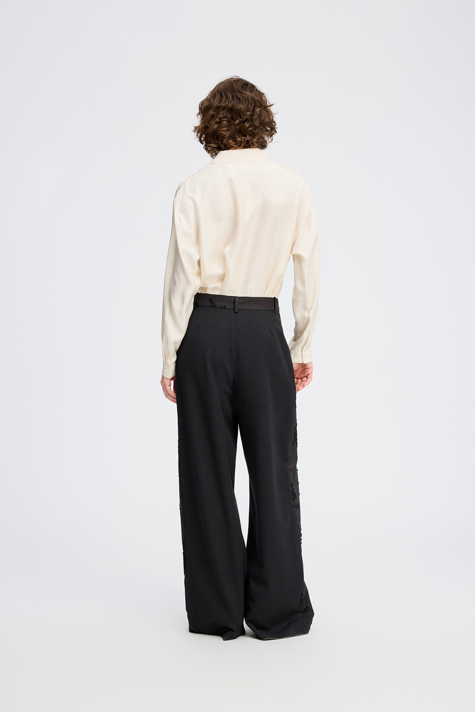 Elegant wide-leg trousers with beautiful tone-on-tone sequin and bead embroidery. Designed with a high waist, pressed creases, belt loops, and side pockets.