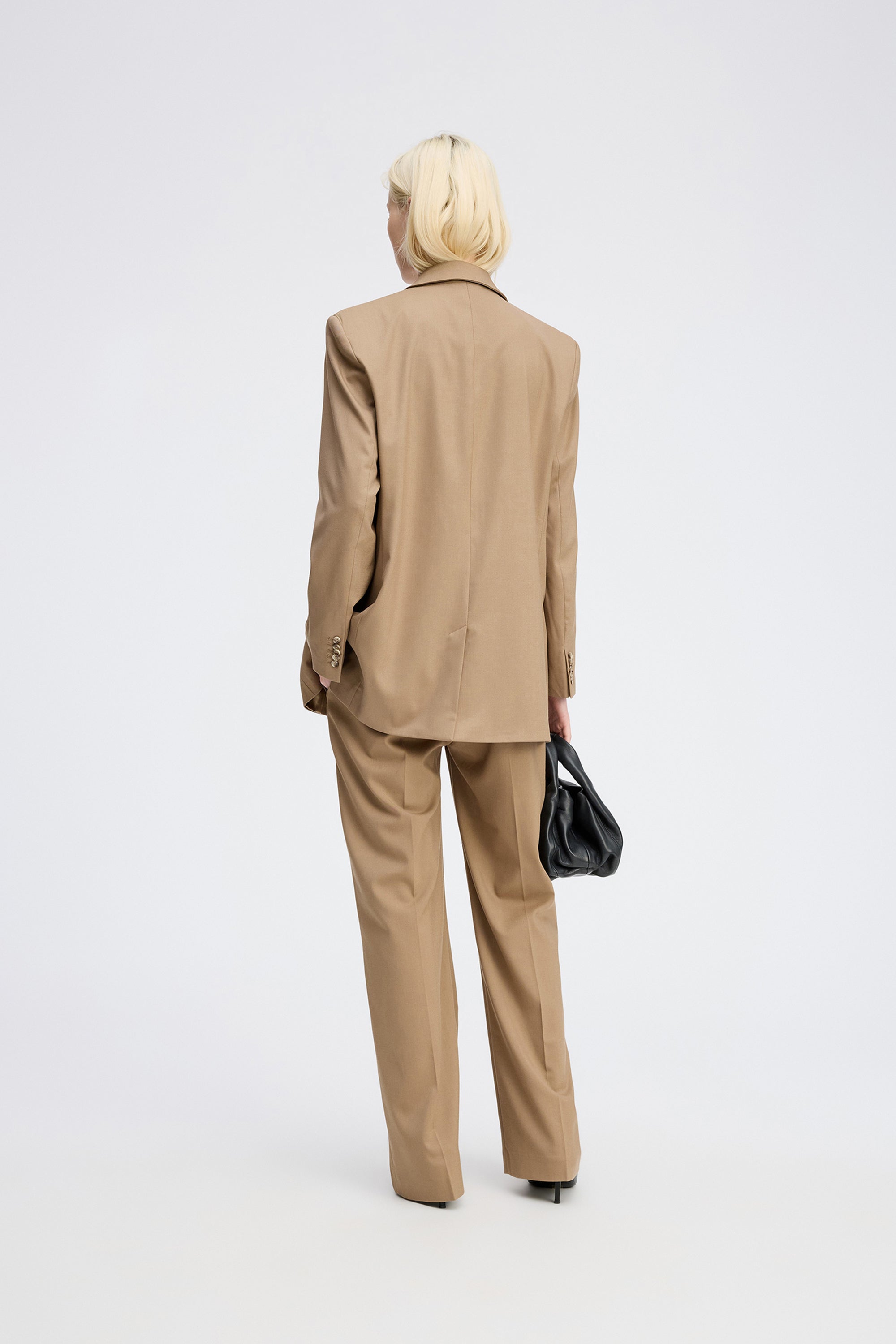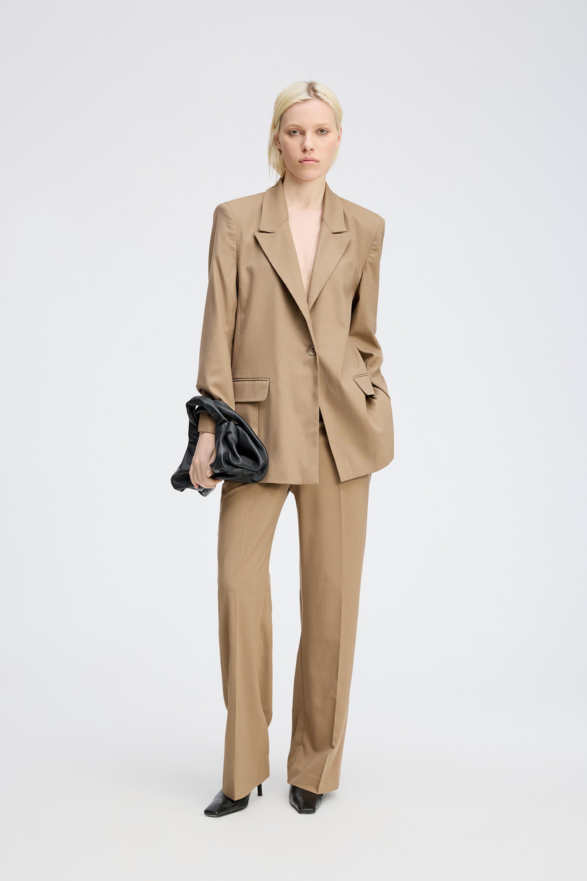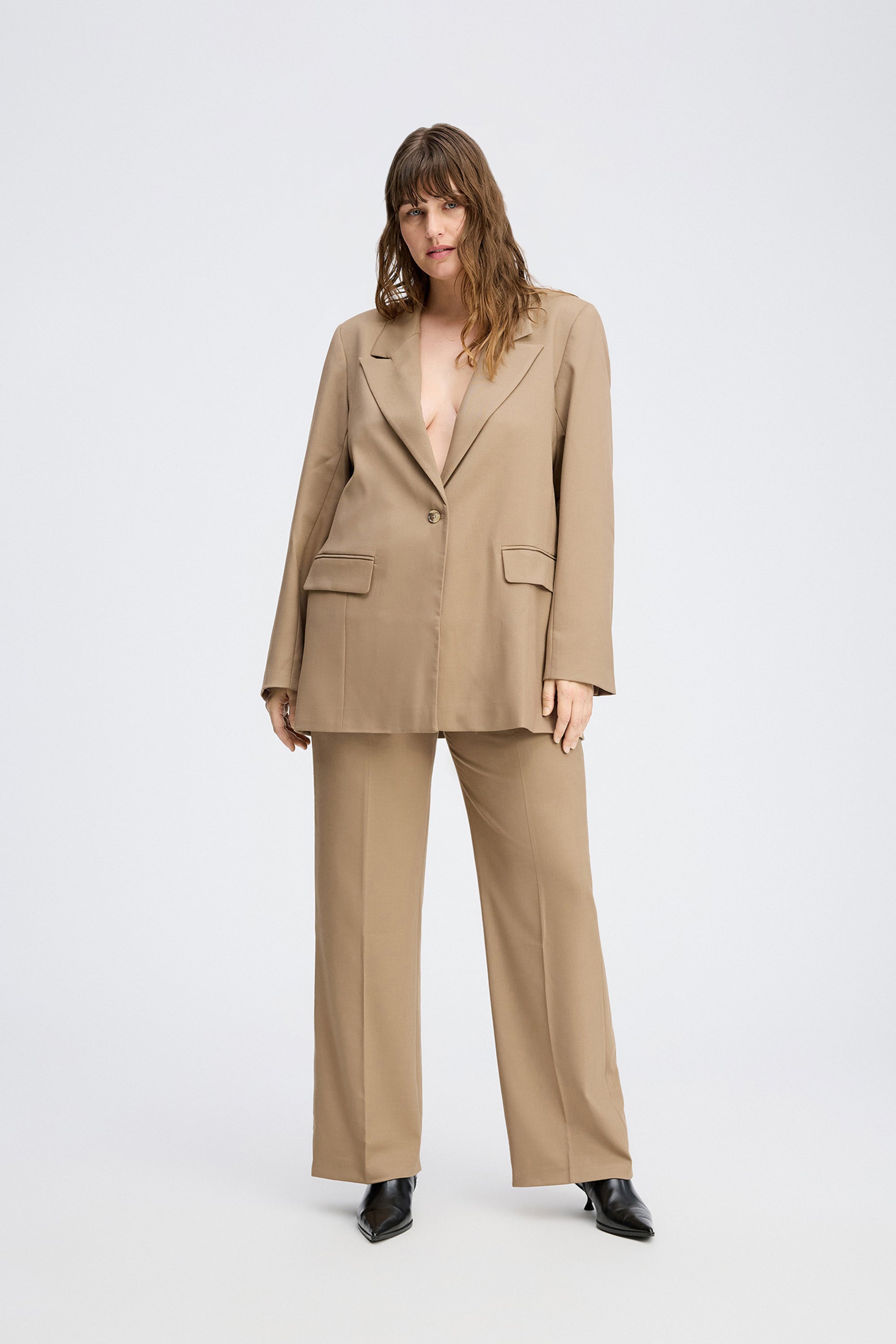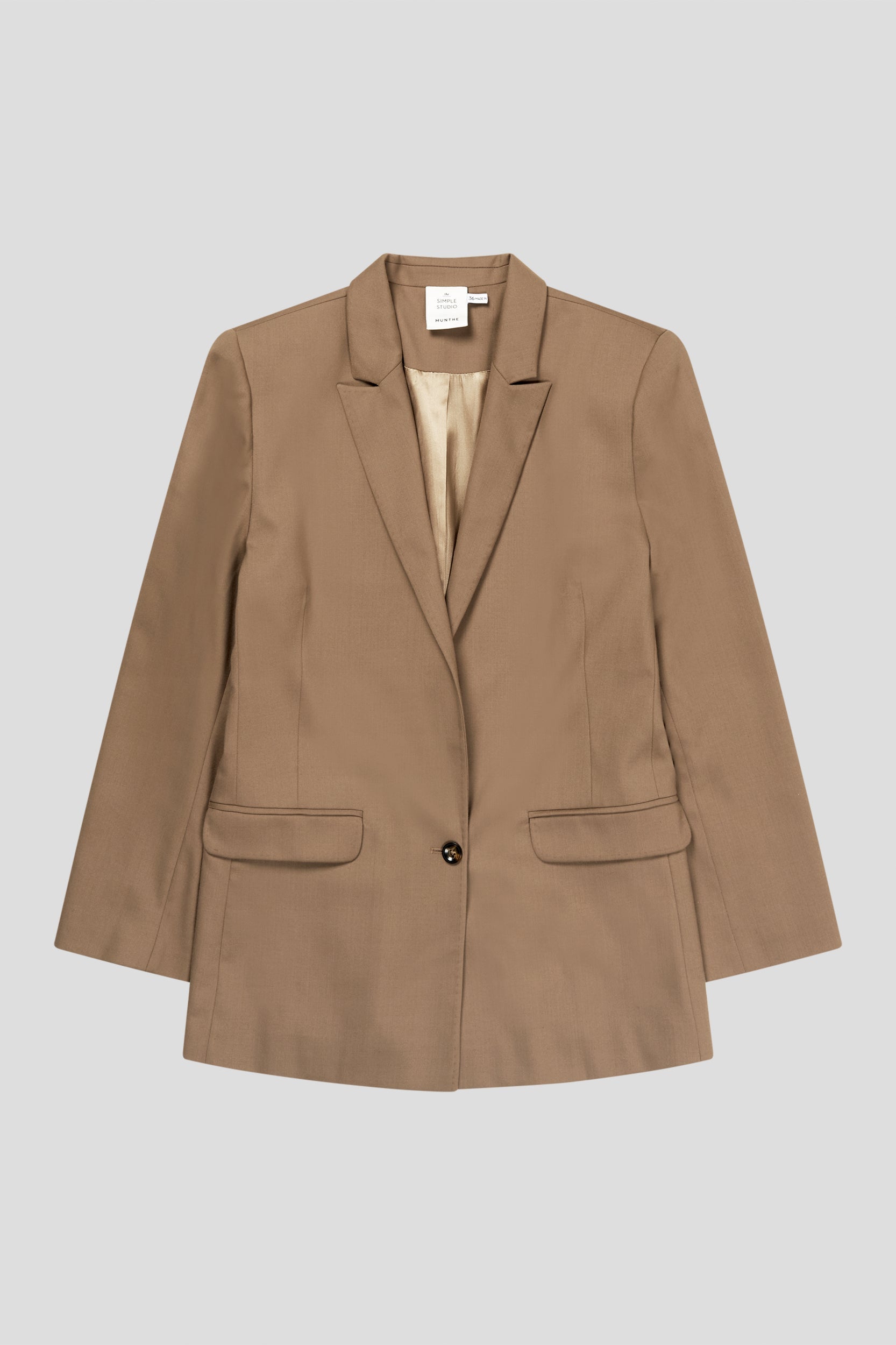 Elegant blazer in a recycled polyester and wool blend. The blazer has long sleeves with buttons on the back of the sleeve, and is designed in a regular fit with flap pockets on the front, and a one-button closure.