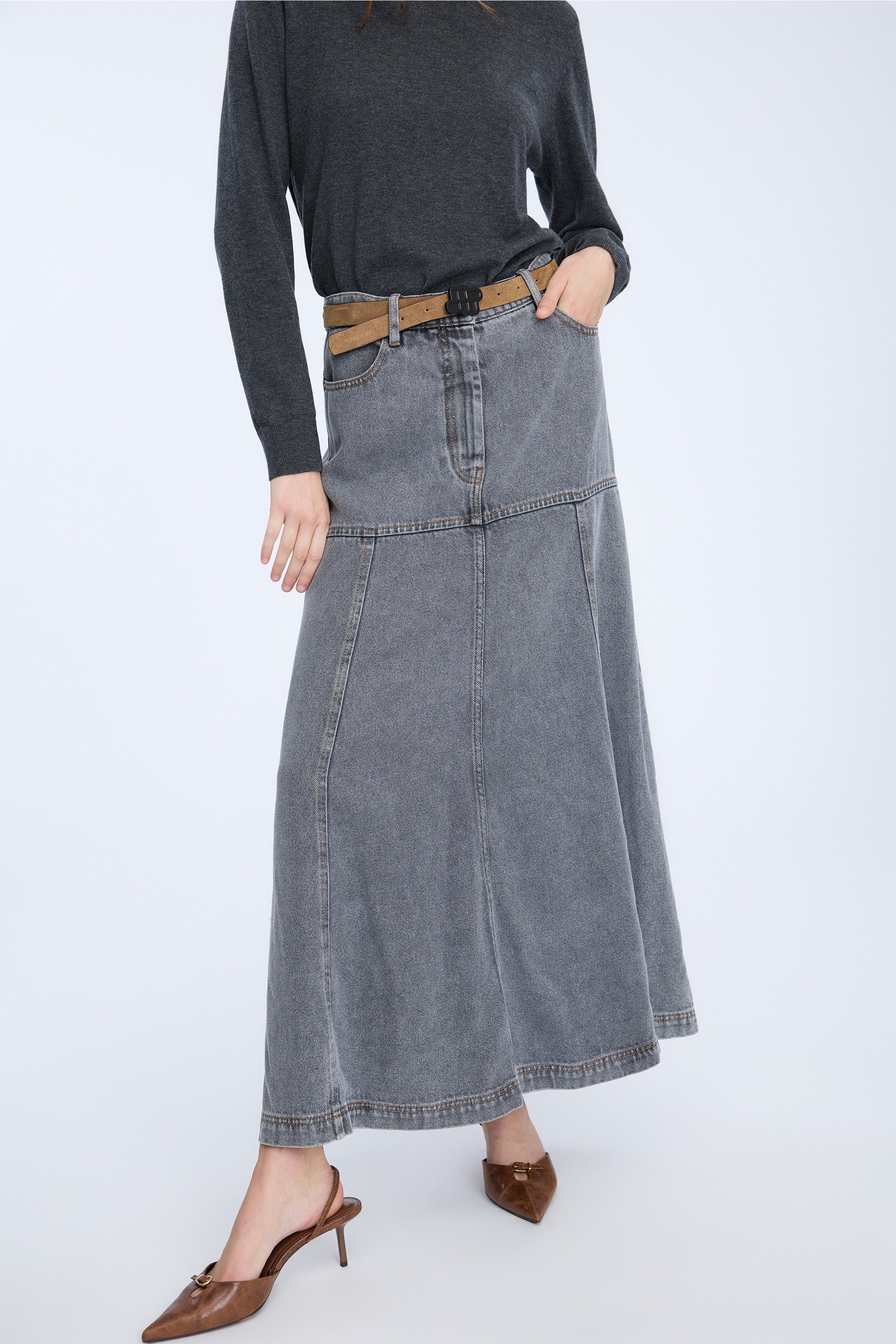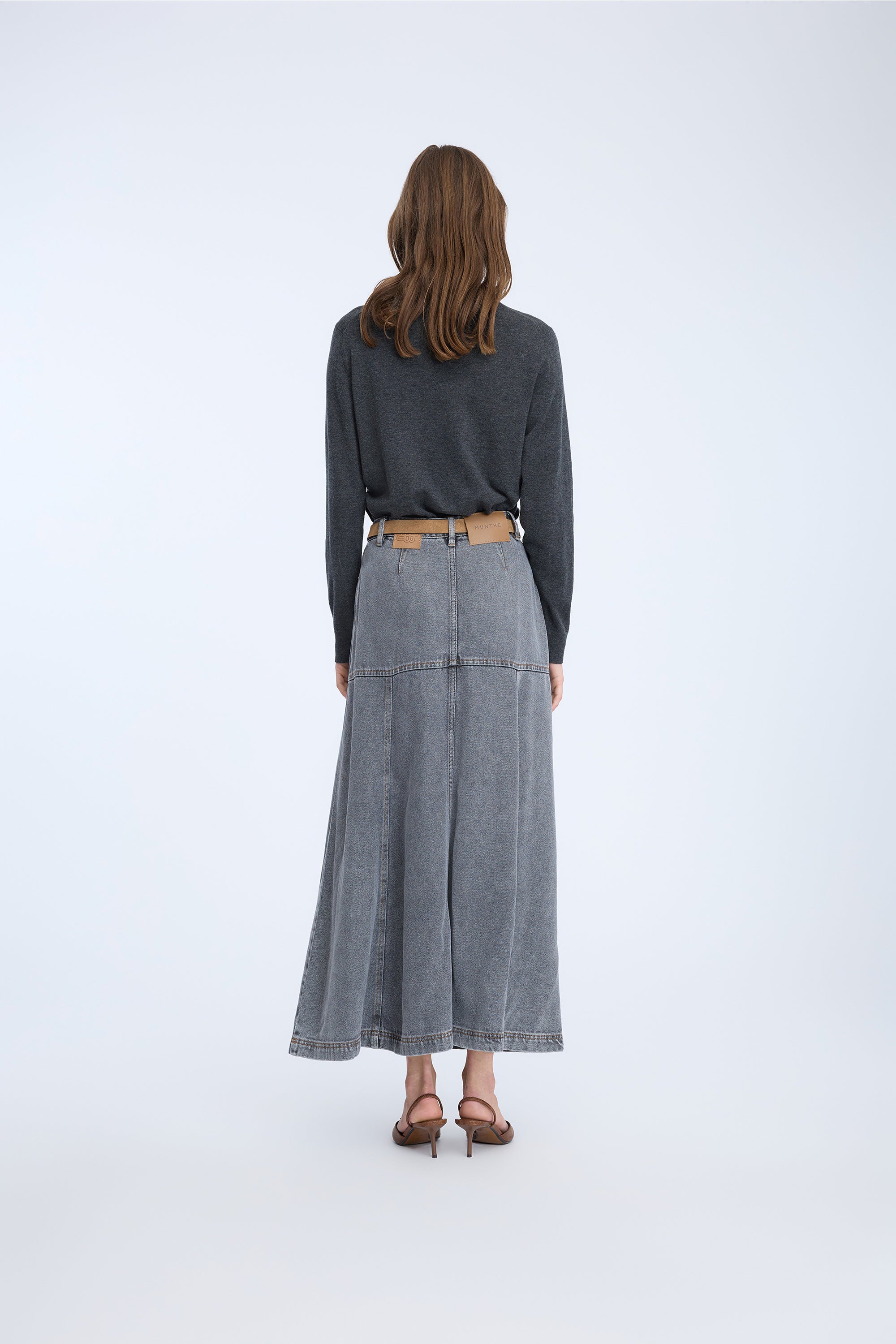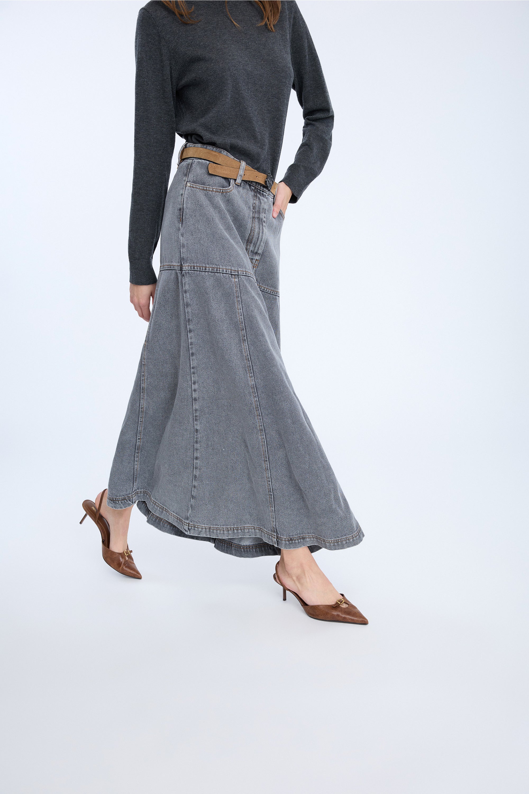 A beautiful denim skirt with a tight fit around the hips, and a contrasted flair effect from the hips and down. The skirt is designed with belt loops, pockets and has a regular fit.