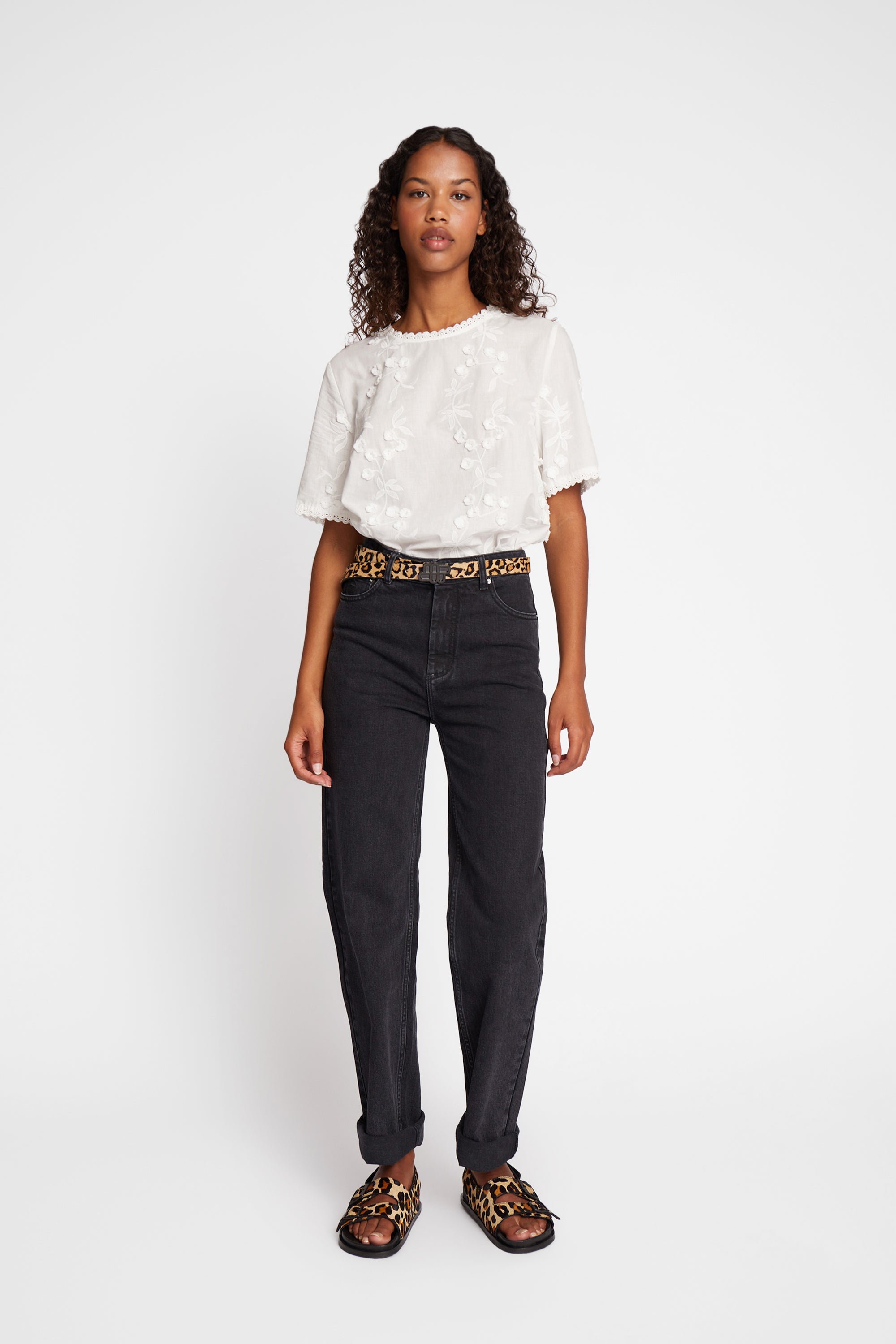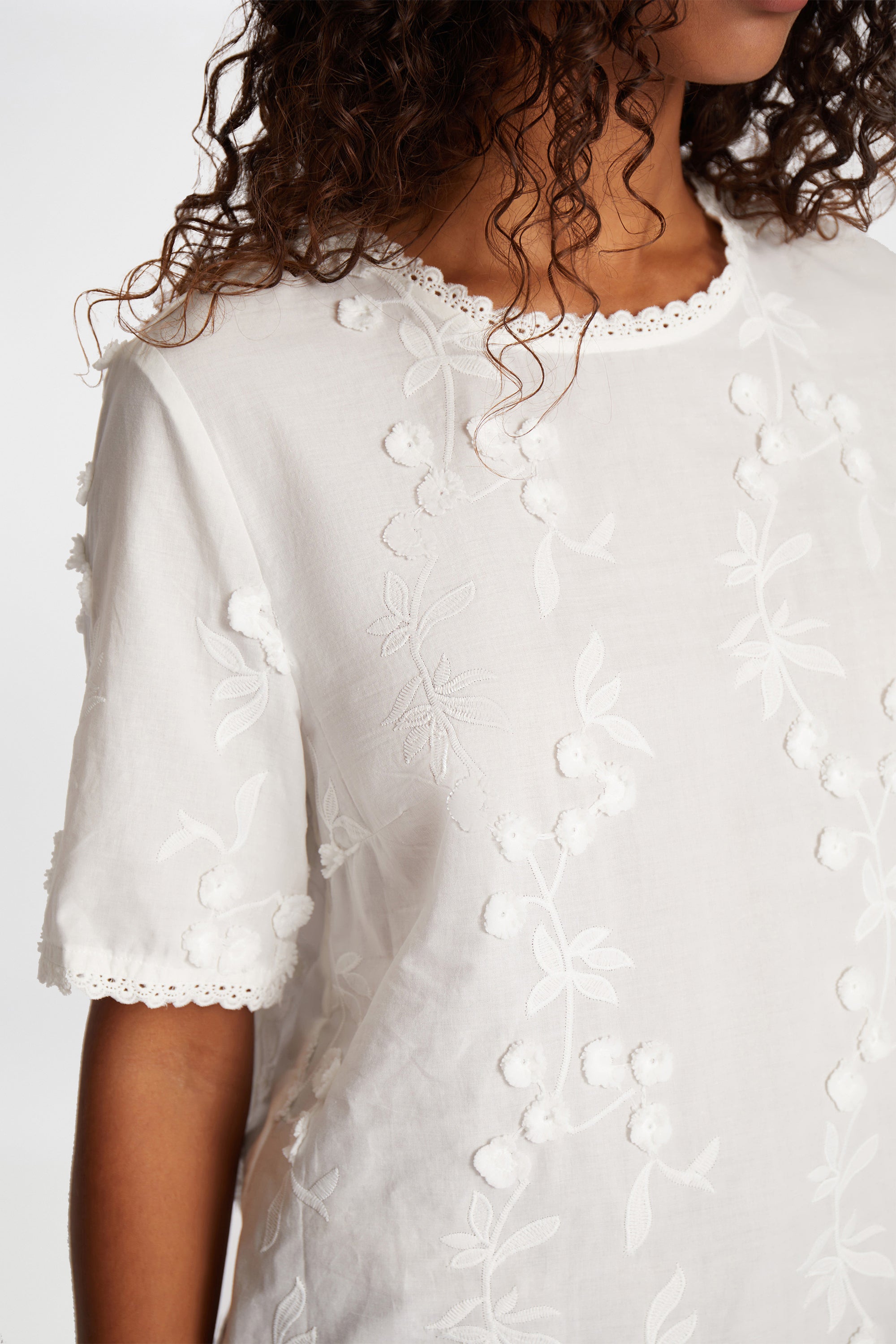 Blouse with a beautiful all-over floral embroidery, combined with fine flower appliqués. The blouse has a round neck and an elegant button closure at the neck.