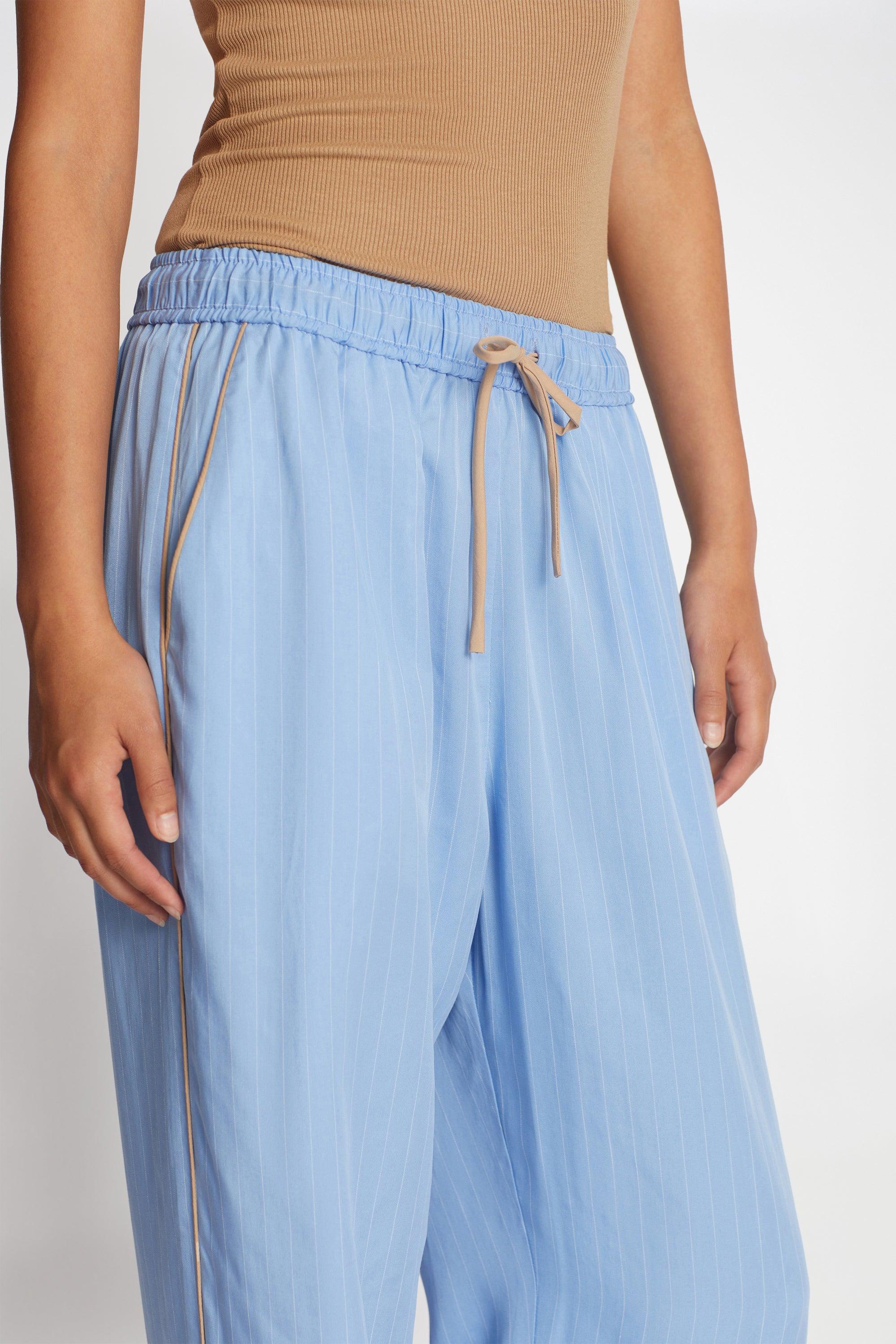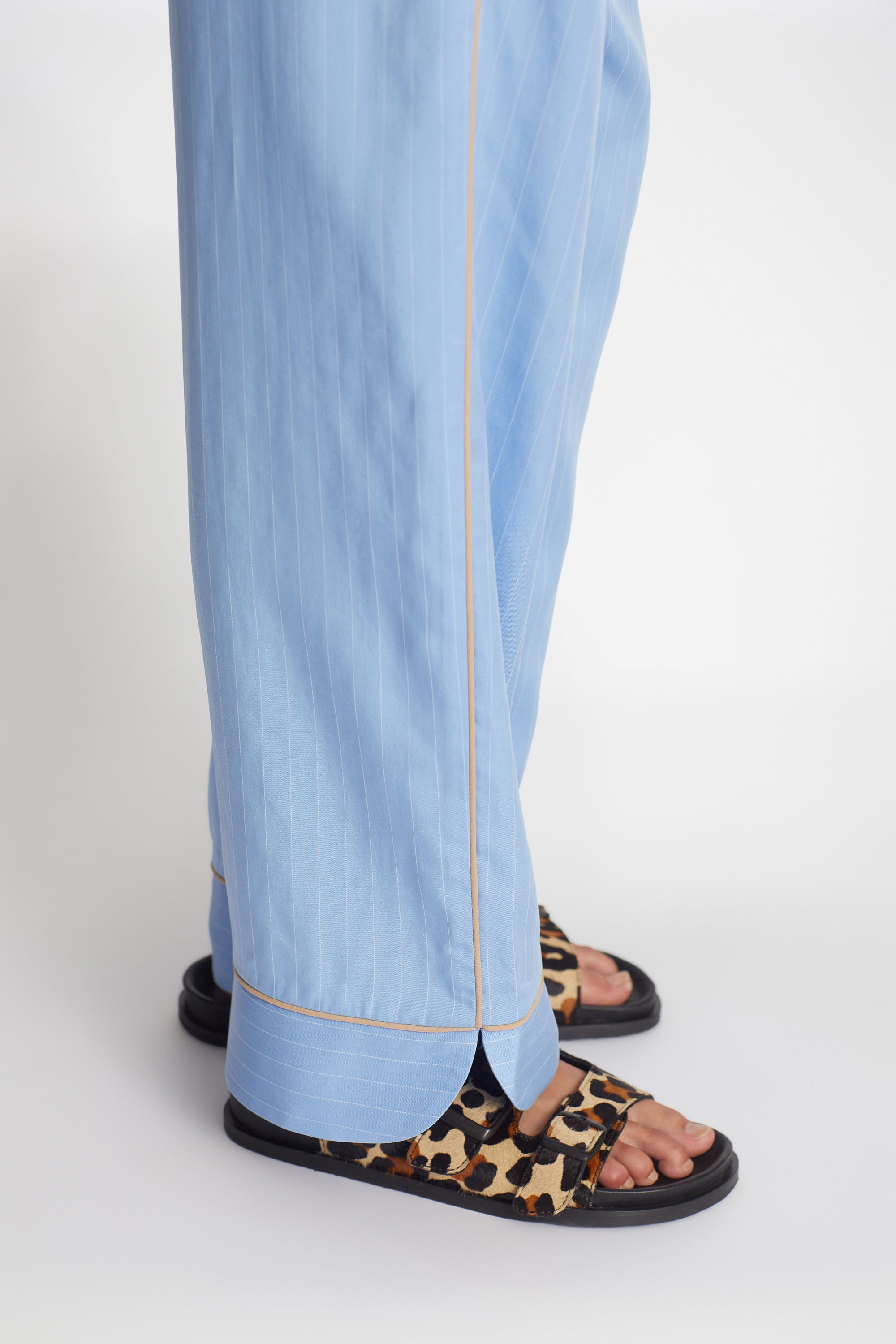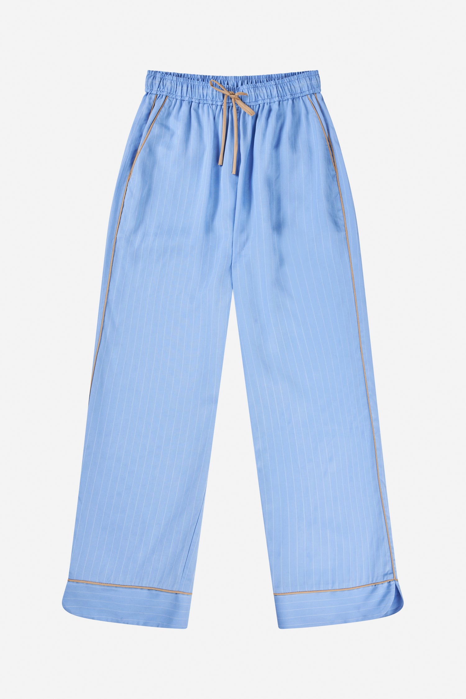 Elegant pinstriped trousers with beautiful beige piping details. The trousers have pockets and are tied with a fine tie string at the waist.